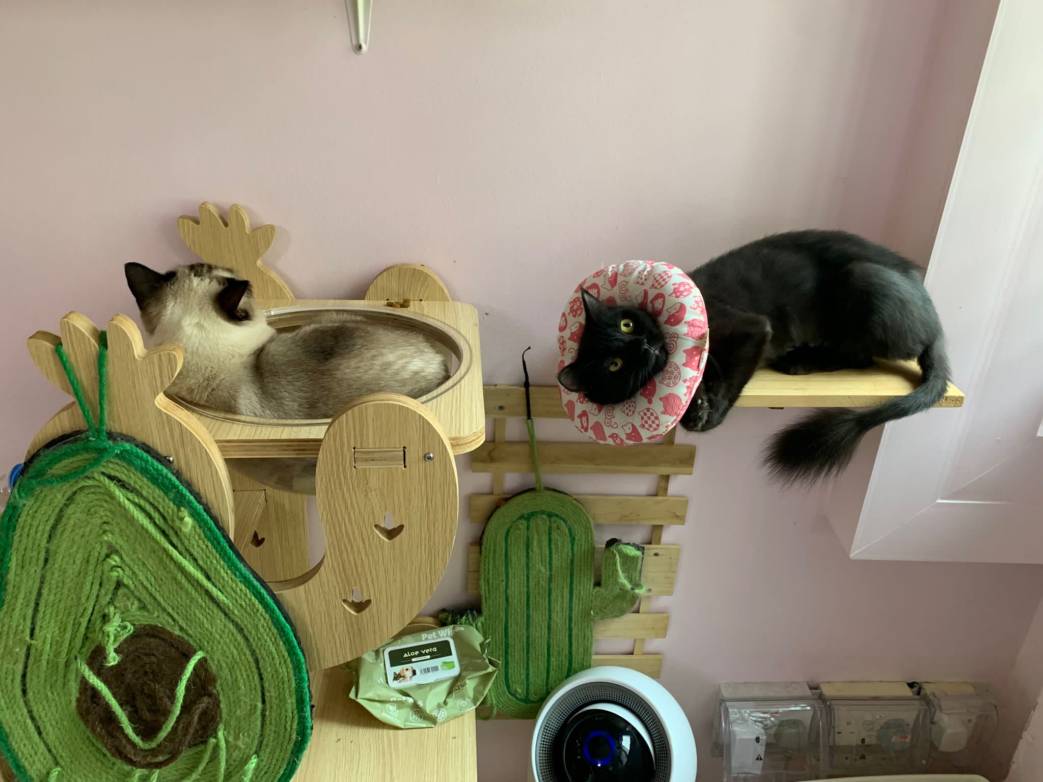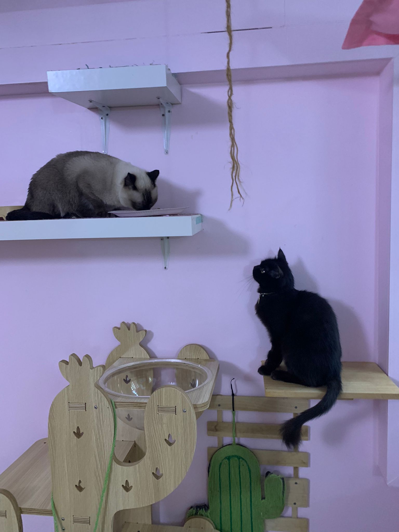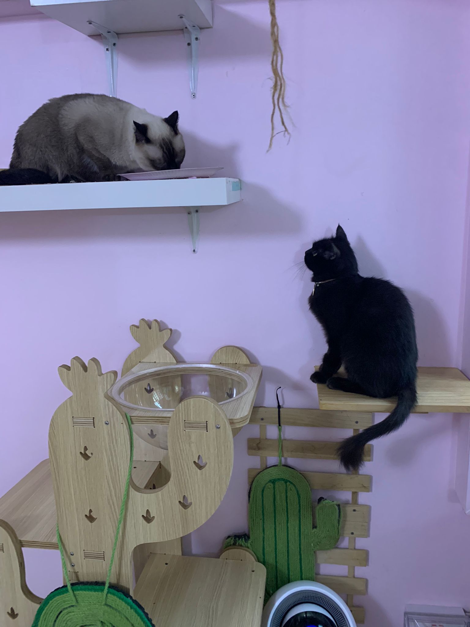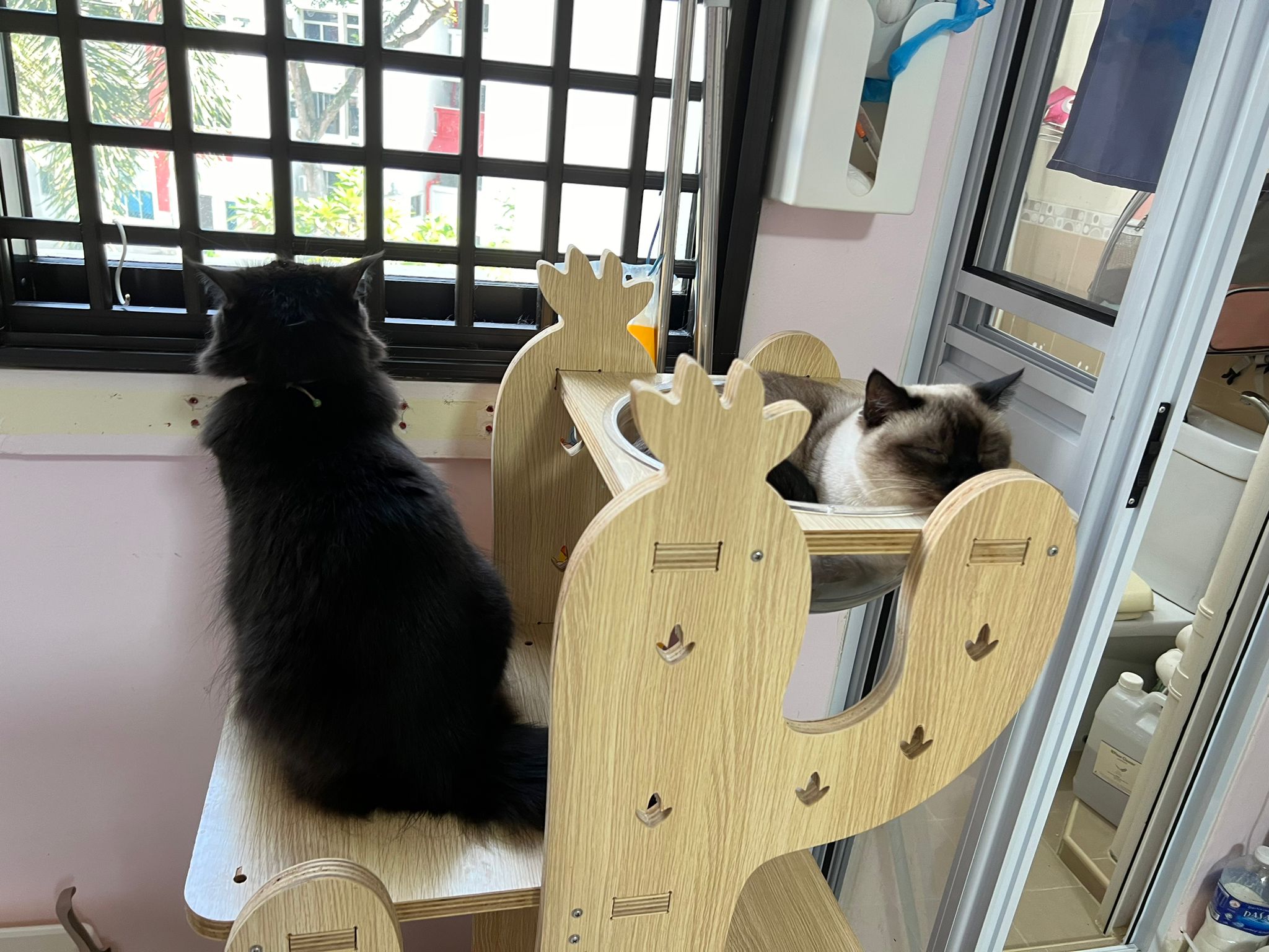 9.30am+: her cactus tree is placed in bathroom, she only got the small platform to see the world. Told her I need to do medi first. After that then she jump there to see the trees