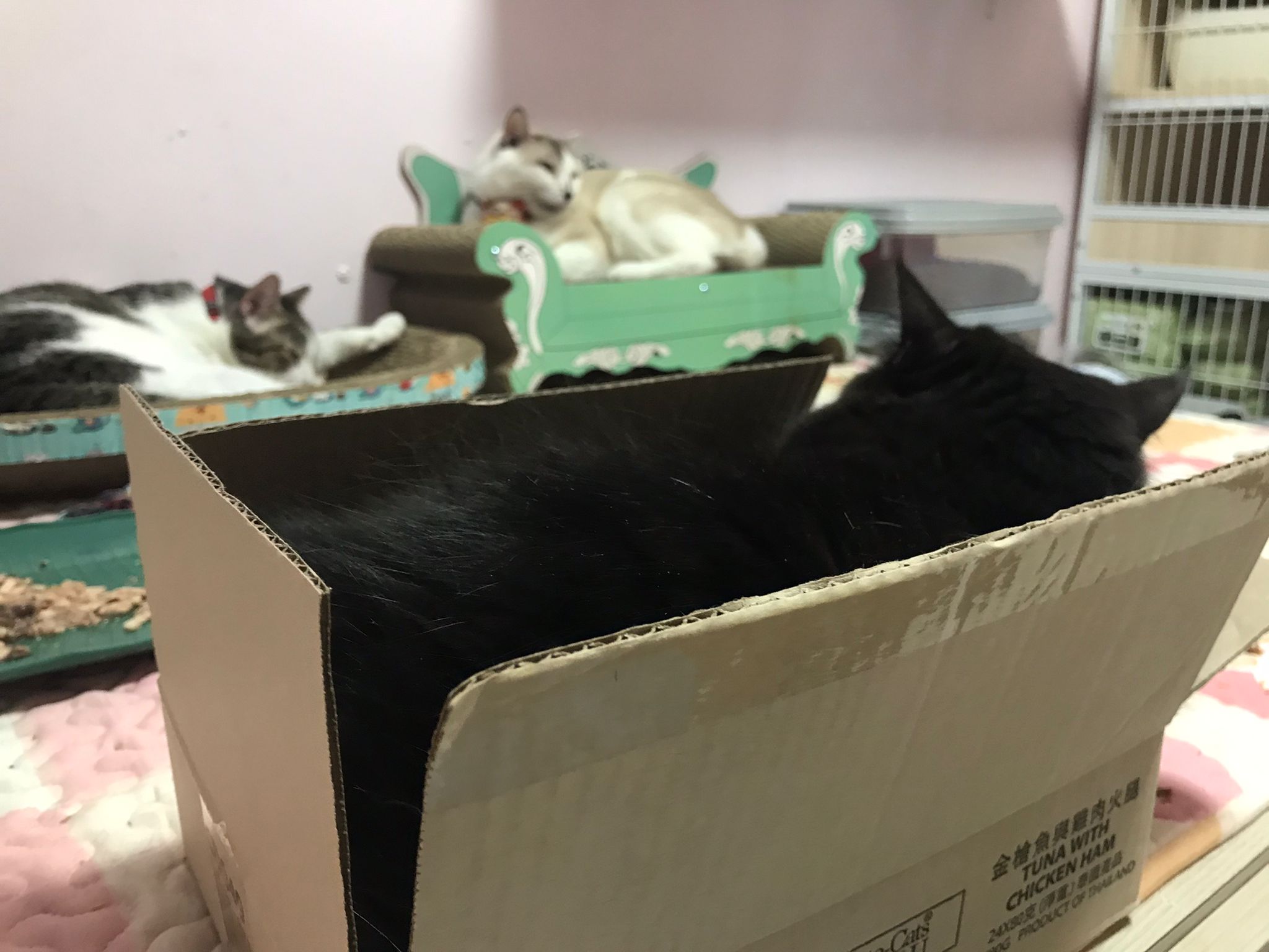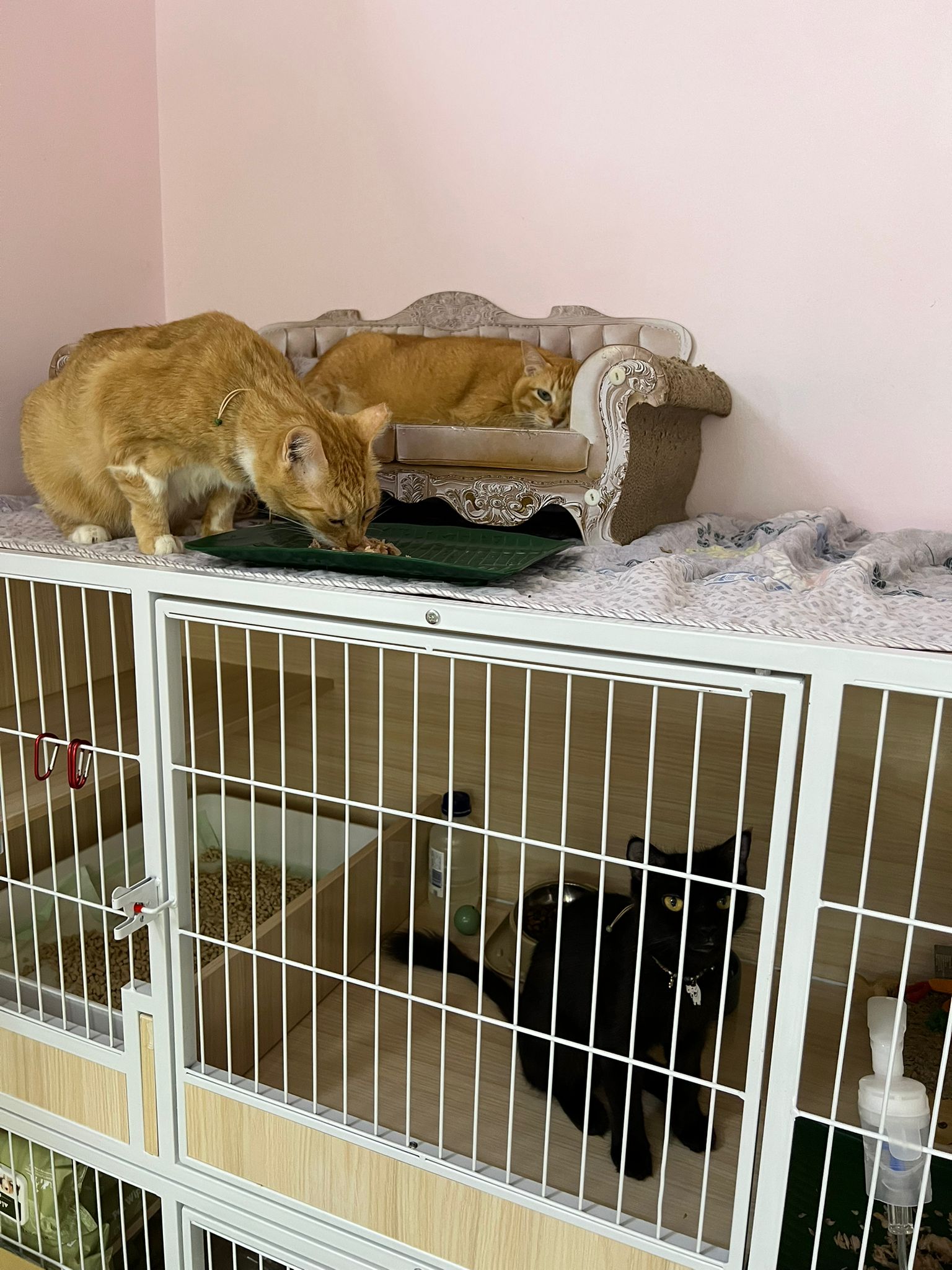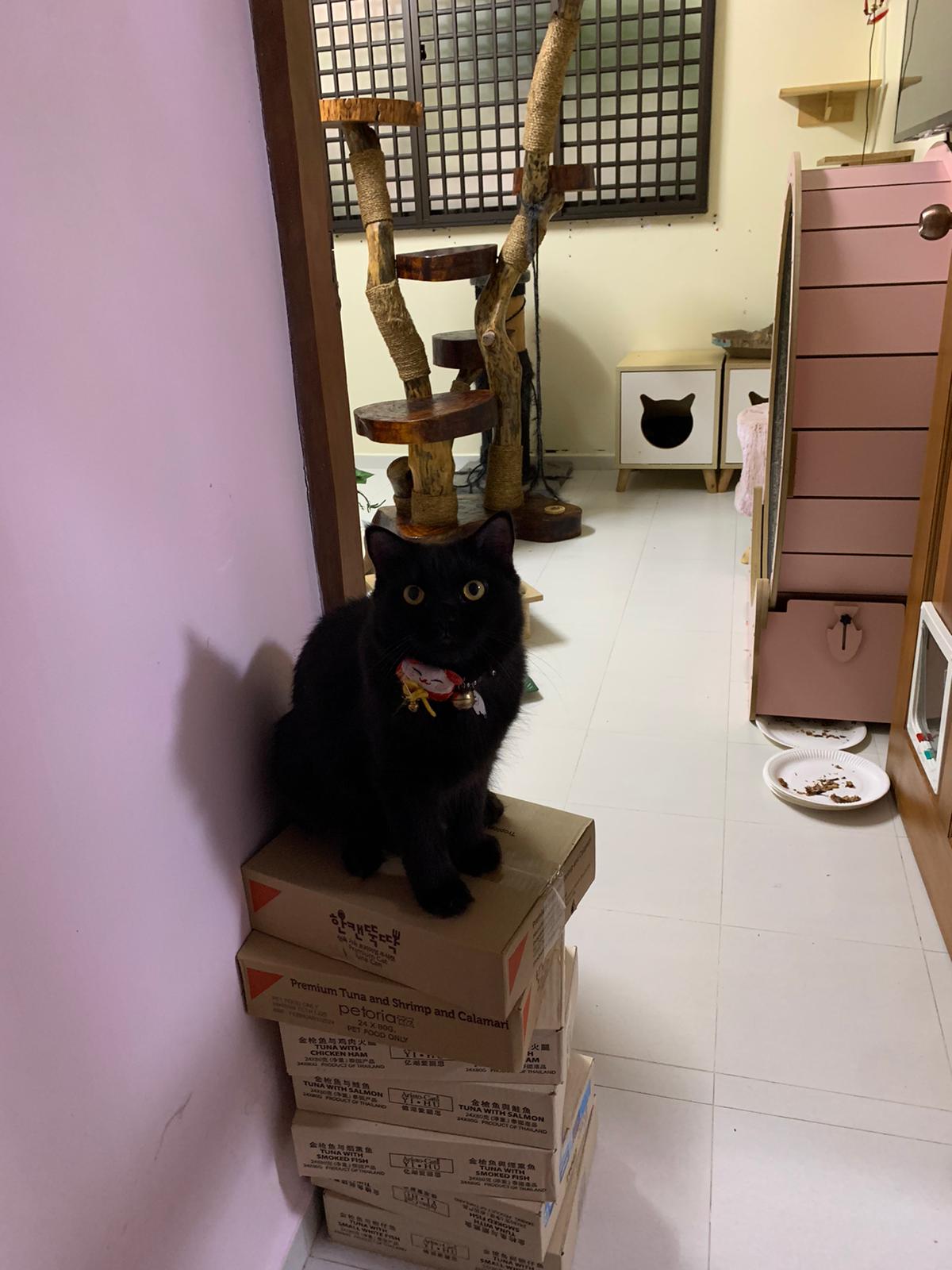 2pm+: I go back check on their well-being. Open her cage to let her roam. She did jump down but she jump back. Ah boy went to her cage to laze ard. She is ok but she did hiss also. Not fighter la. Close cage when I left. Told her Tmr onwards free roam once I see safe poo. She did eat as normal alr. Can pee normally