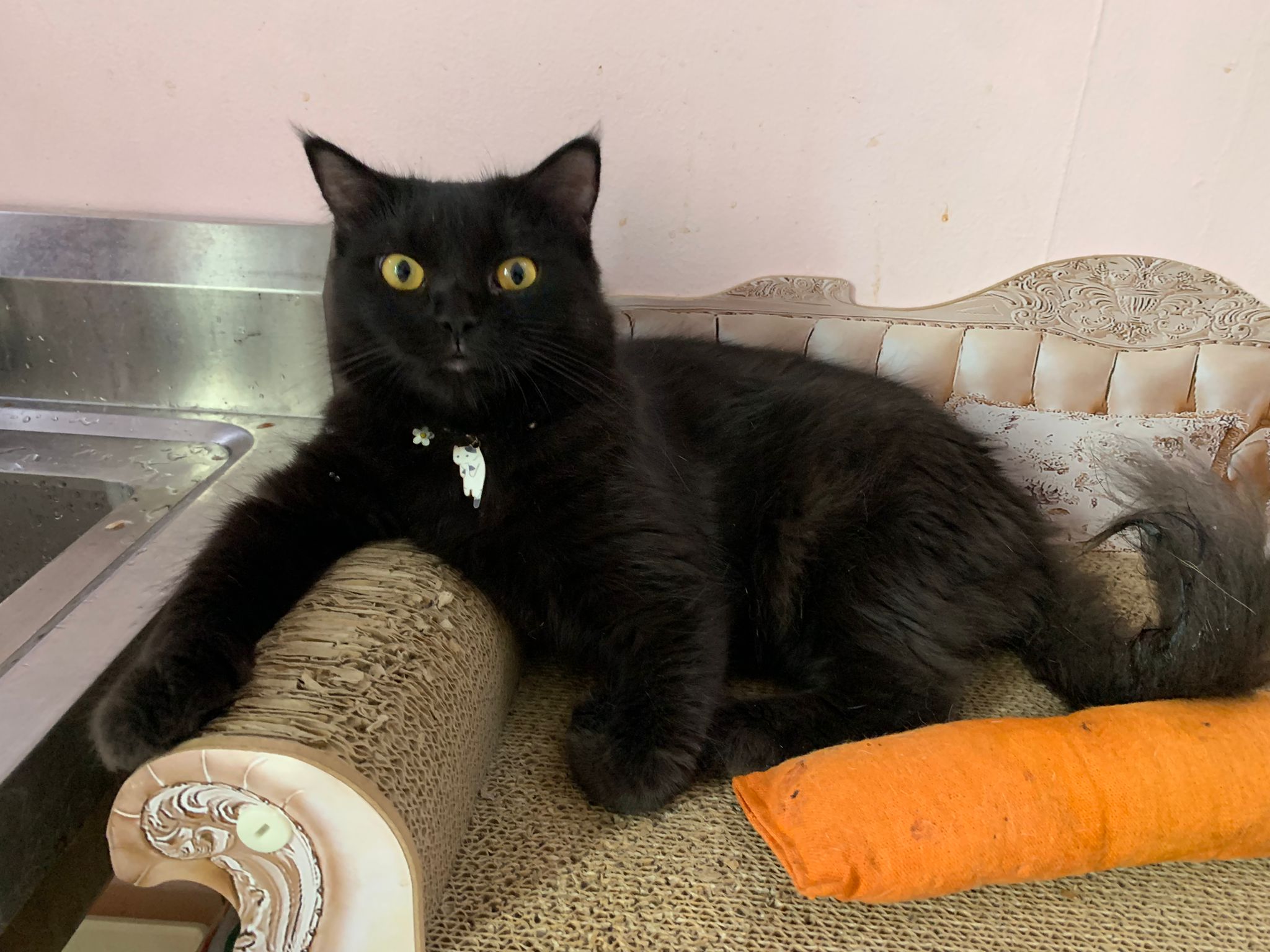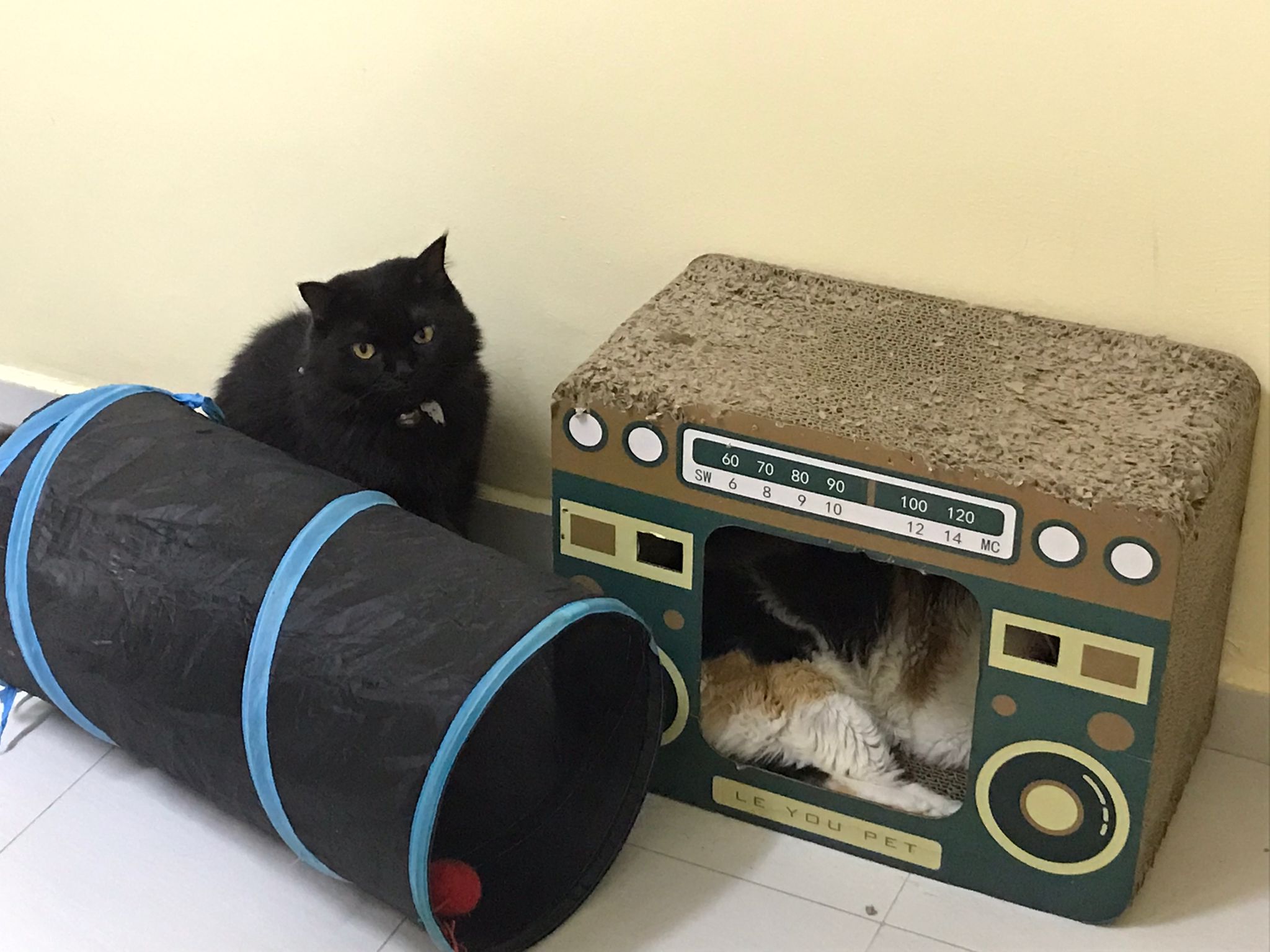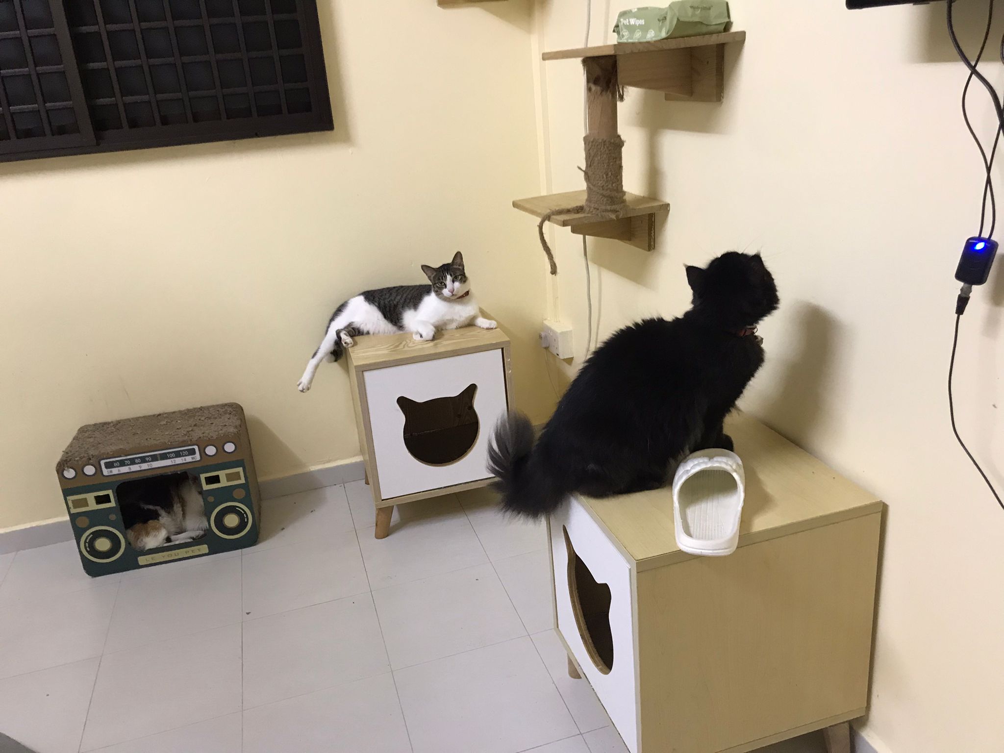 2pm+: I go back check on their well-being. Open her cage to let her roam. She did jump down but she jump back. Ah boy went to her cage to laze ard. She is ok but she did hiss also. Not fighter la. Close cage when I left. Told her Tmr onwards free roam once I see safe poo. She did eat as normal alr. Can pee normally
