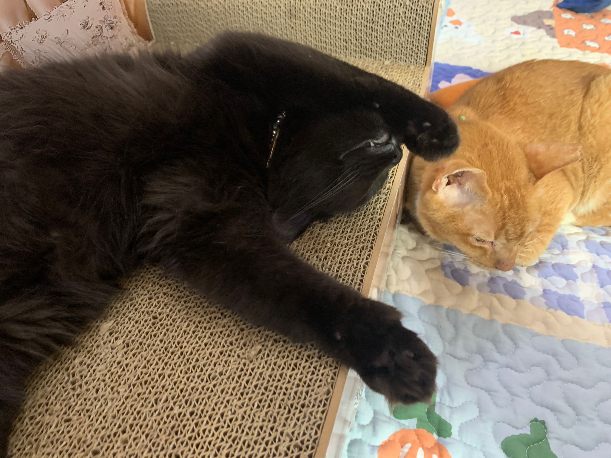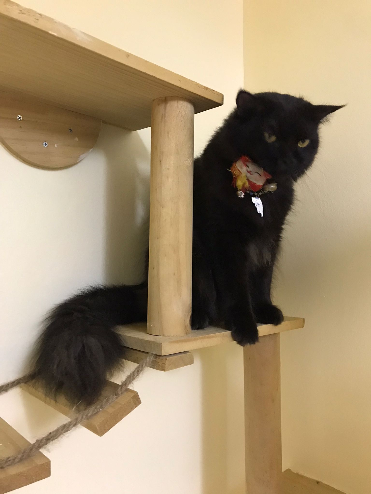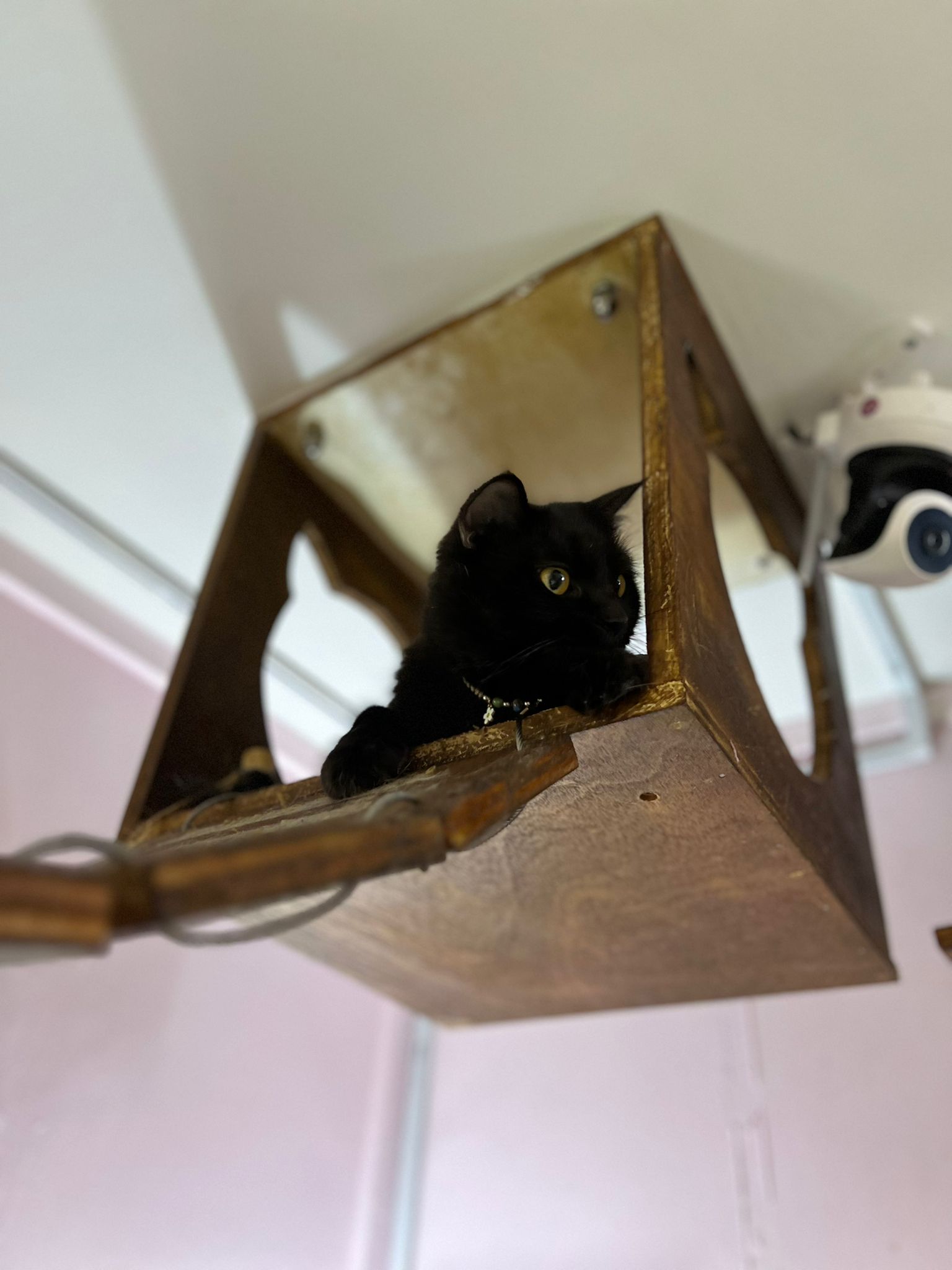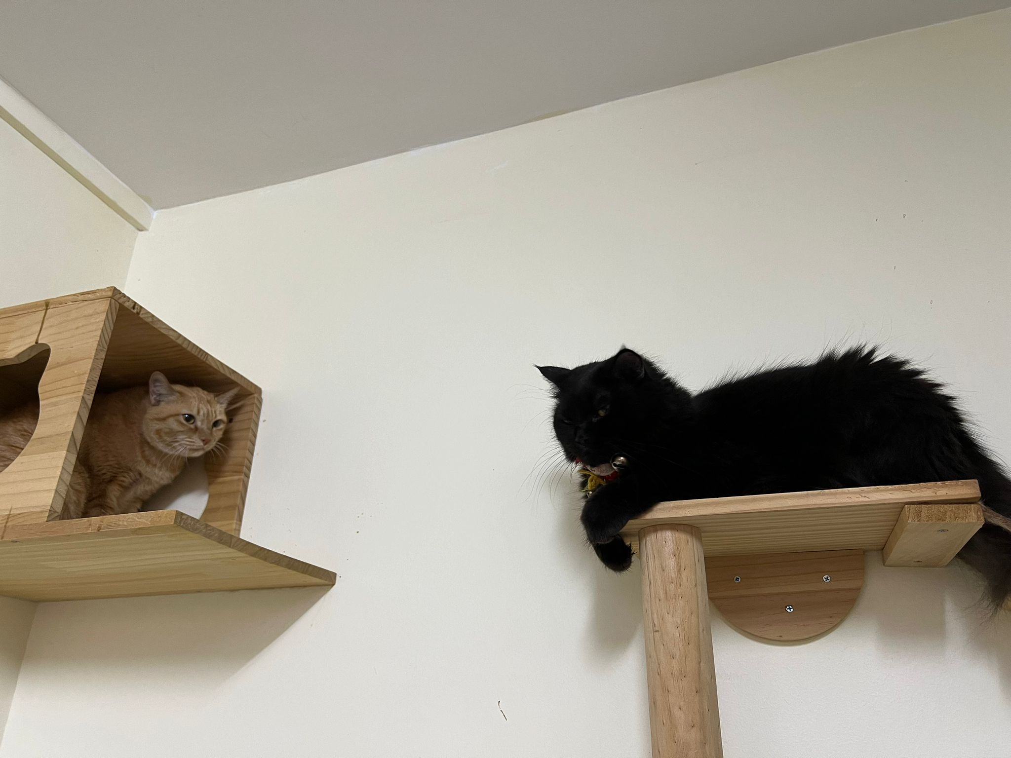 Morning: carry to big bed platform to laze w the jiejie n she jump back to the cage. Let her be.