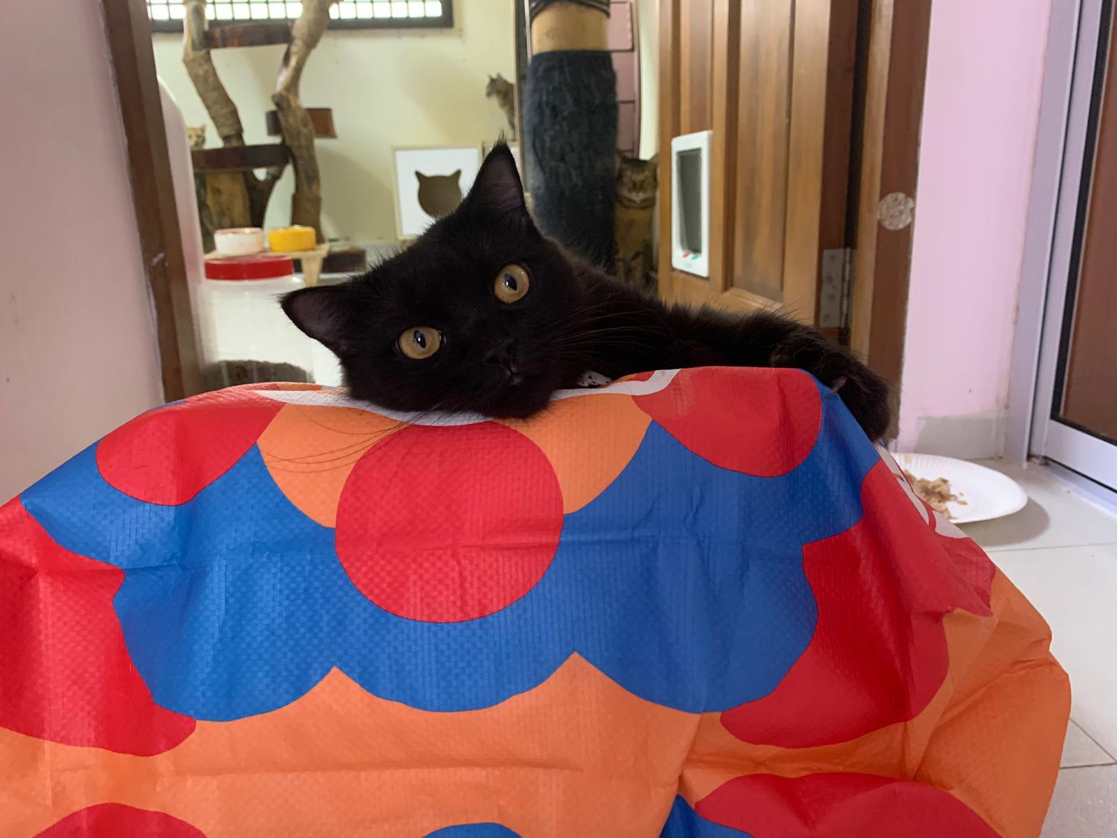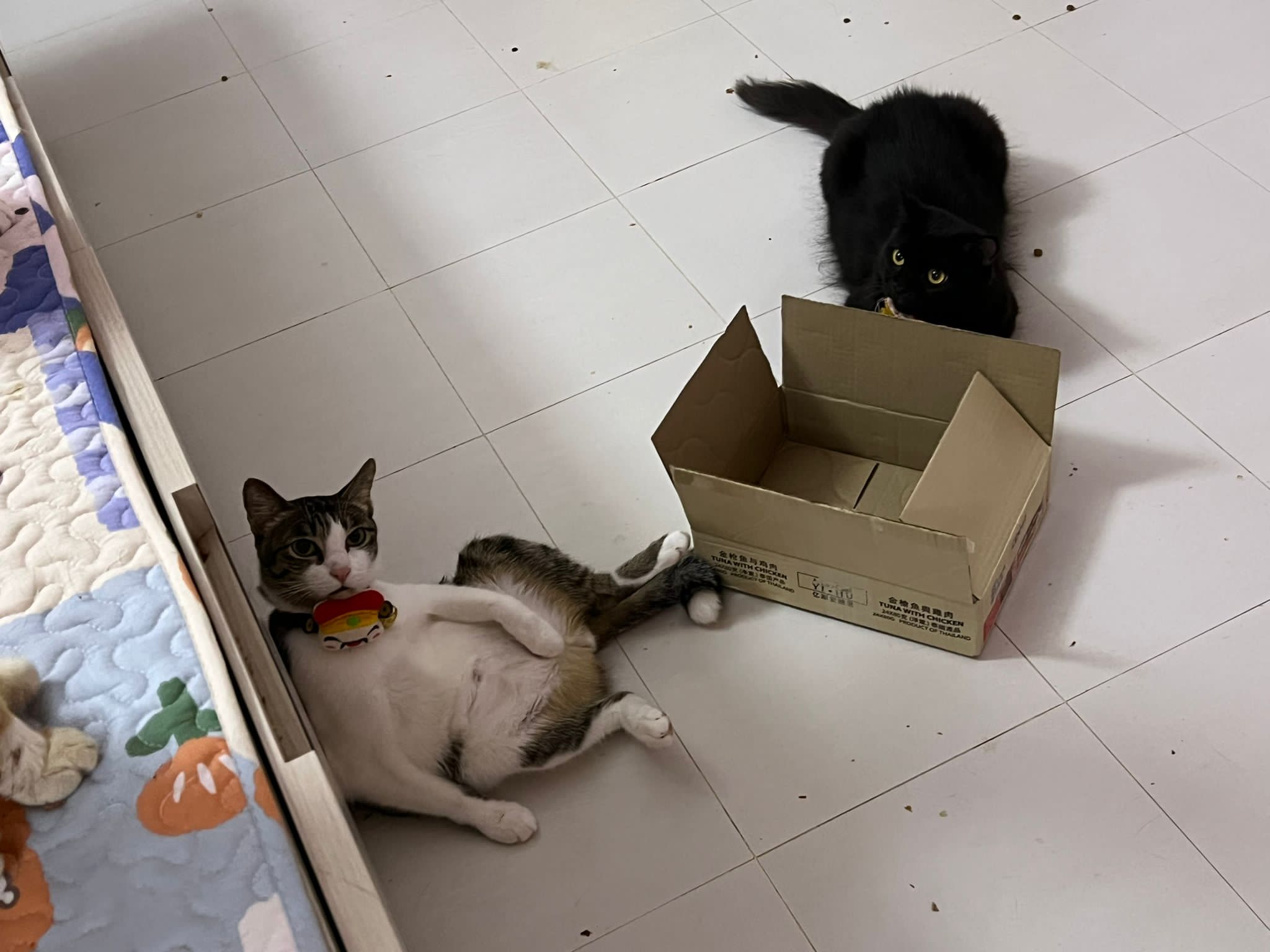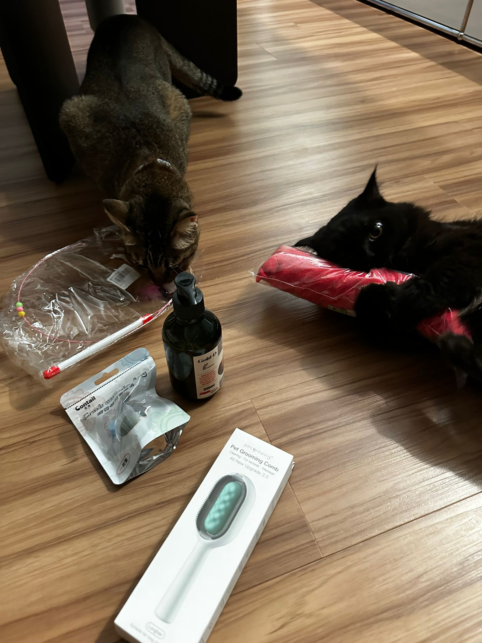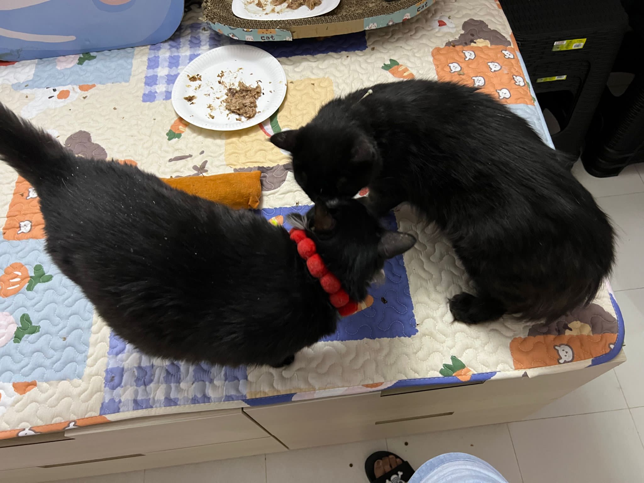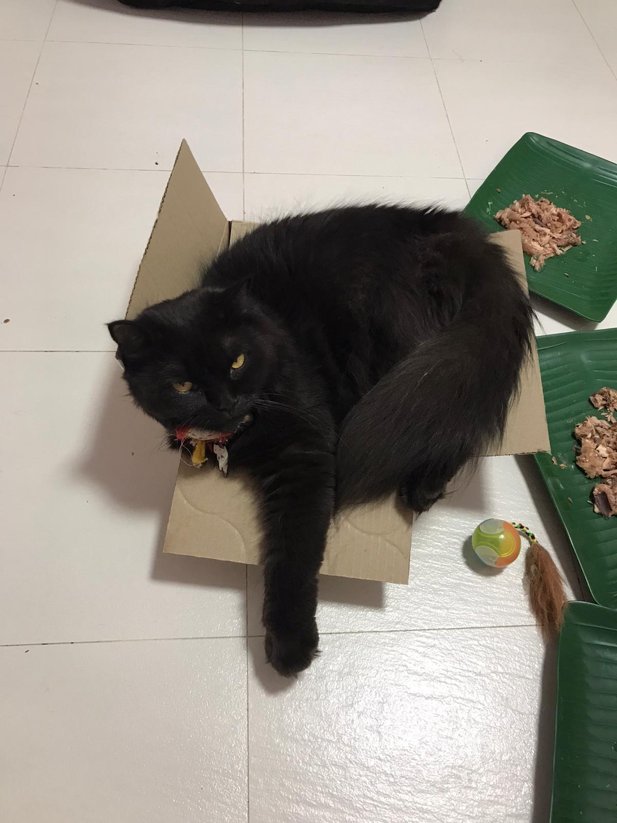 Party end and mama send me photo of Carrara and riri w their presents. “Carrara and riri love their new toys 😅 especially Carrara and the cat nip pillow haha. Thank you for the gifts!” – ha Cara hugging the red pillow, plastic not even taken yet loh