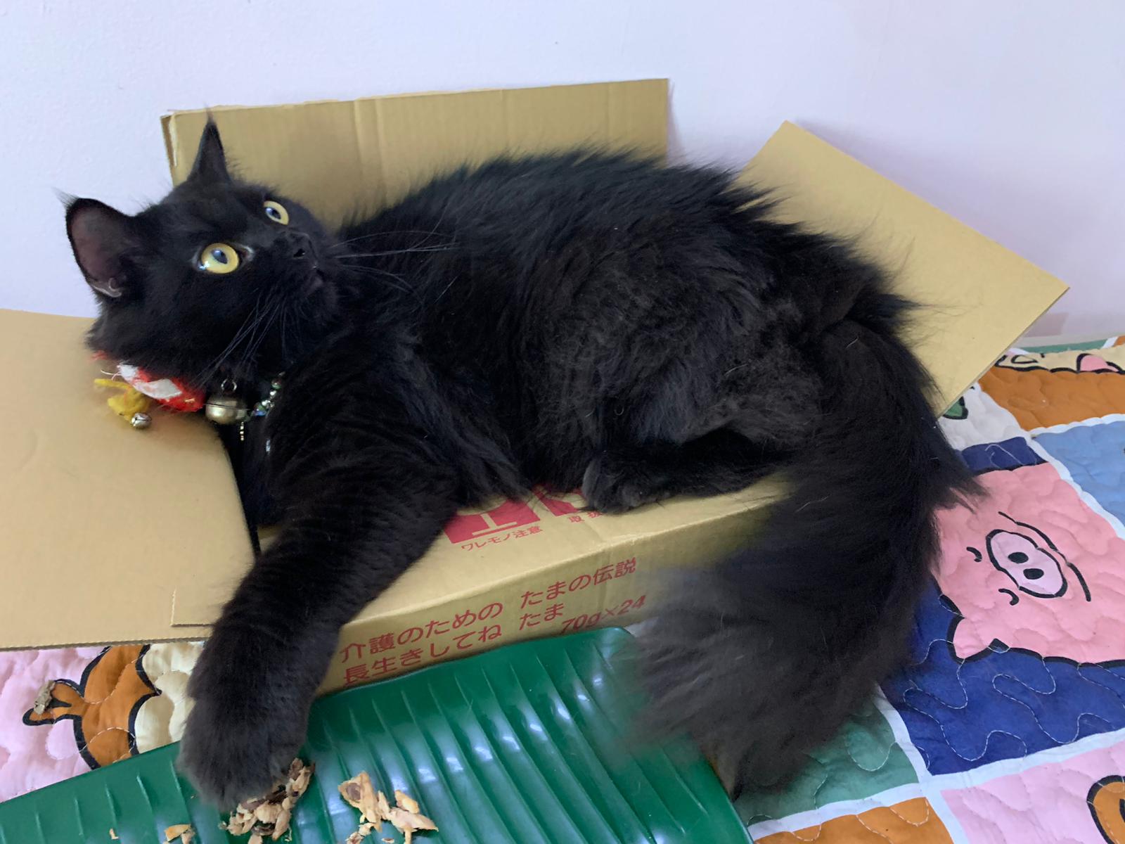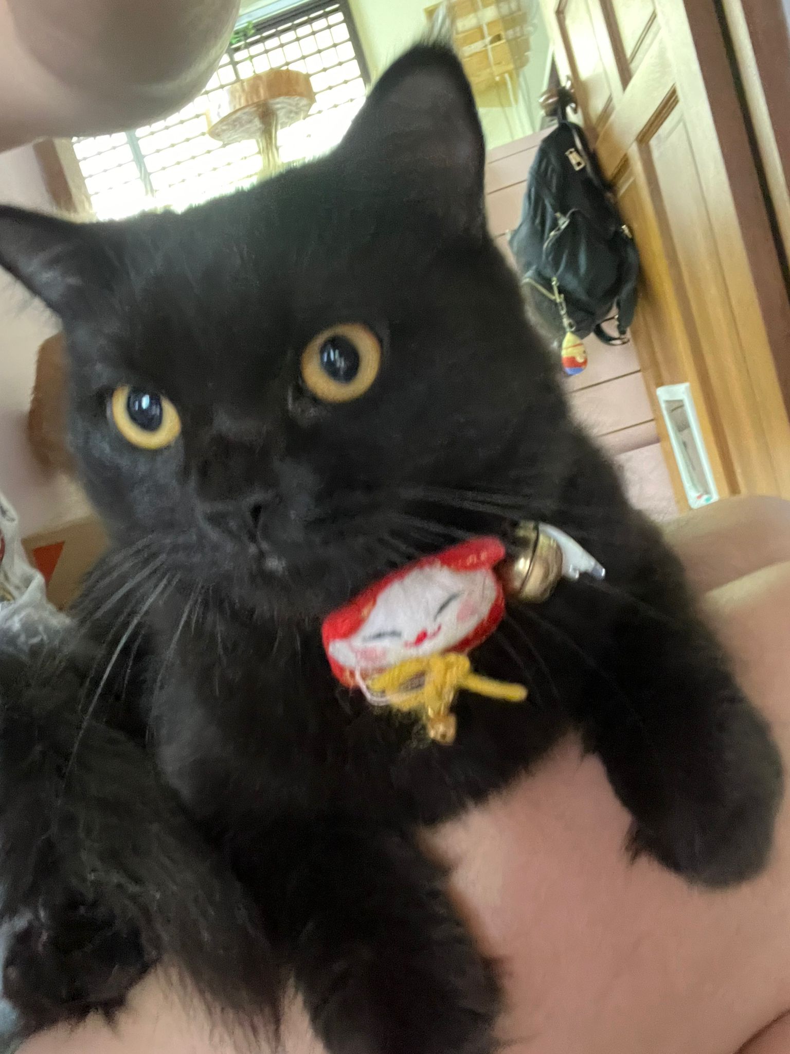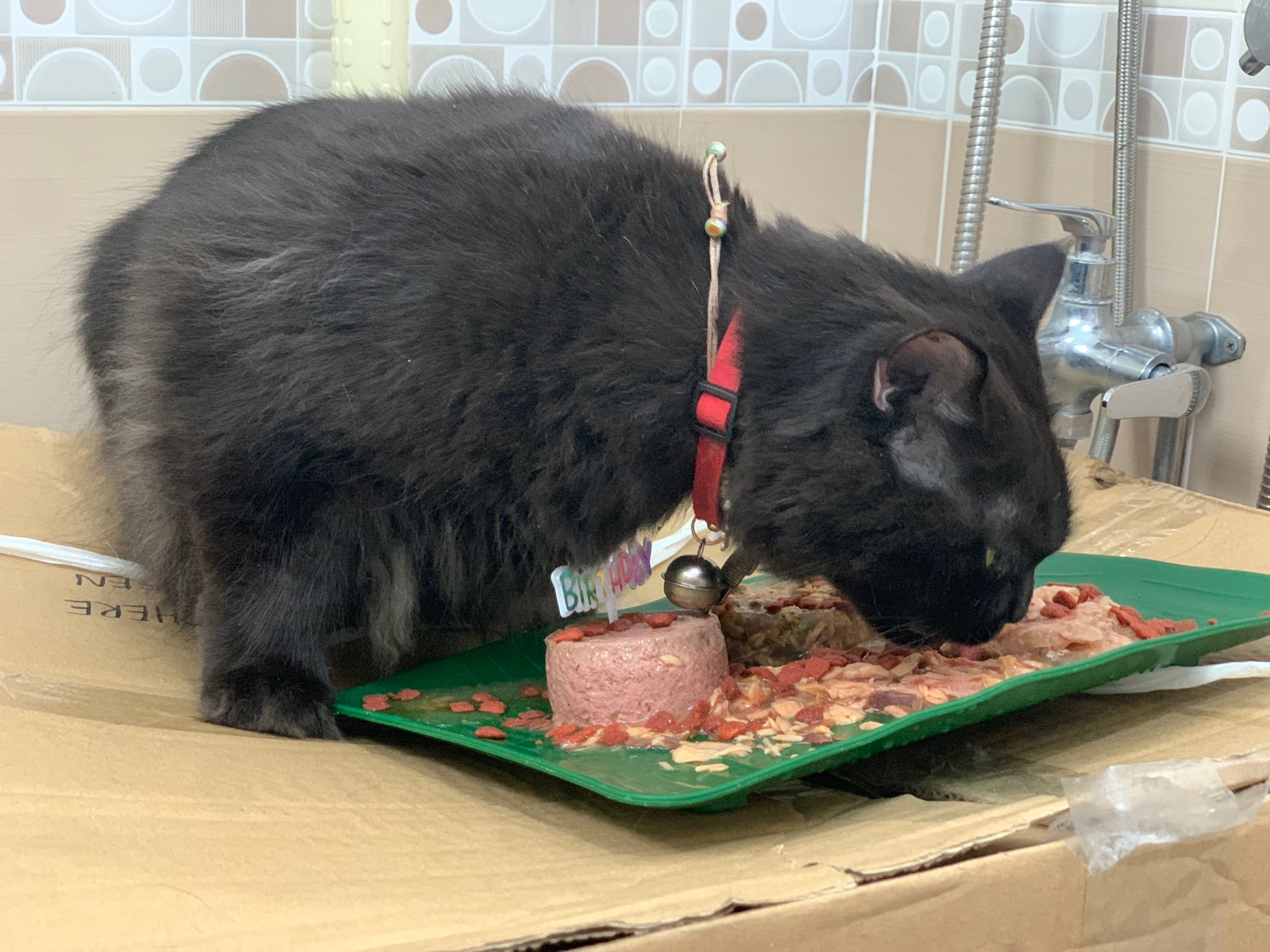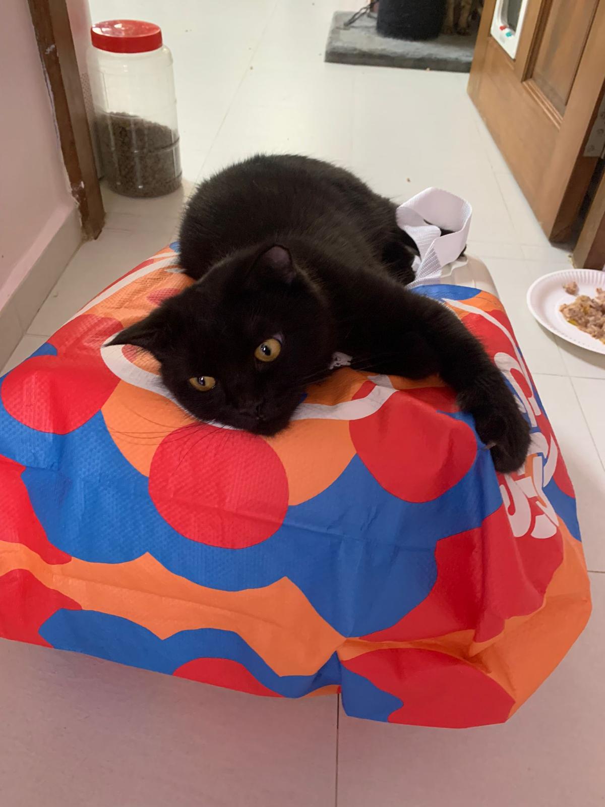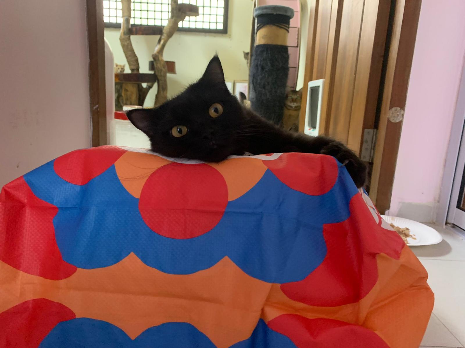 Party end and mama send me photo of Carrara and riri w their presents. “Carrara and riri love their new toys 😅 especially Carrara and the cat nip pillow haha. Thank you for the gifts!” – ha Cara hugging the red pillow, plastic not even taken yet loh