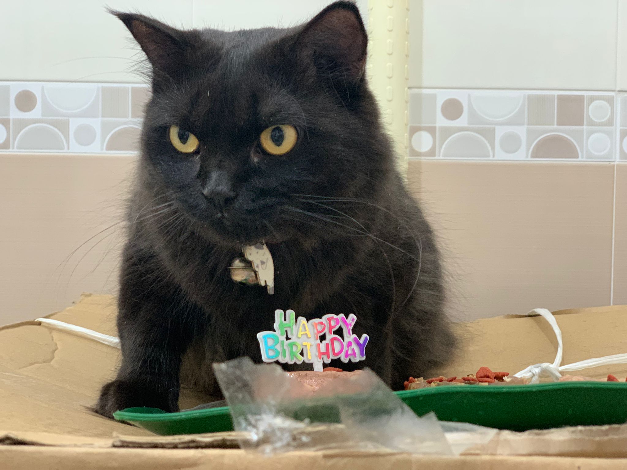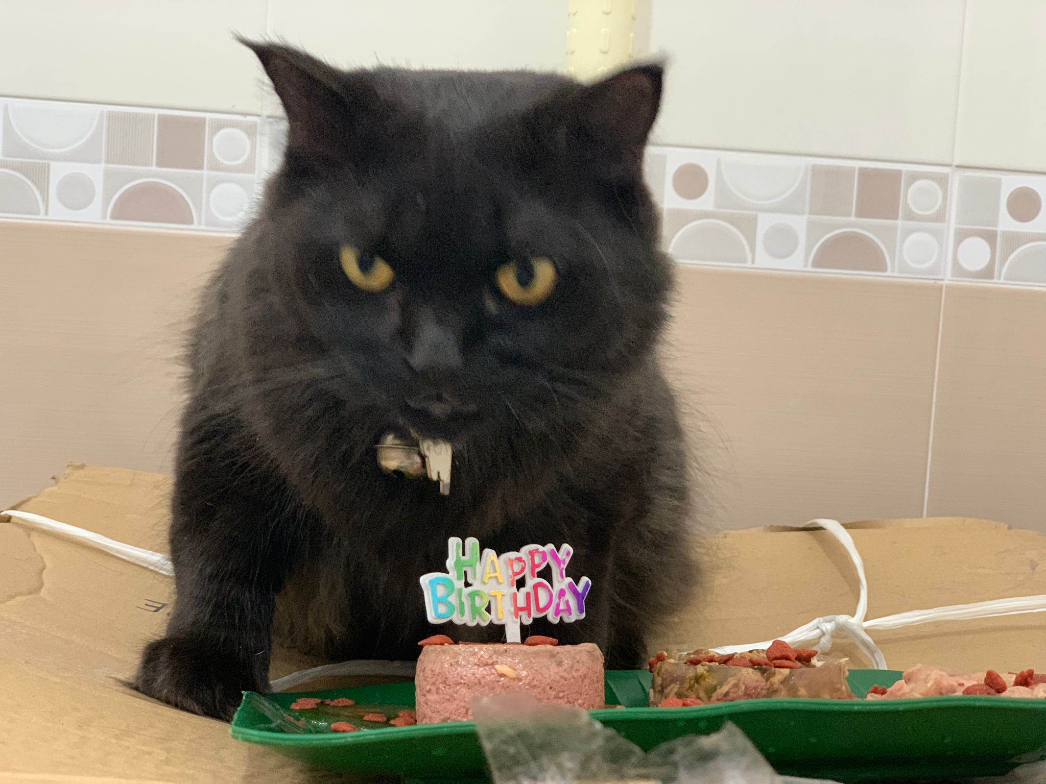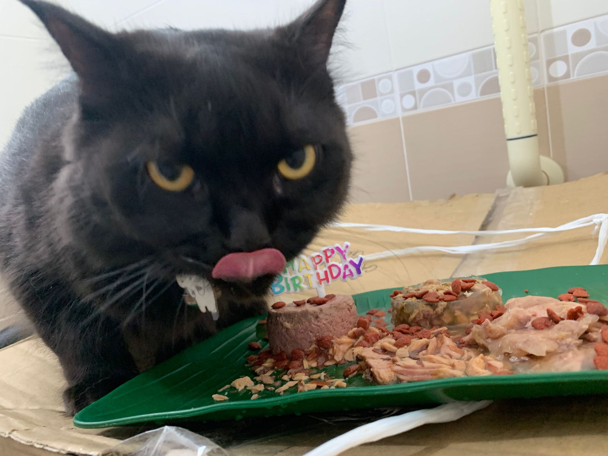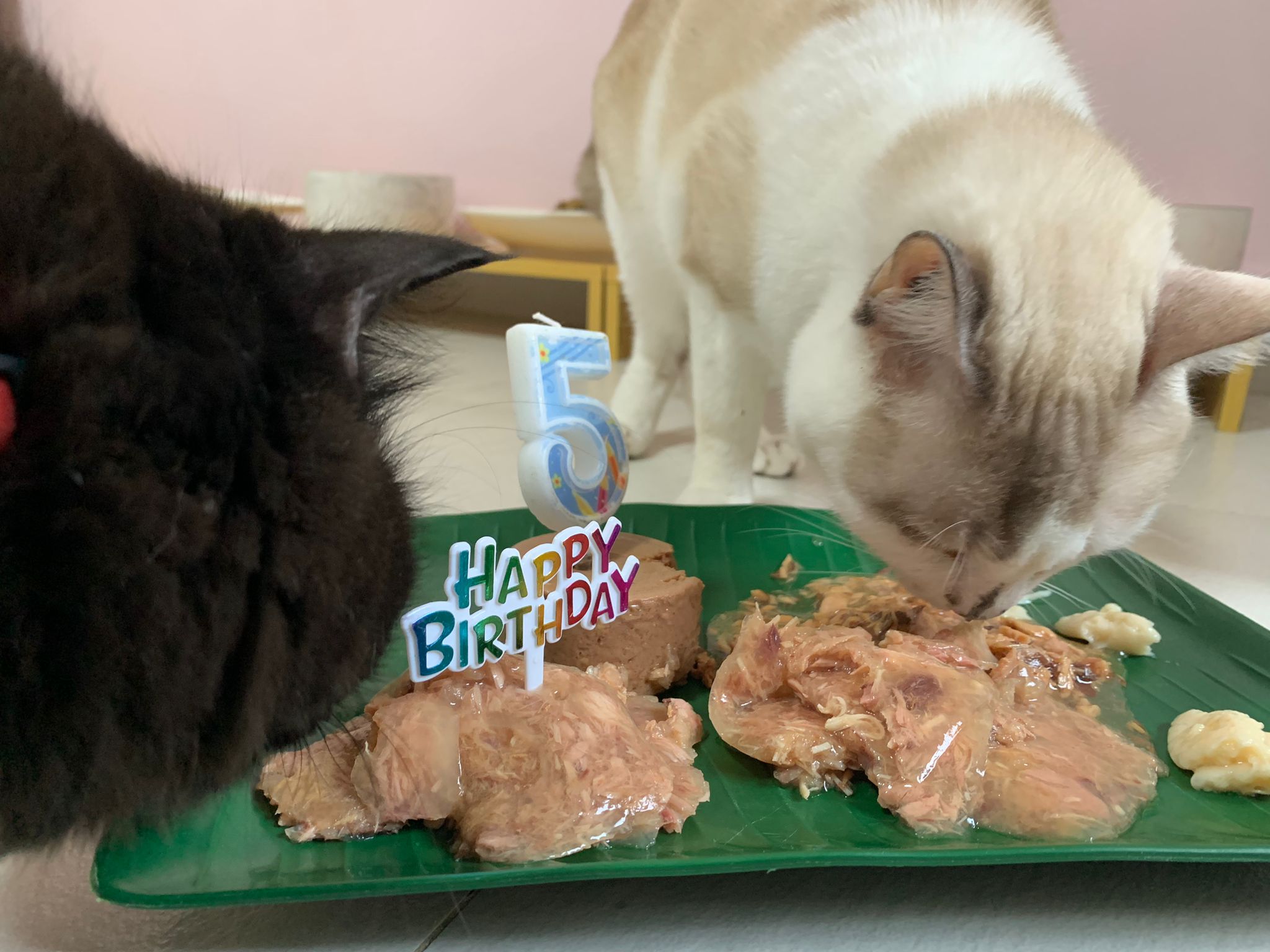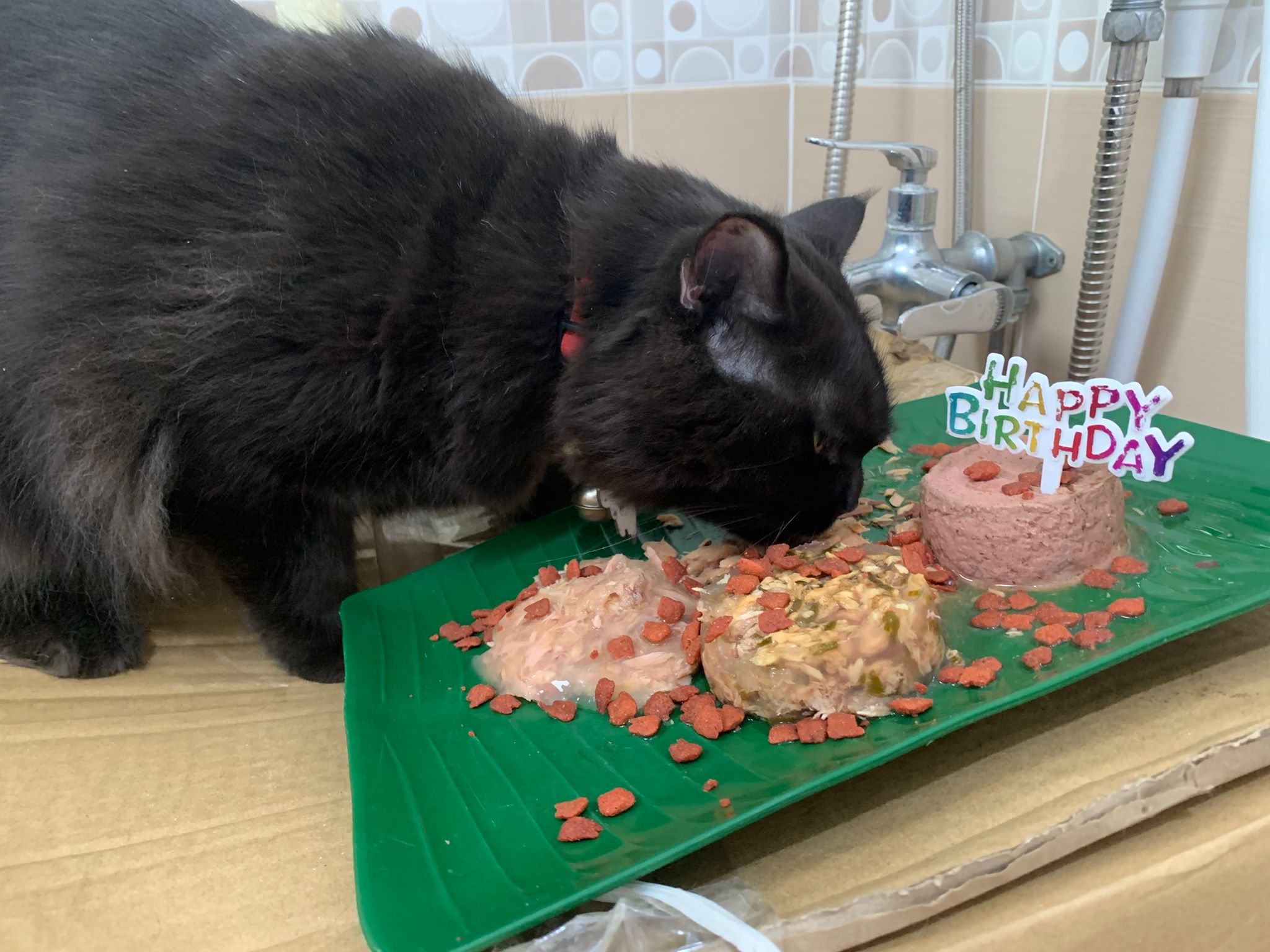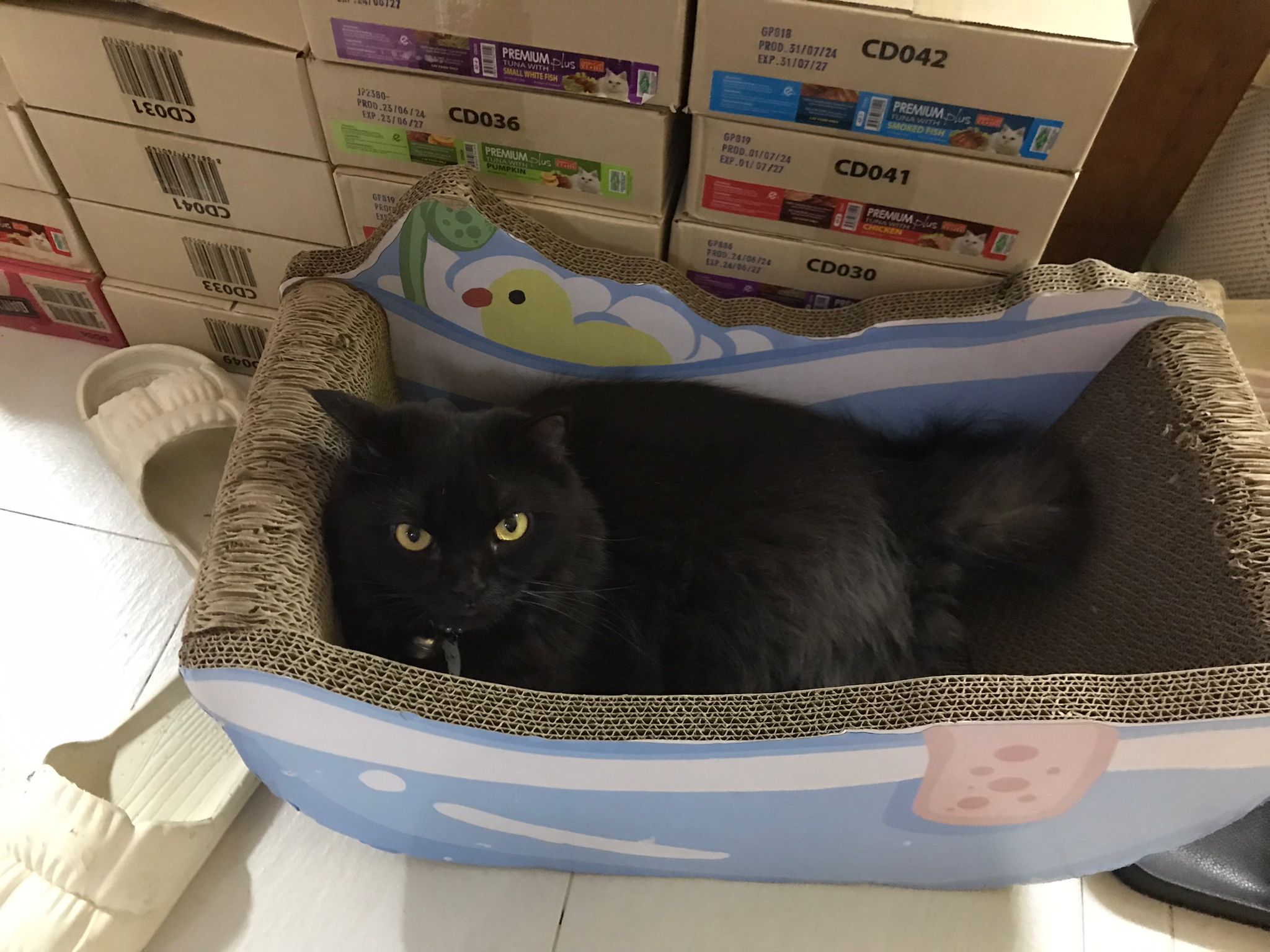 Party end and mama send me photo of Carrara and riri w their presents. “Carrara and riri love their new toys 😅 especially Carrara and the cat nip pillow haha. Thank you for the gifts!” – ha Cara hugging the red pillow, plastic not even taken yet loh