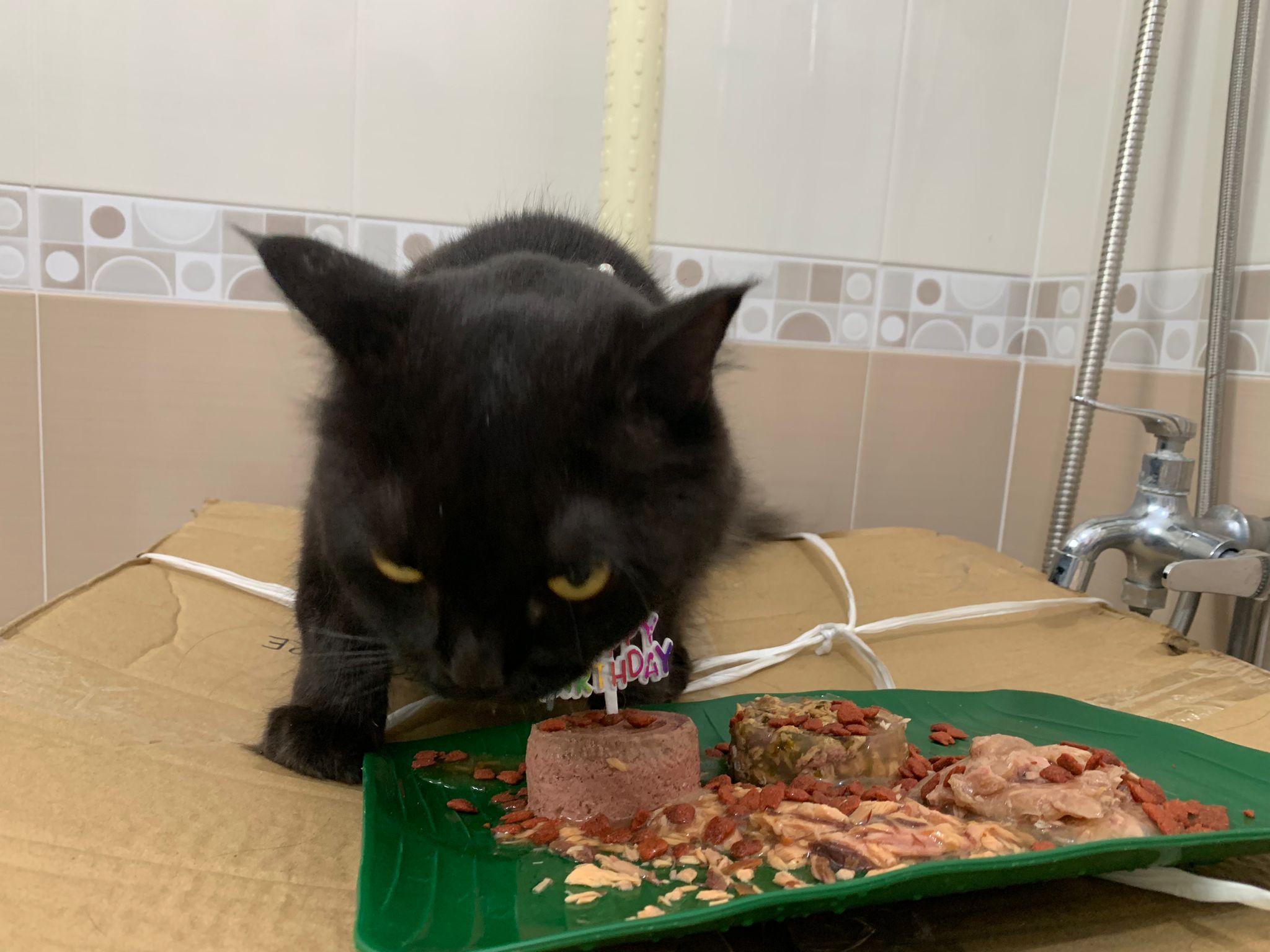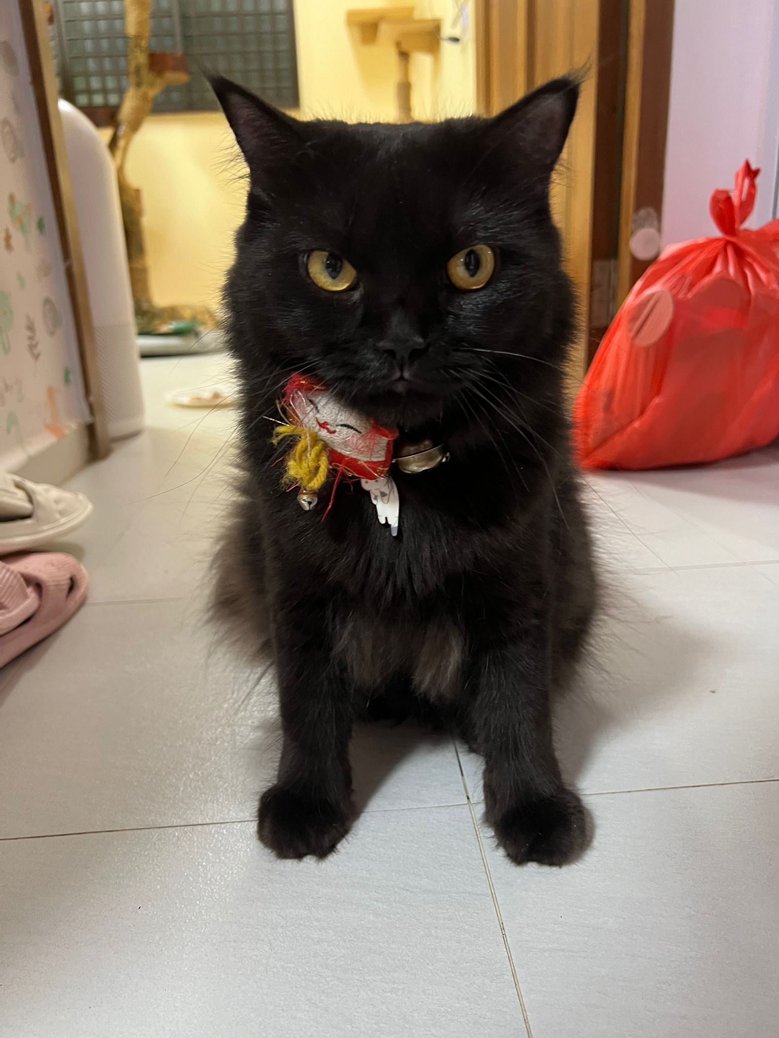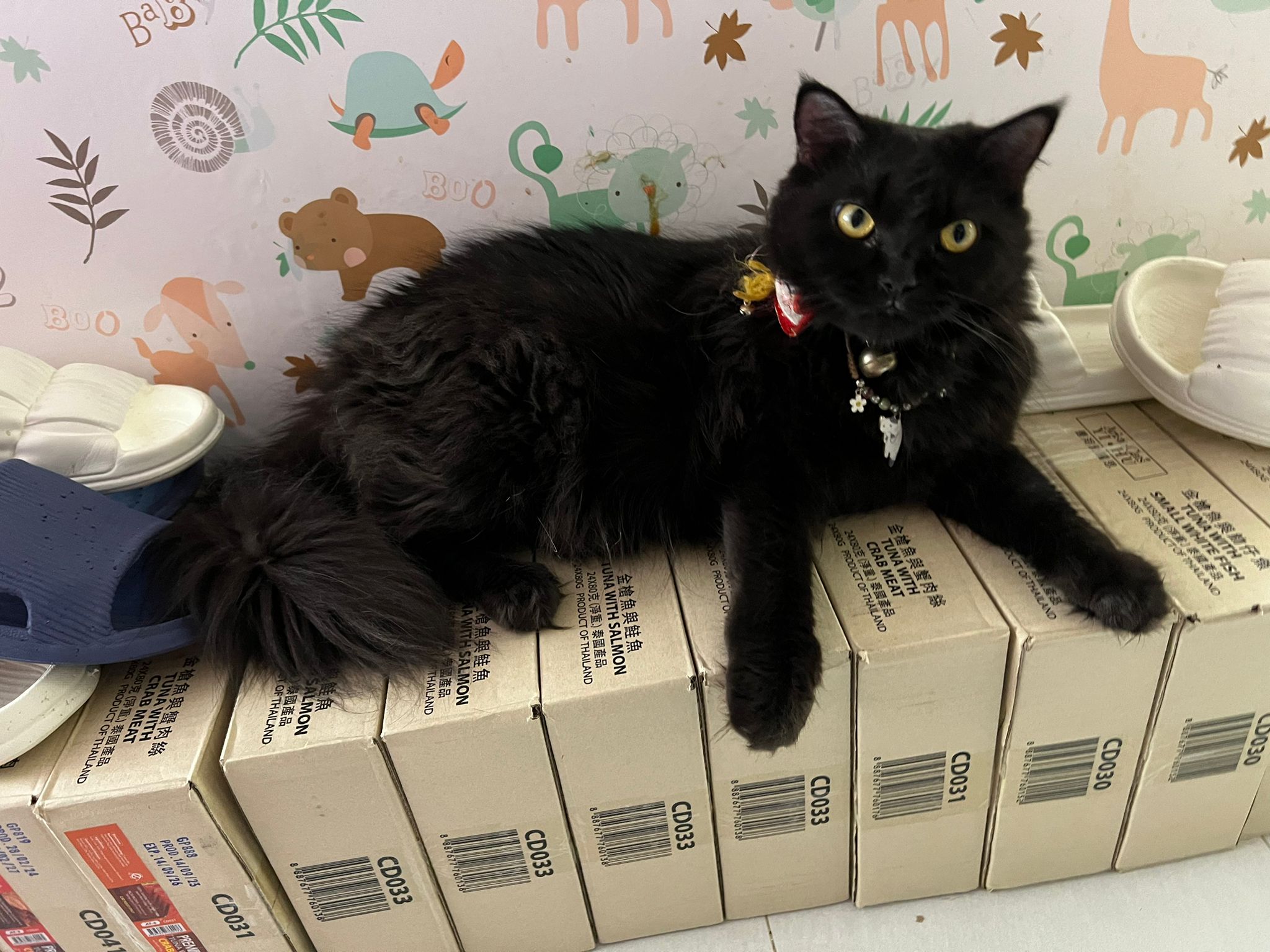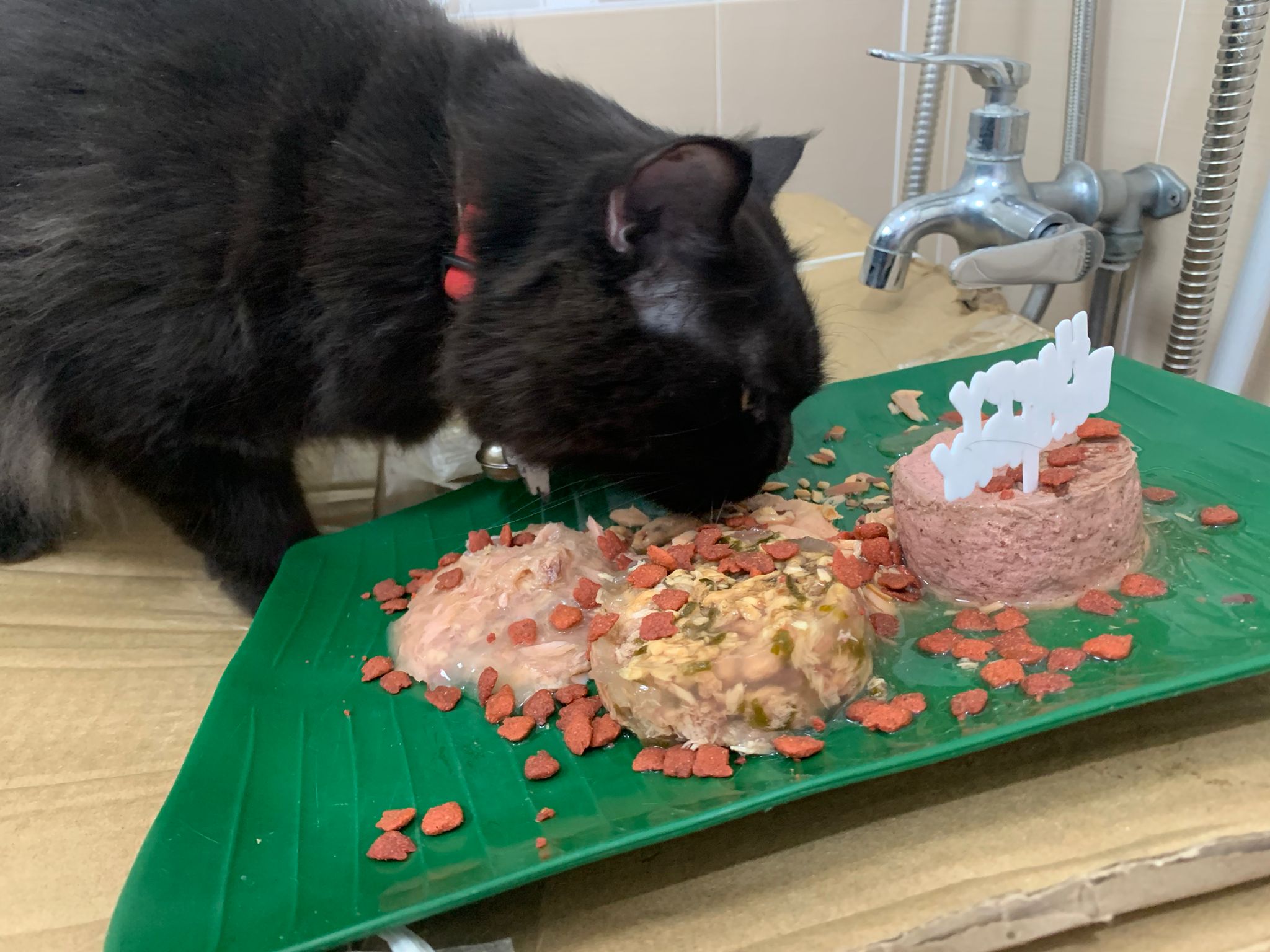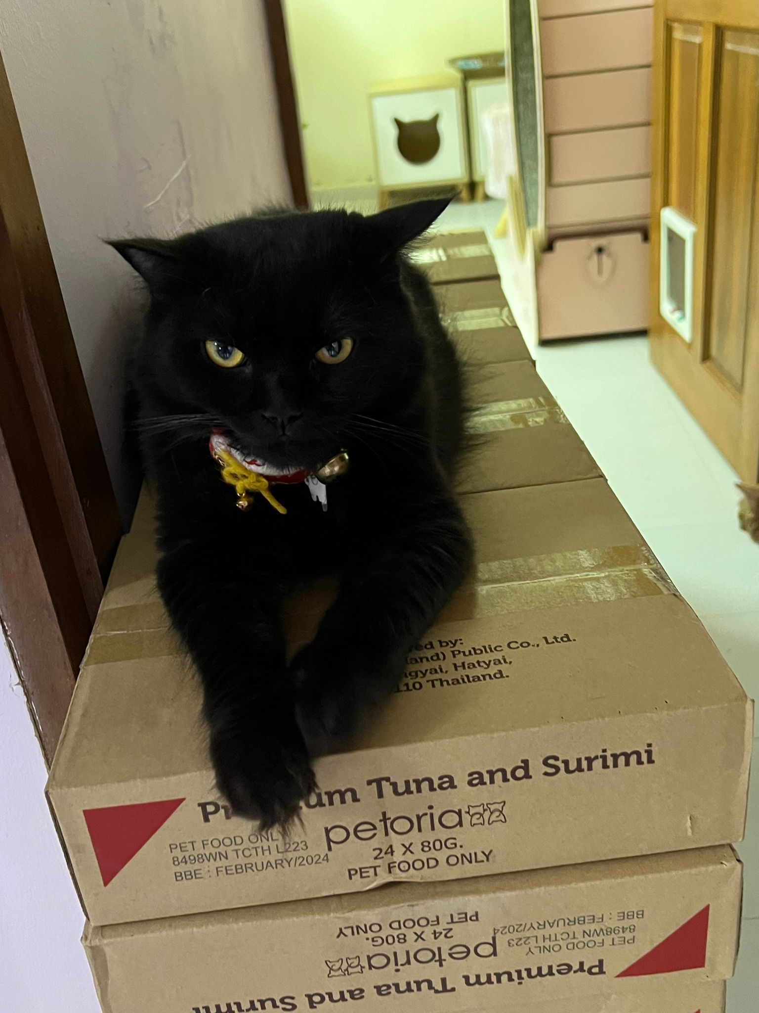 Party end and mama send me photo of Carrara and riri w their presents. “Carrara and riri love their new toys 😅 especially Carrara and the cat nip pillow haha. Thank you for the gifts!” – ha Cara hugging the red pillow, plastic not even taken yet loh