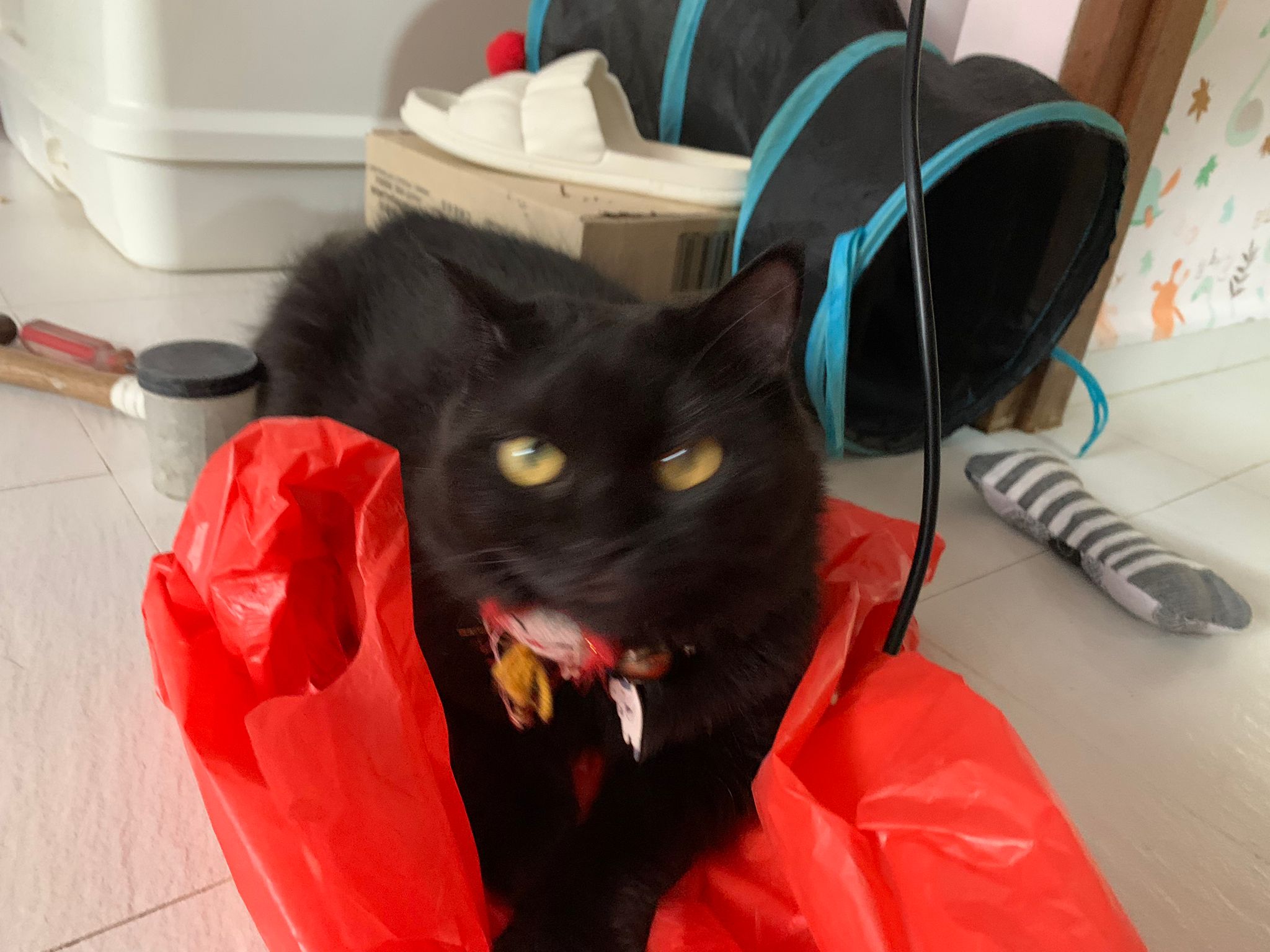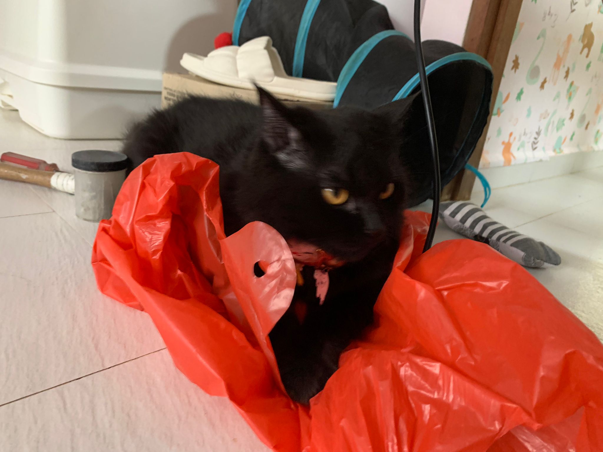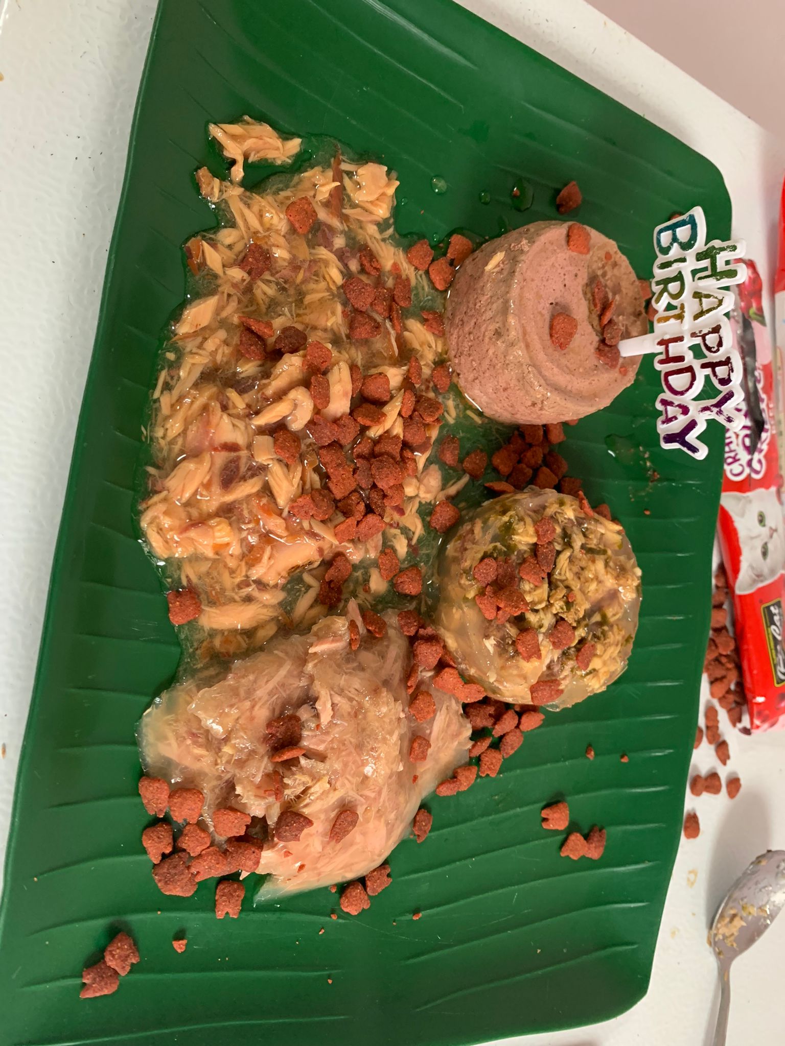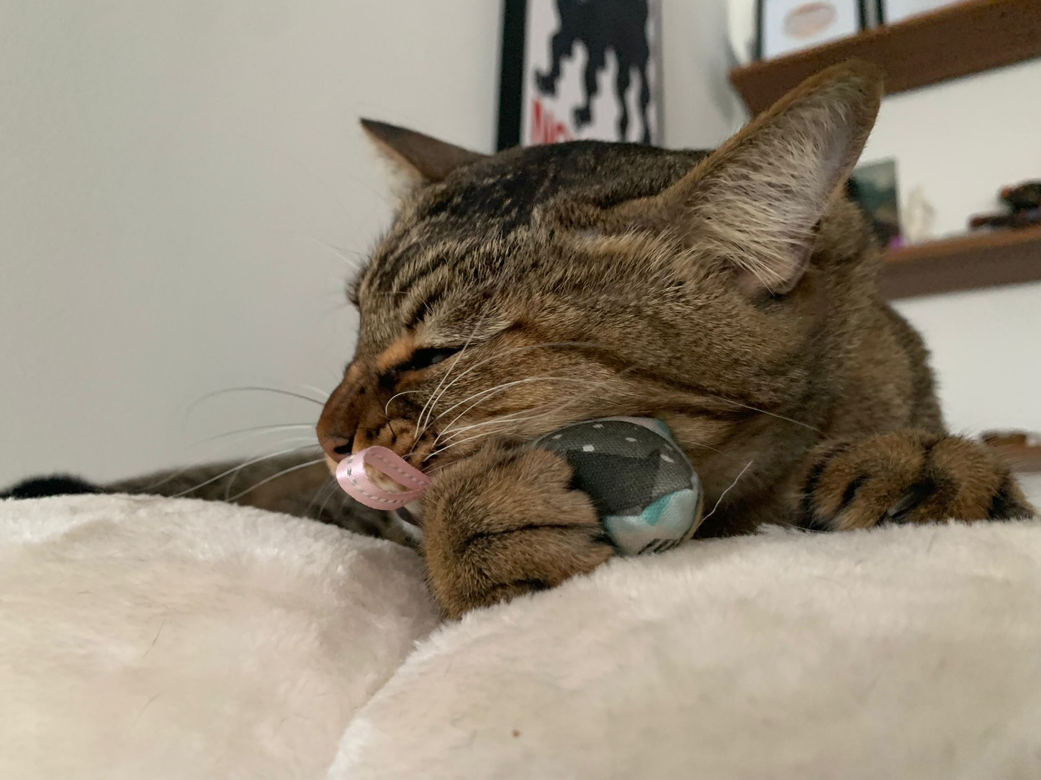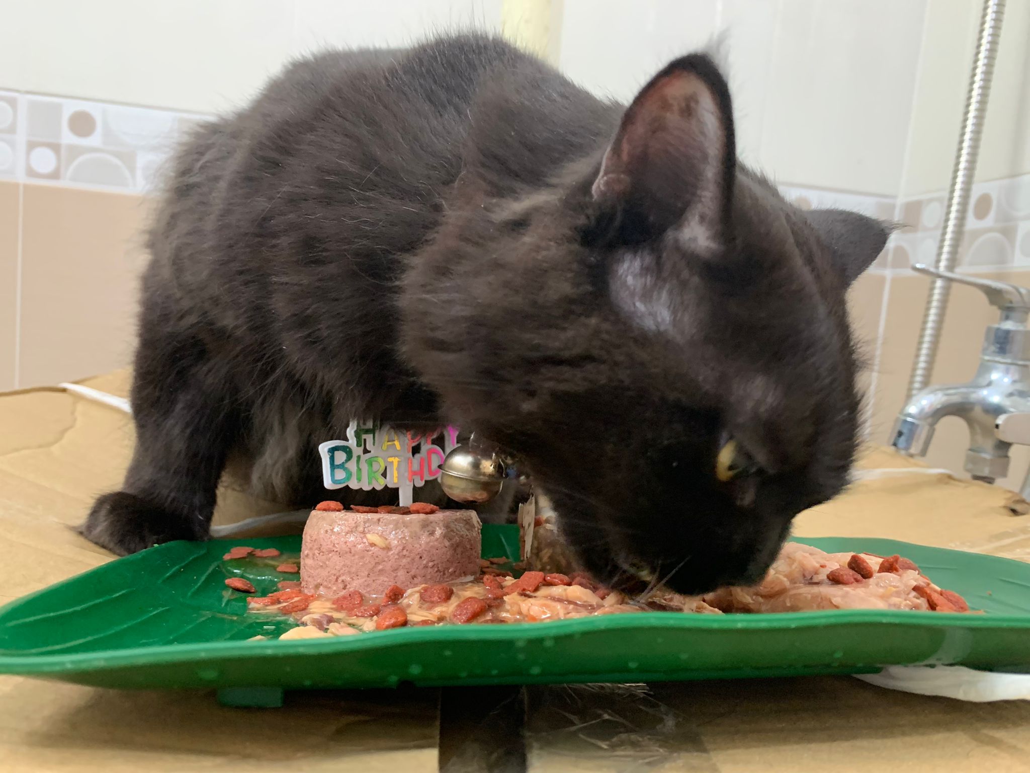 Party end and mama send me photo of Carrara and riri w their presents. “Carrara and riri love their new toys 😅 especially Carrara and the cat nip pillow haha. Thank you for the gifts!” – ha Cara hugging the red pillow, plastic not even taken yet loh