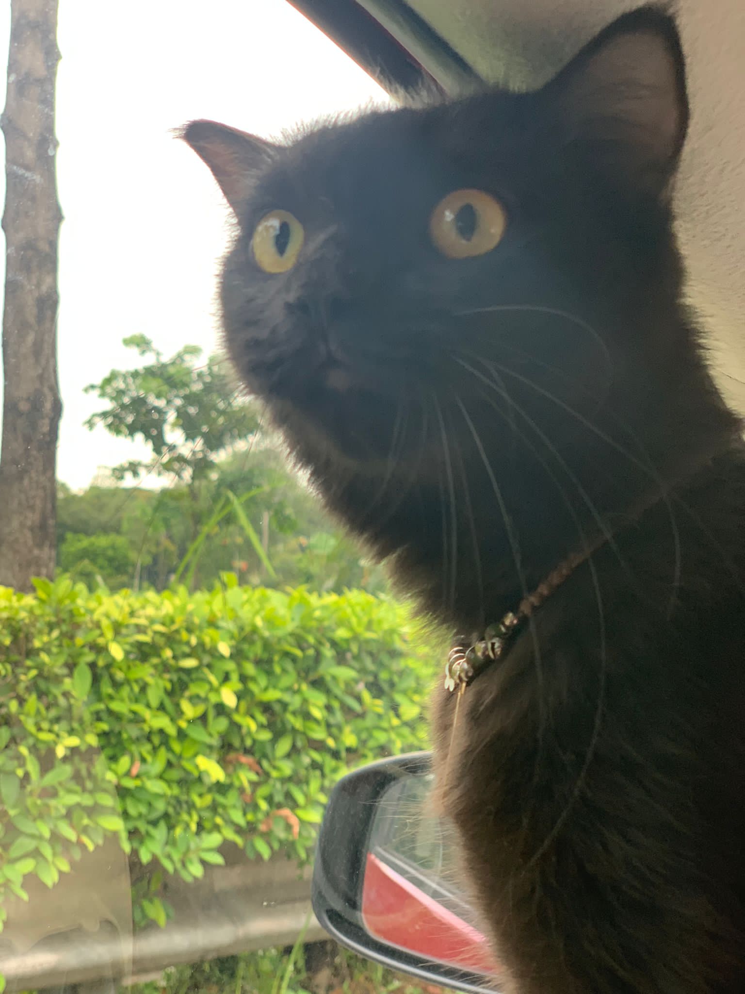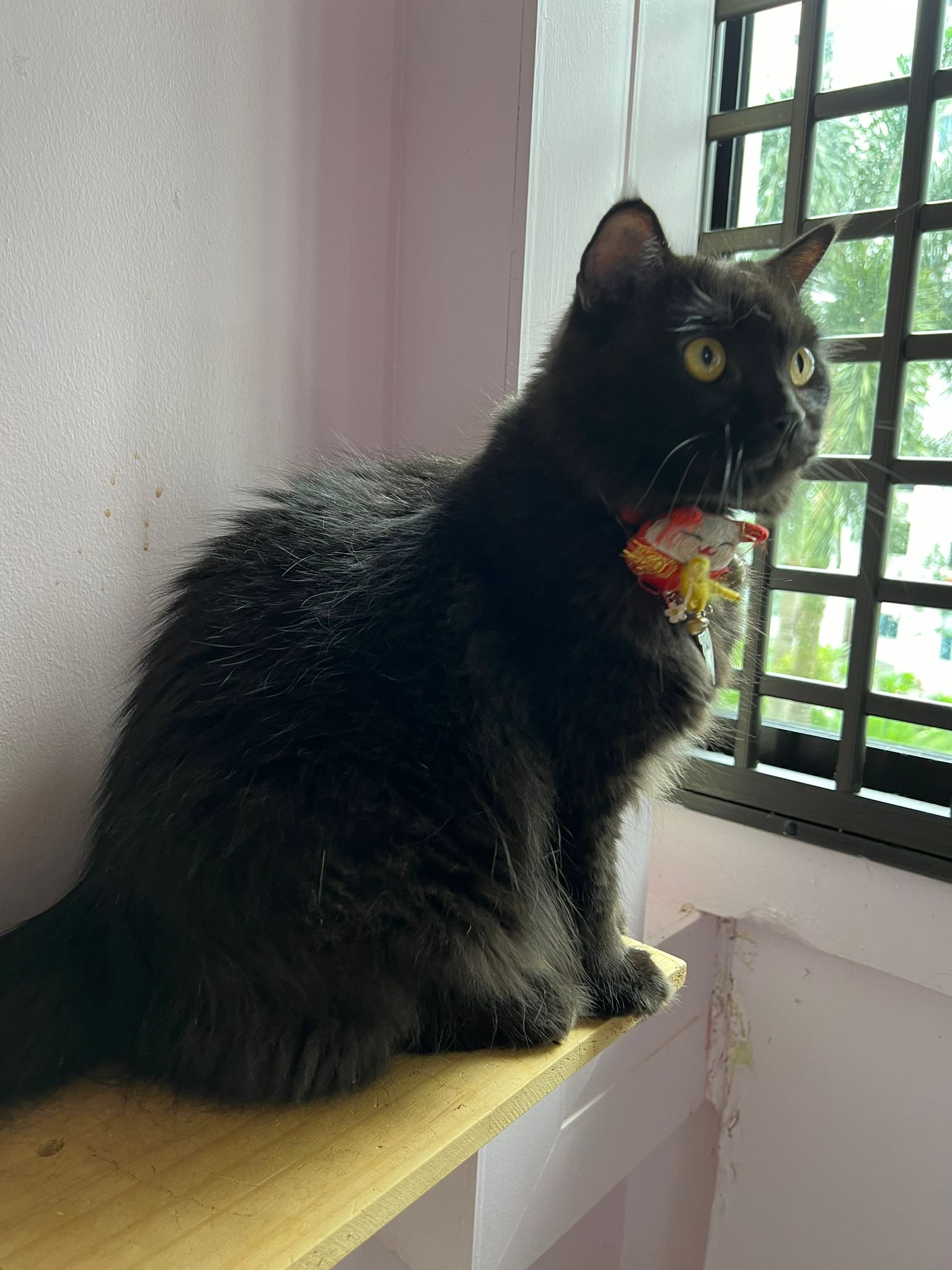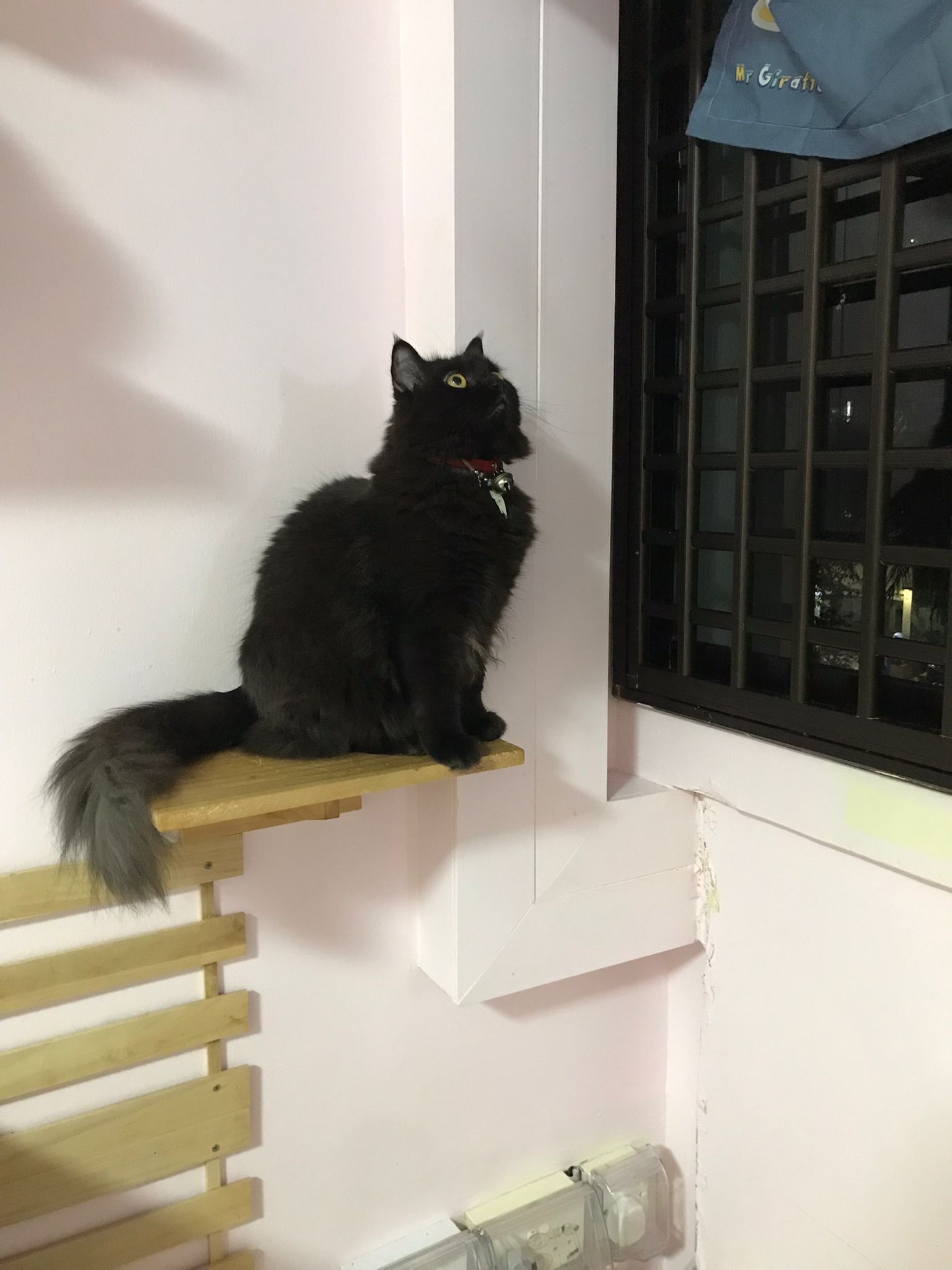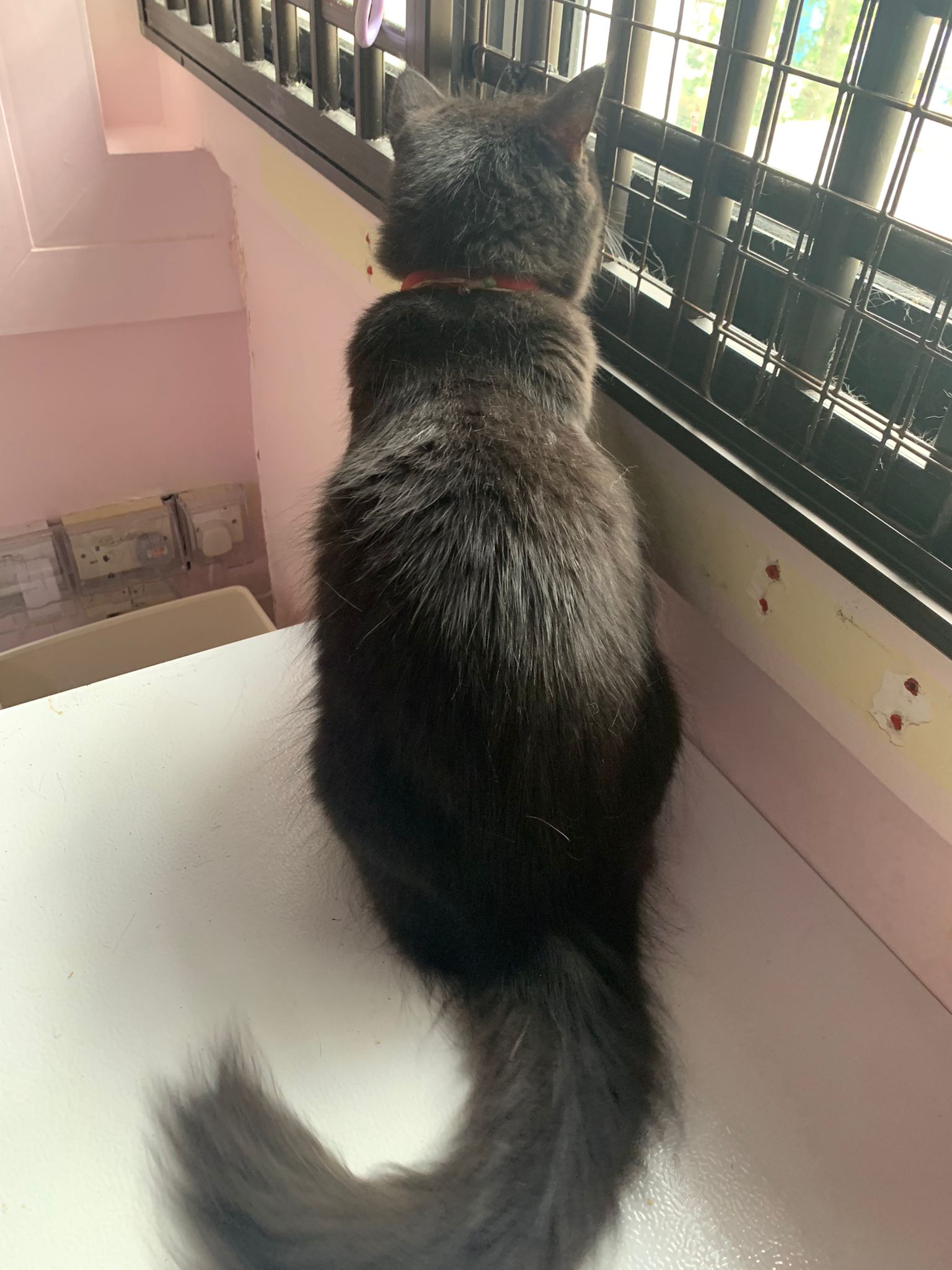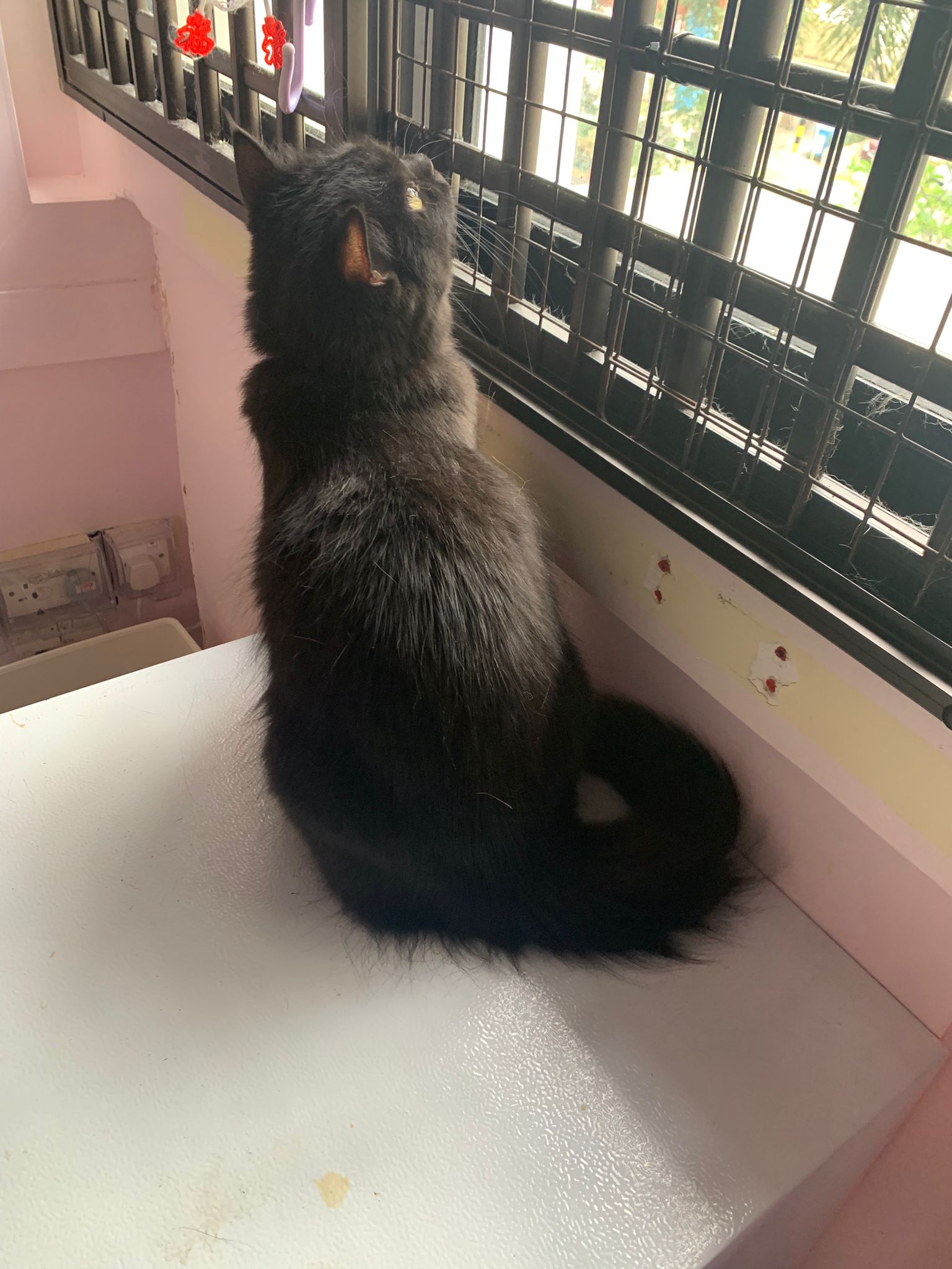 Morning: she is looking out to window. Remind her her house is tall n high, look out can see sky … remind her she gonna have papa mama and big bro cat. And she is still 猫房 Guai babies