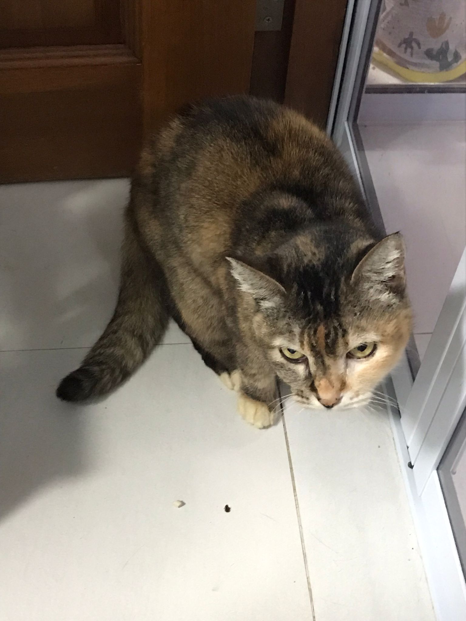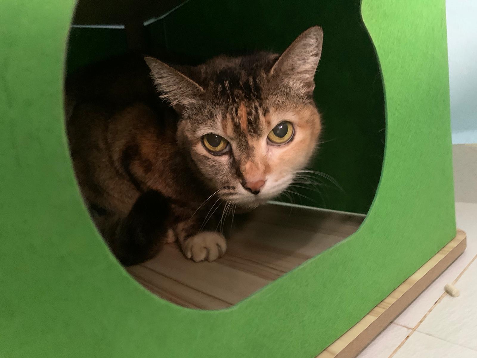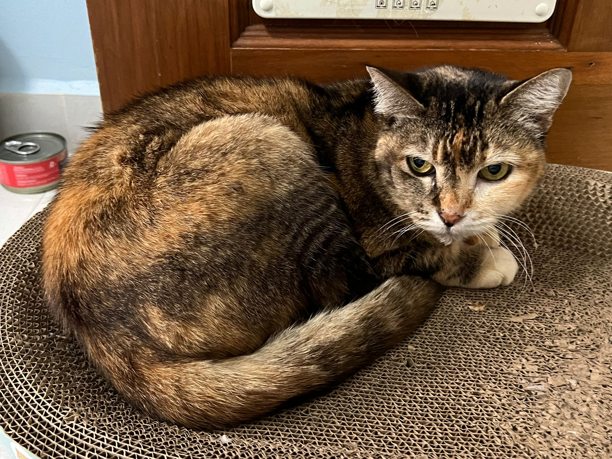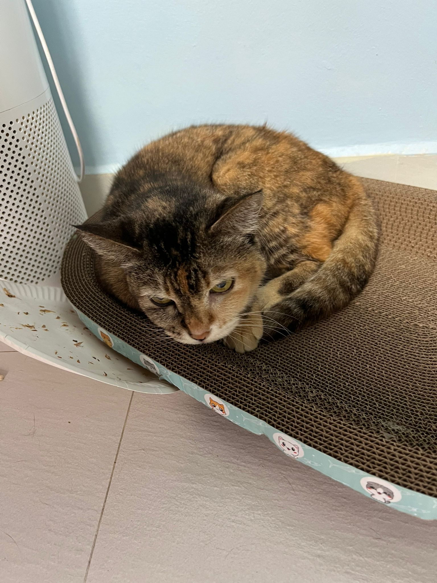 She was picked up from a void deck when she was a 2 weeks’ old kitten. She is with me since then. She is a sweet girl but gets annoyed and irritated easily. She is quite tolerant towards the 2 younger cats. She is quite picky about food.