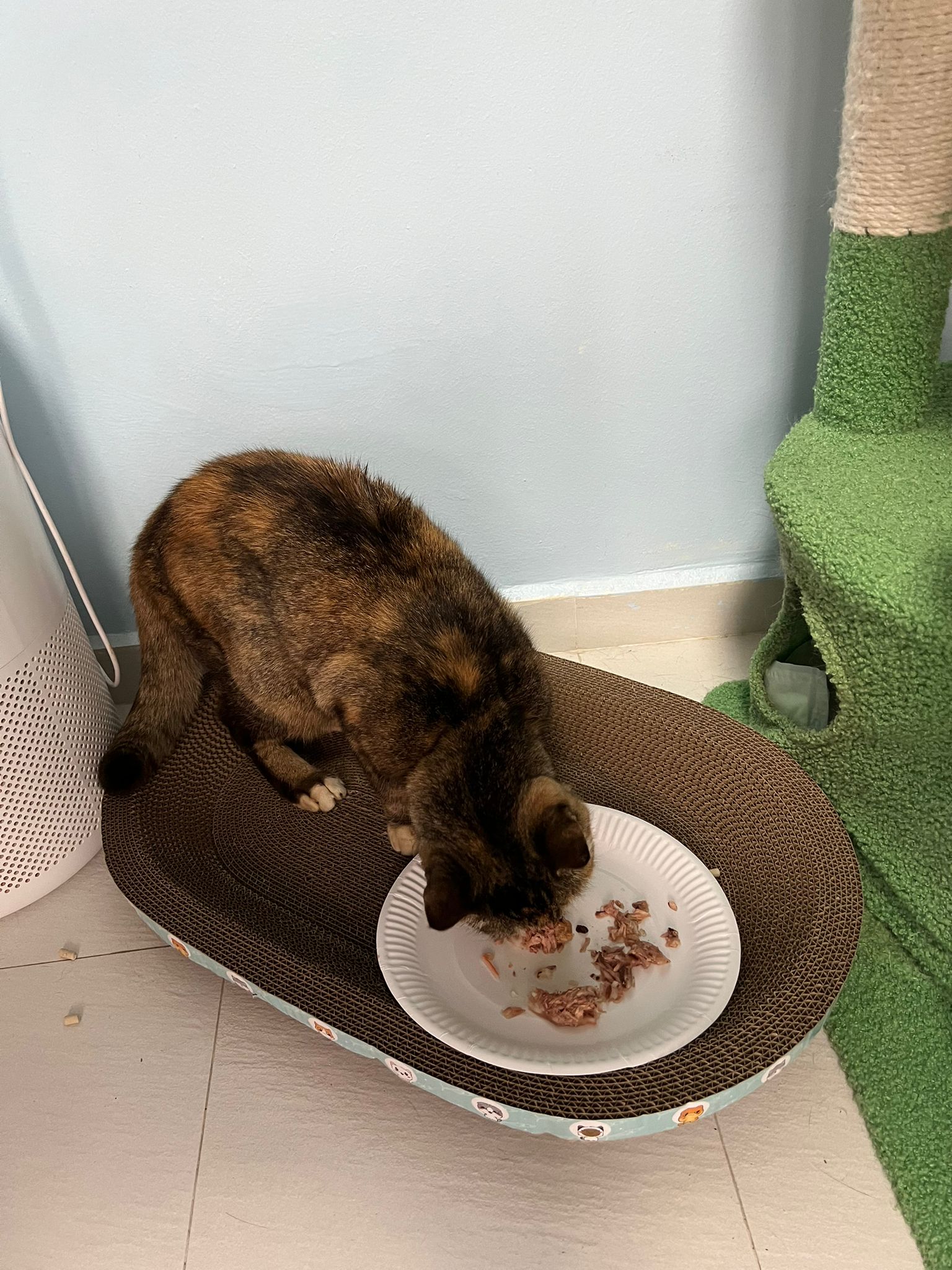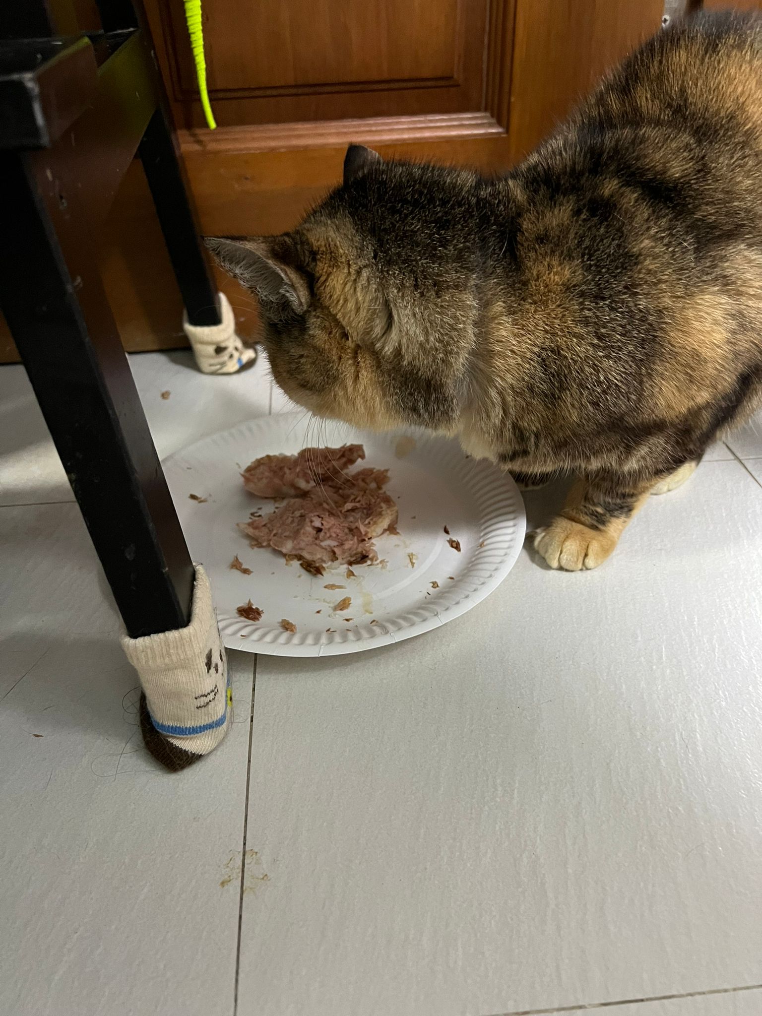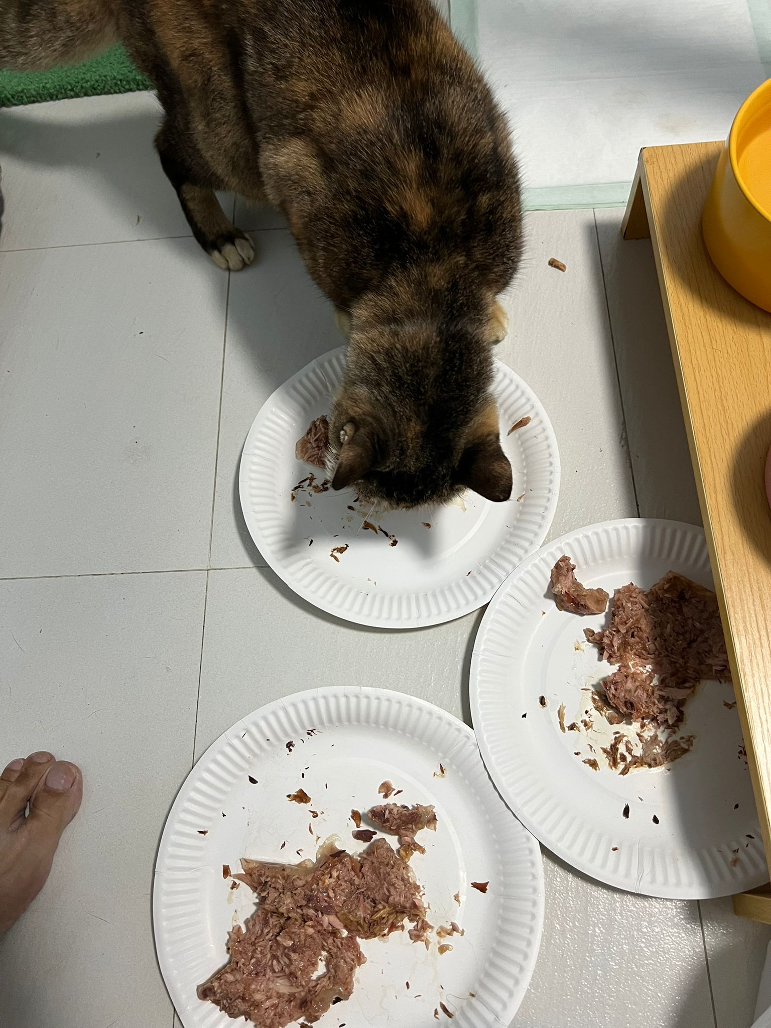 7am+: all plates r empty. V clean. No poo in bin. serve food – tuna w smoked fish. Seem like Cherie didn’t like this. She did drink a lot of water.