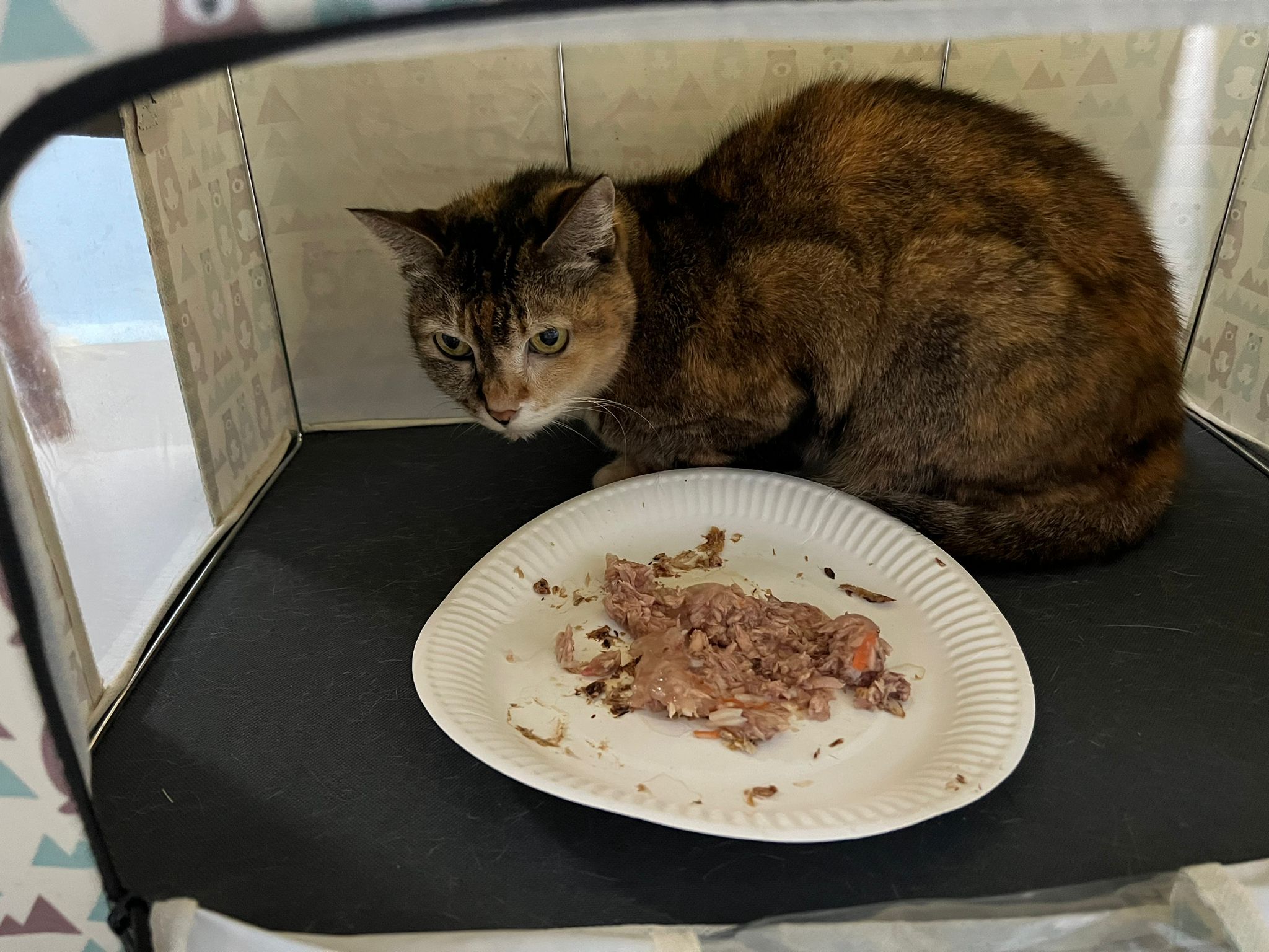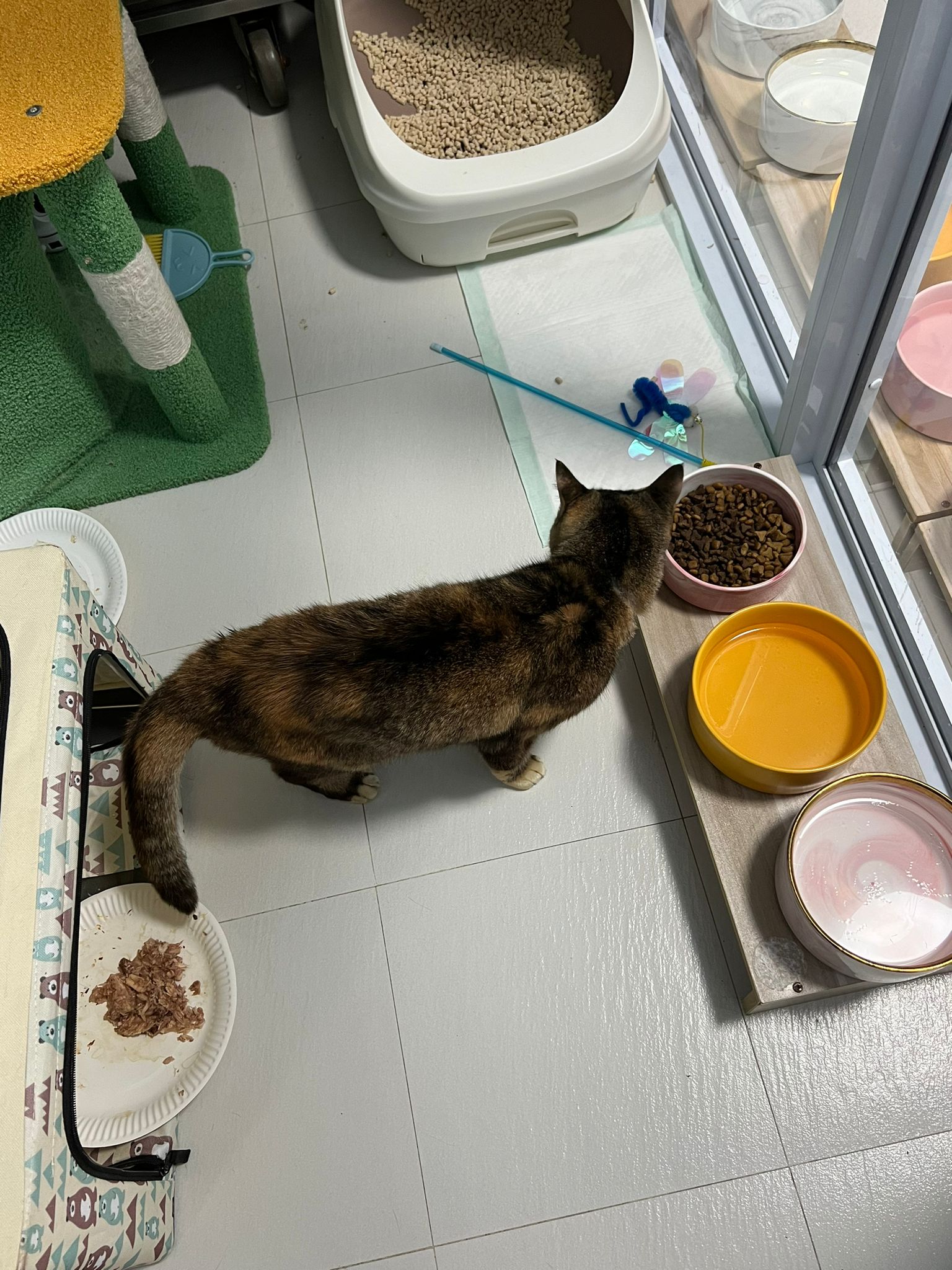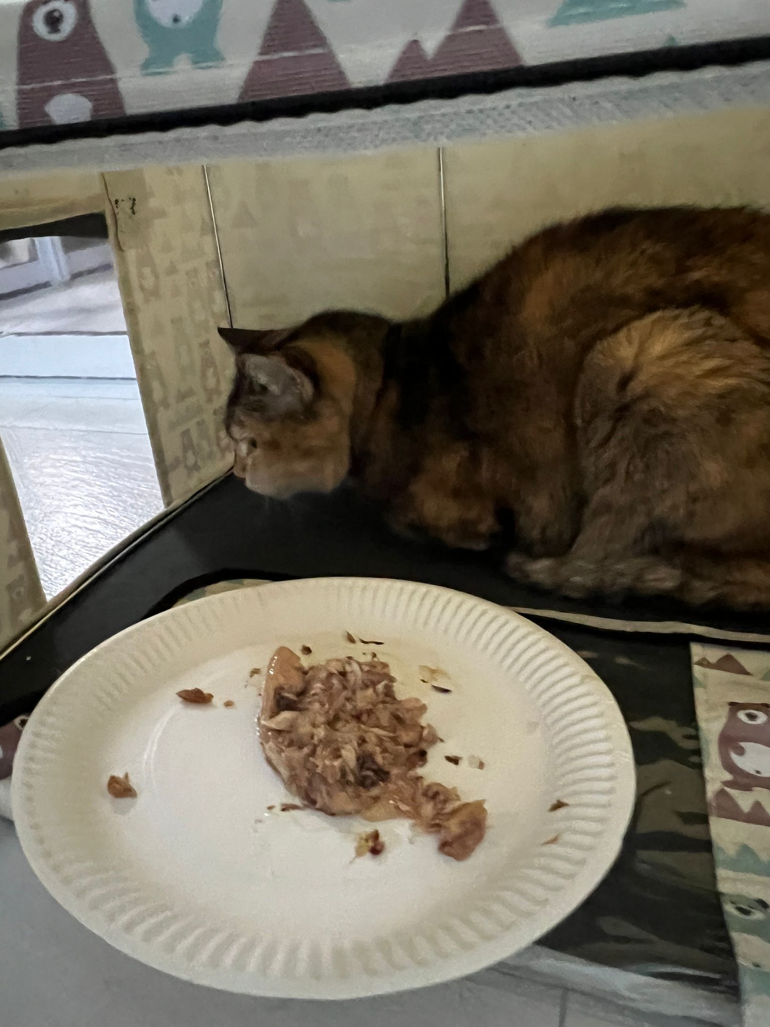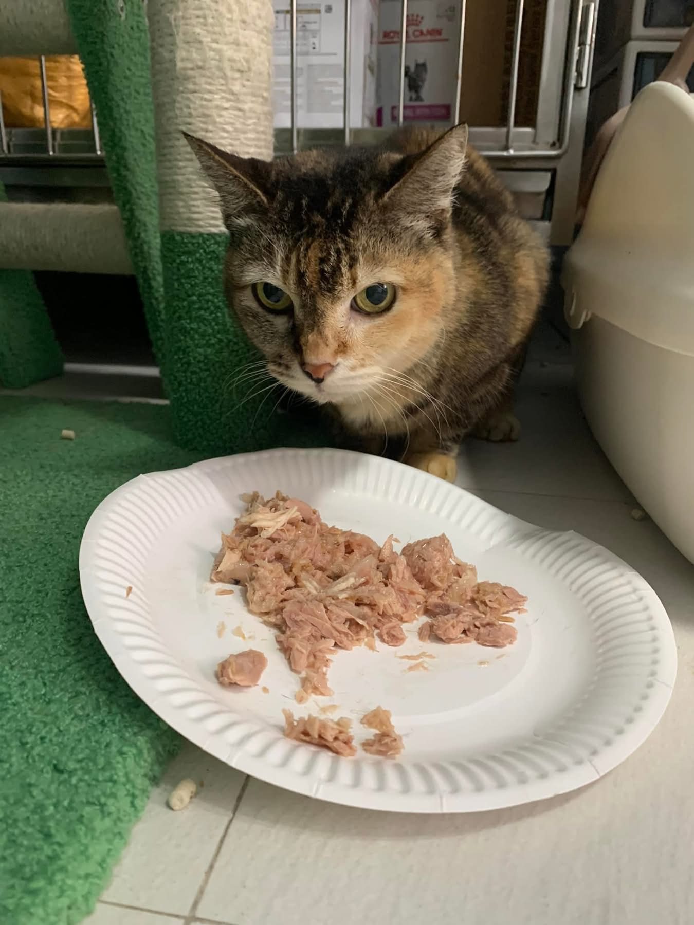 7am+: all plates r empty. V clean. No poo in bin. serve food – tuna w smoked fish. Seem like Cherie didn’t like this. She did drink a lot of water.