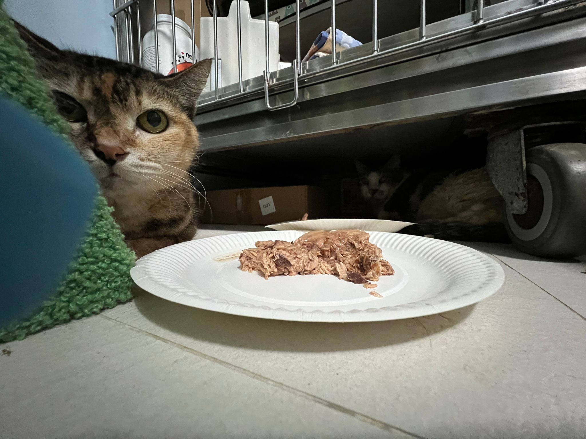 8am+: Benji seem to want to steal Cherie food, i top up another plate of finnese tuna w chicken for her.