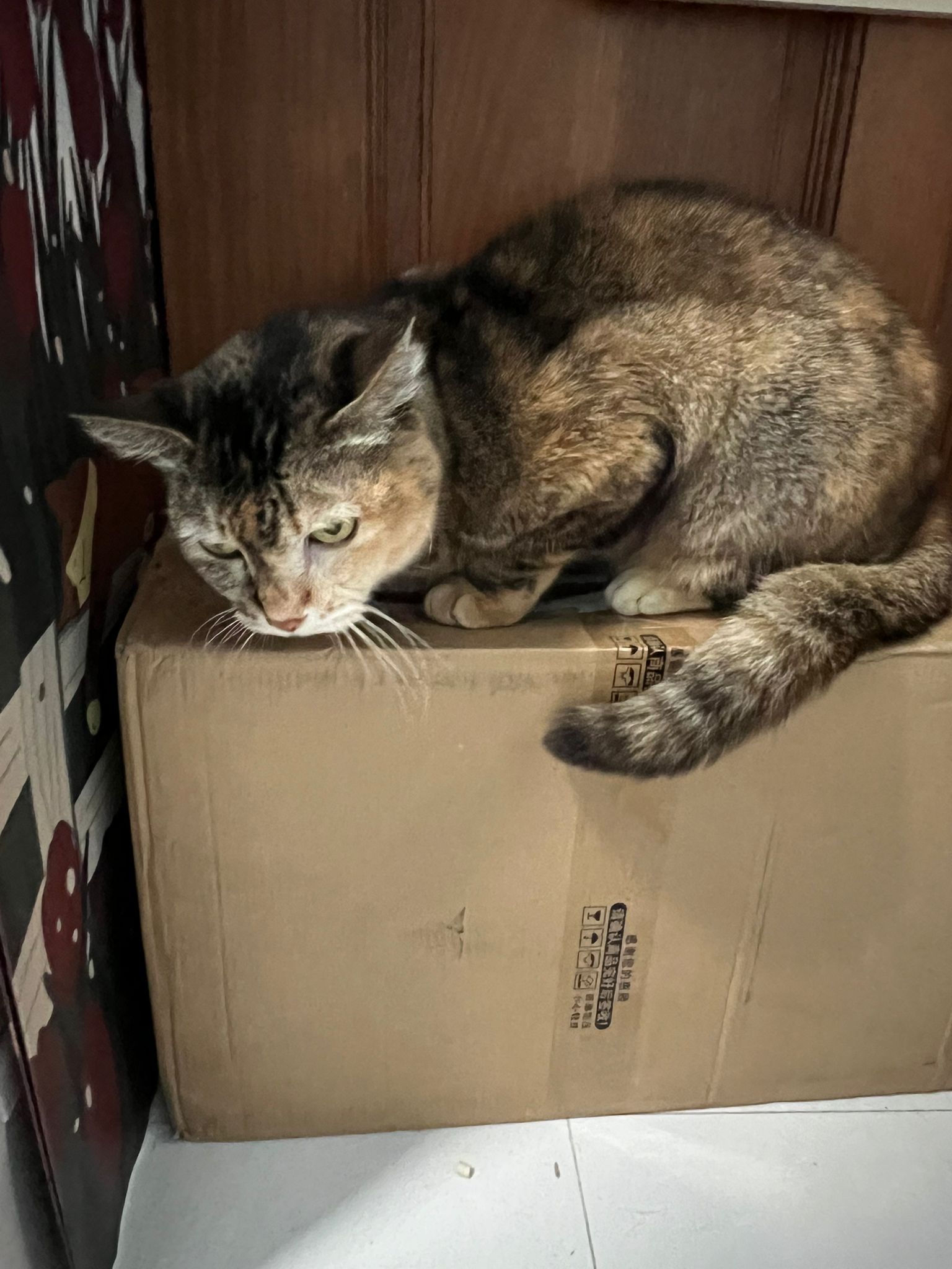 10am+: on the box. She like to sit on box, but I give away the box Liao.