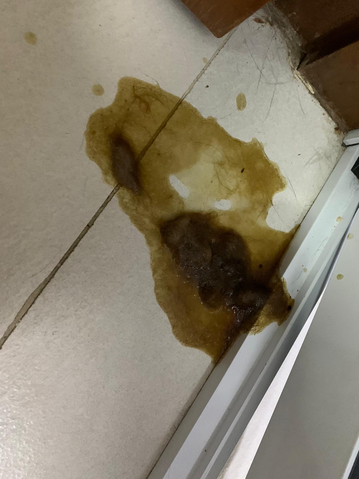 9am+: food all cleared. On floor got stain again. Duno is what from here. Saliva? Pee? Butt stain? One set of dry 6.5/10 poo in bin.