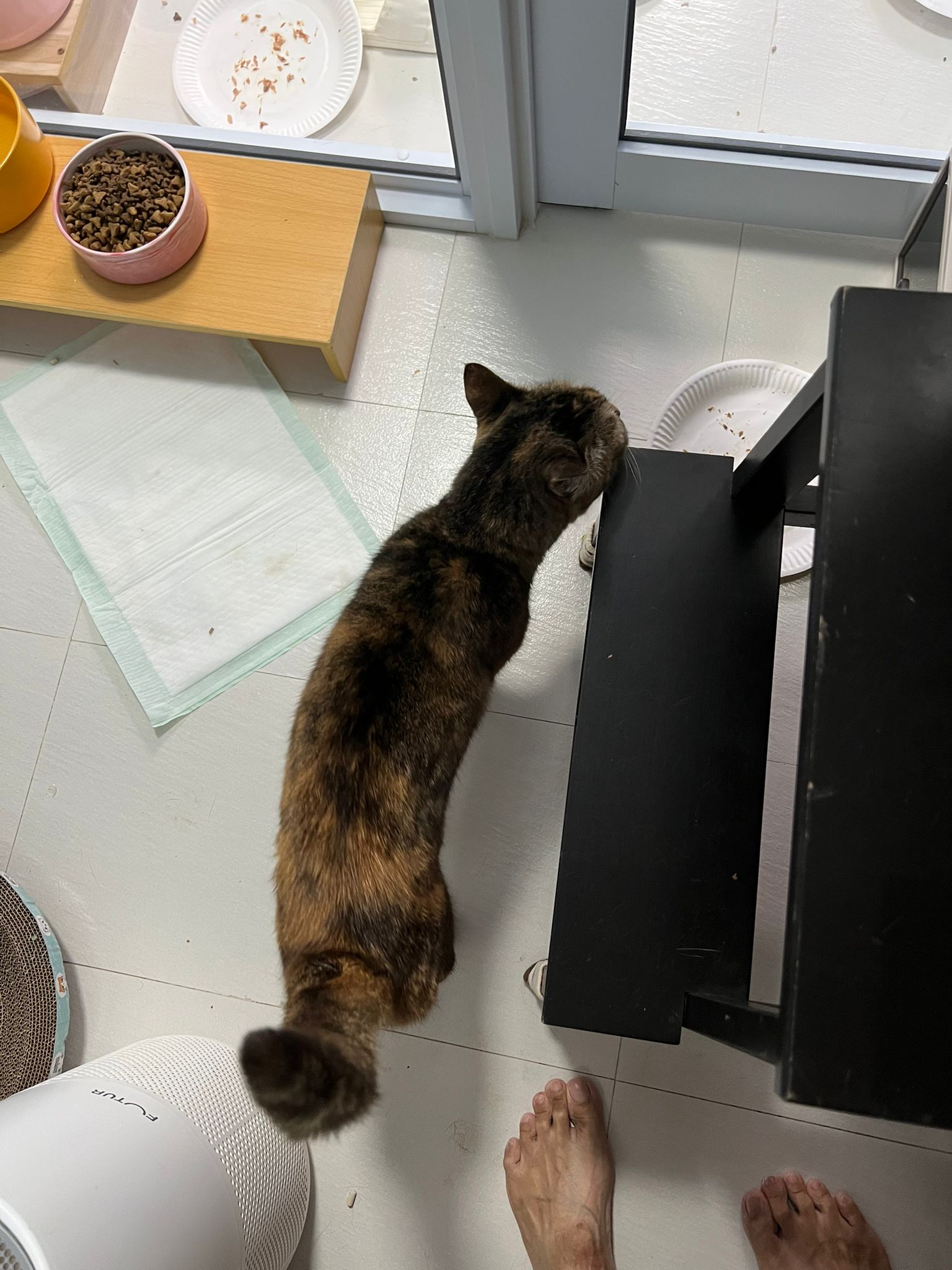 10am: sit under the cage, mmm told me they whole day n night also meow meow for food n more food n more food. yesterday she saw me load the massive number of ctns of cat food.