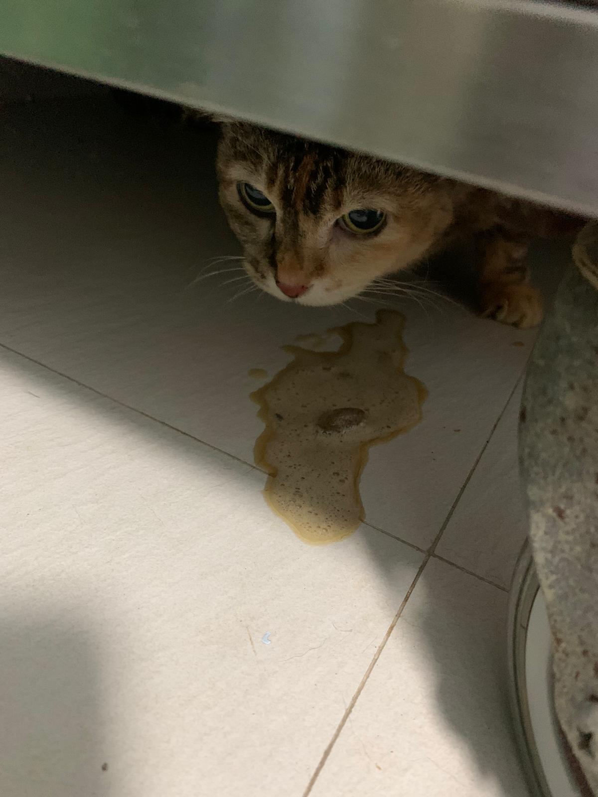 9.47pm: mmm:”Hmmm stressed?” – send me a photo that I thought 2 rolls of poo on floor. I trace Ip. One not sure maybe poo, but the one closer to food bowl is cherie vomit one big roll of 11Am of fur ball. Omg. She lick herself so much at home?
