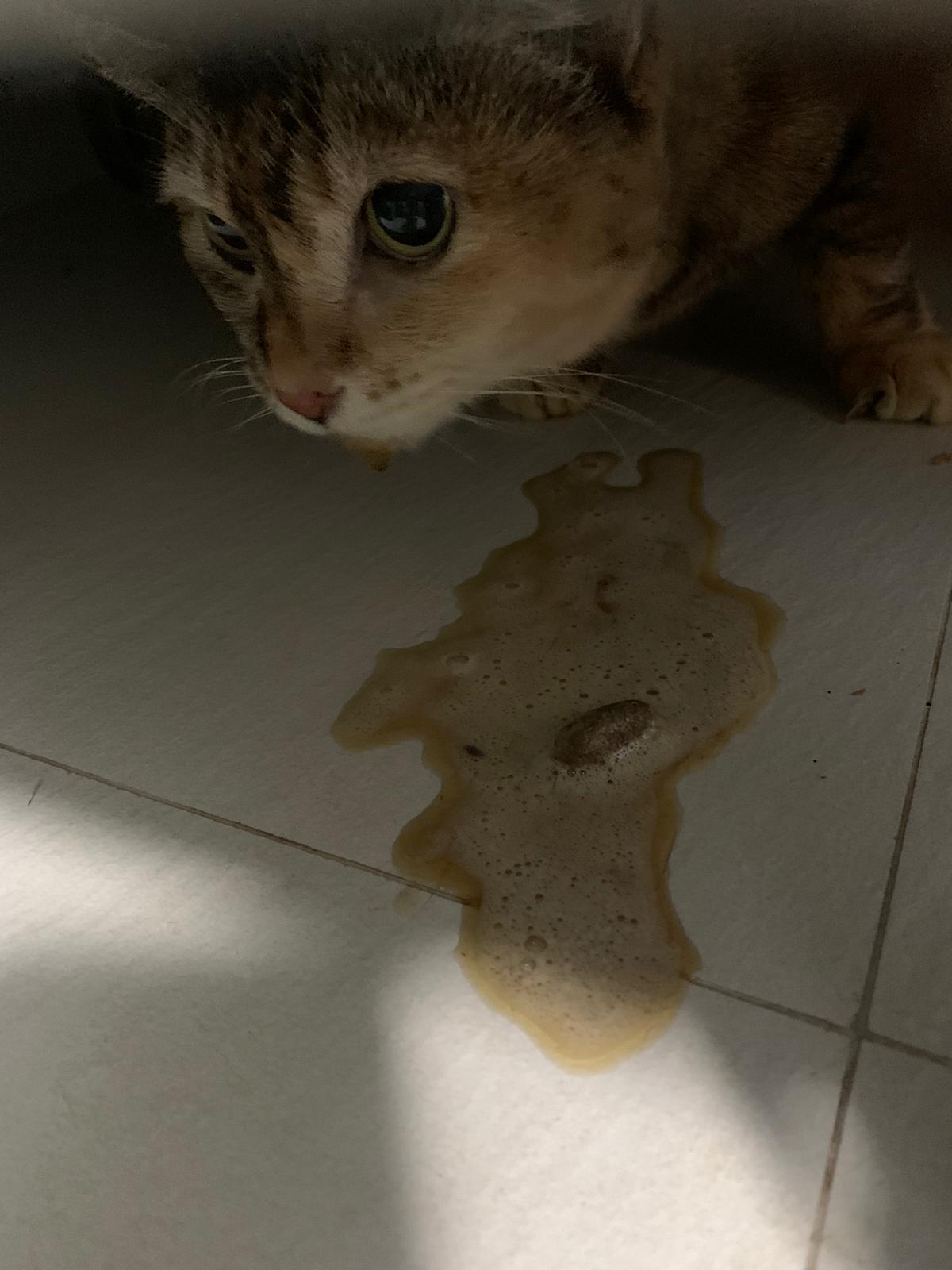 Cherie vomit out furball again. Ball of furball. then I saw another set of poo which got “line” like worm but I check it’s not worms.