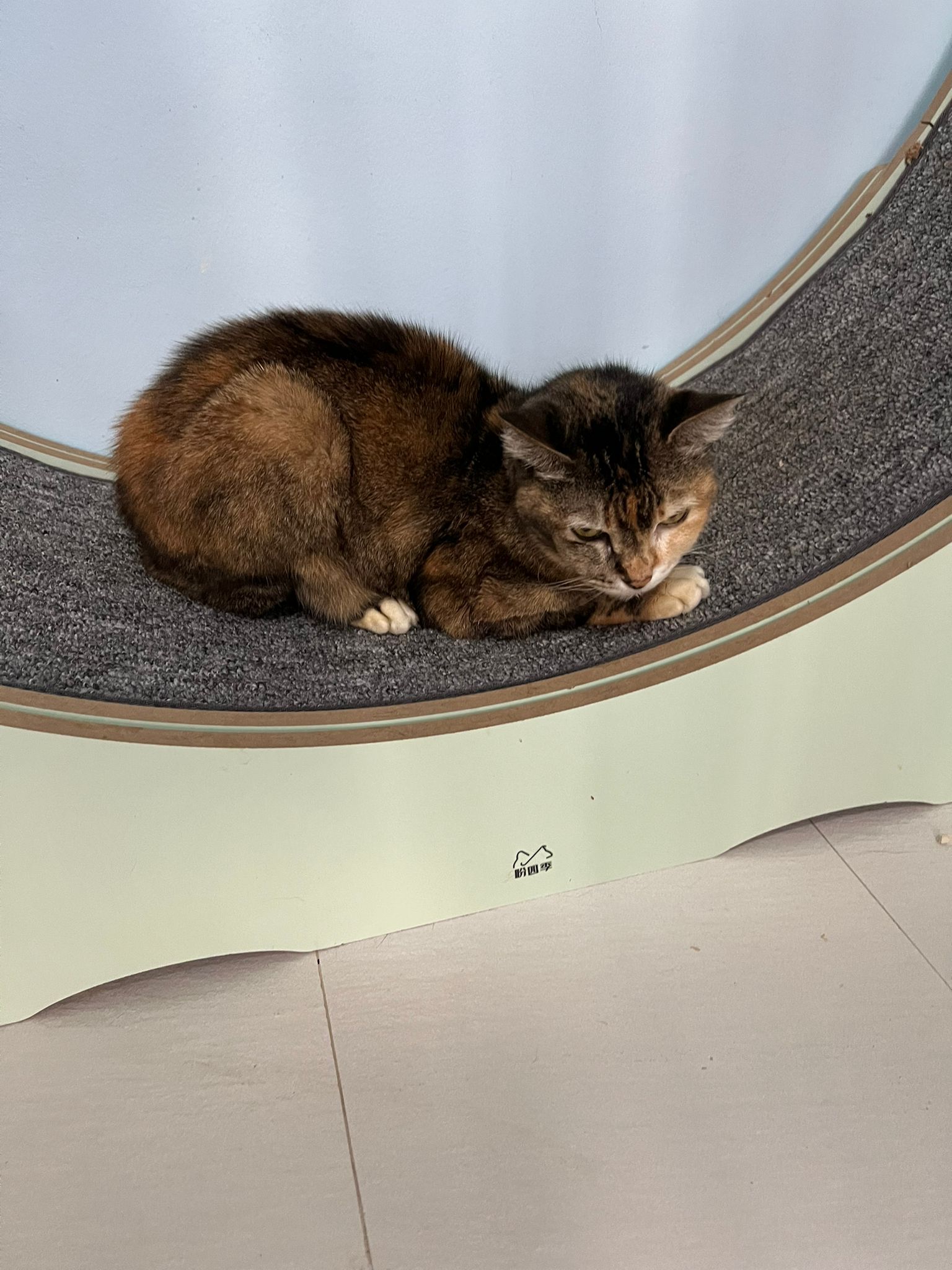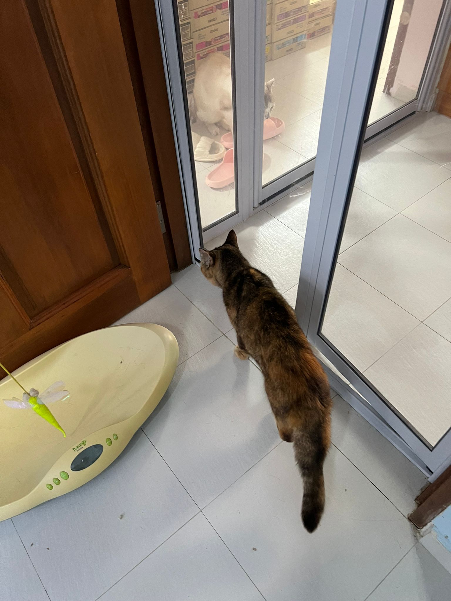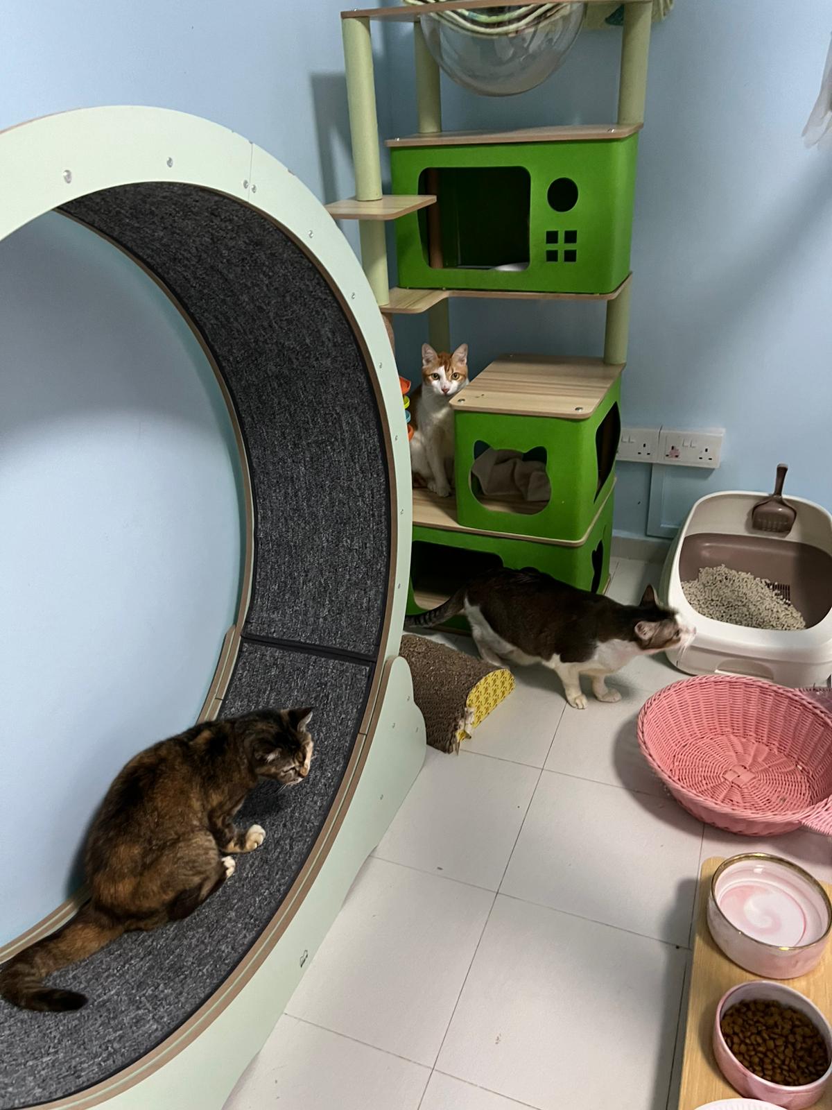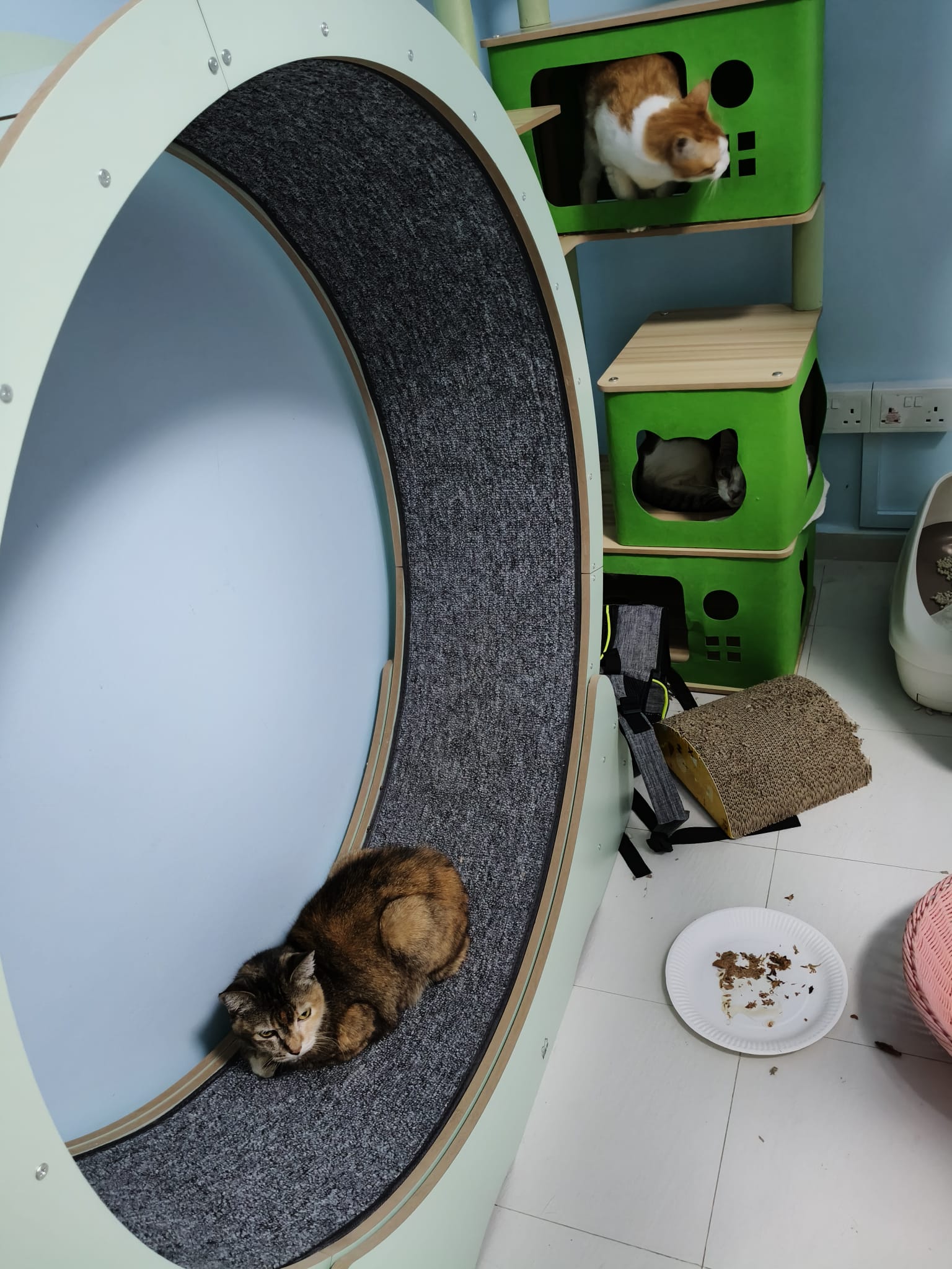10am+: Today cherie don’t hiss at him alr. Even when his face is facing hers 1cm apart. Like got sit on the wheel. I’ll wait for her to go home then bring the wheel to 猫房 tv room.