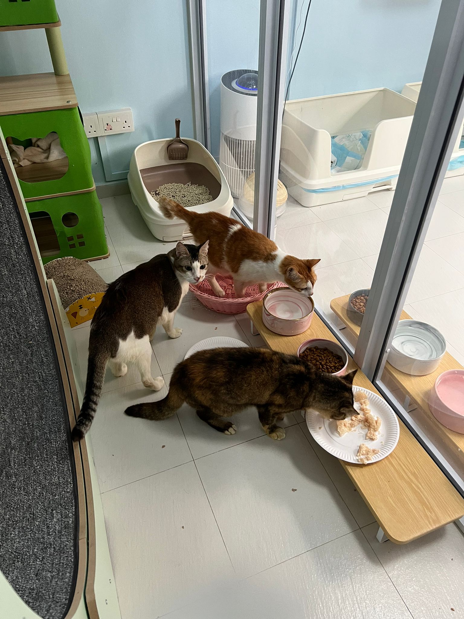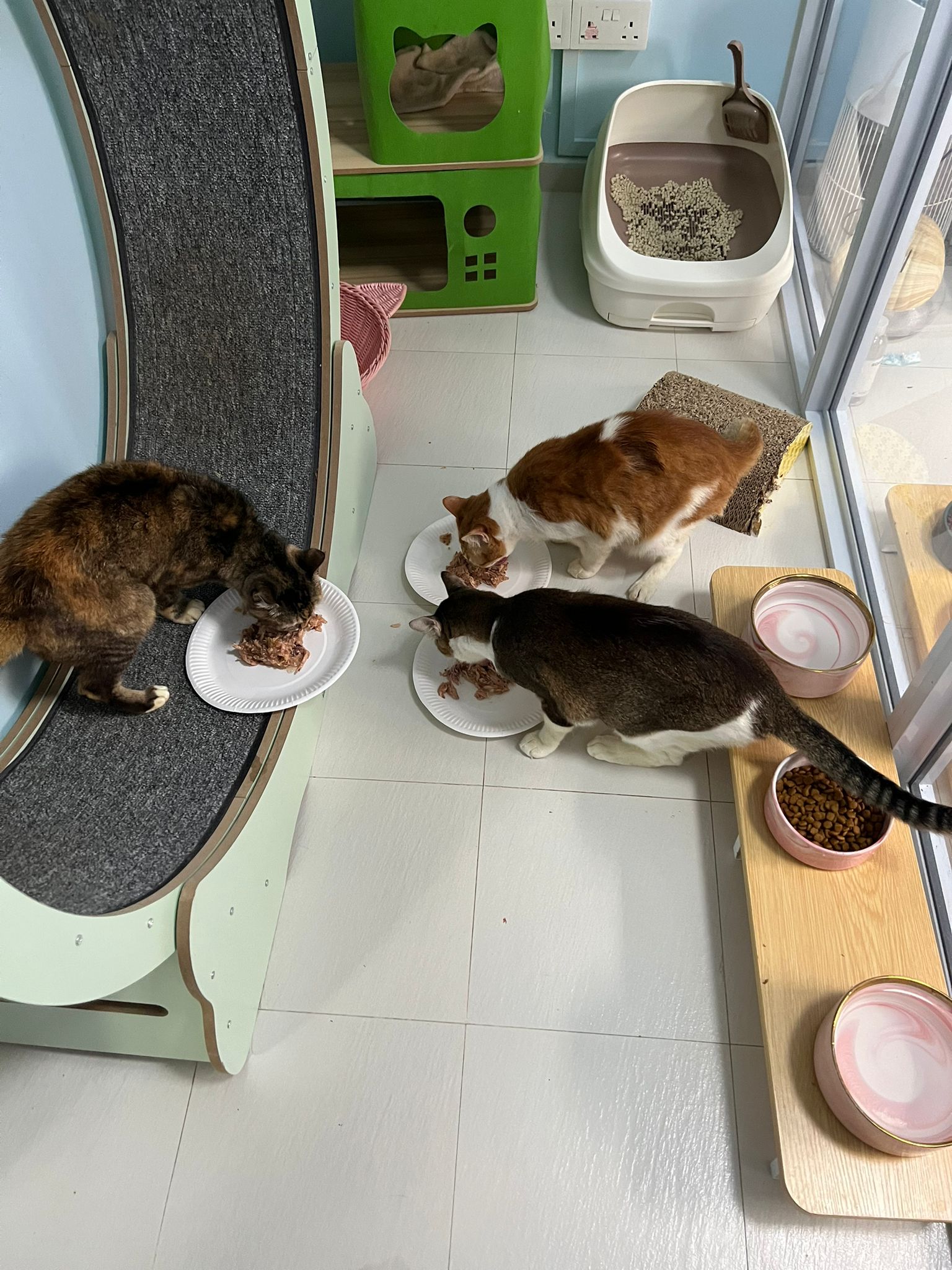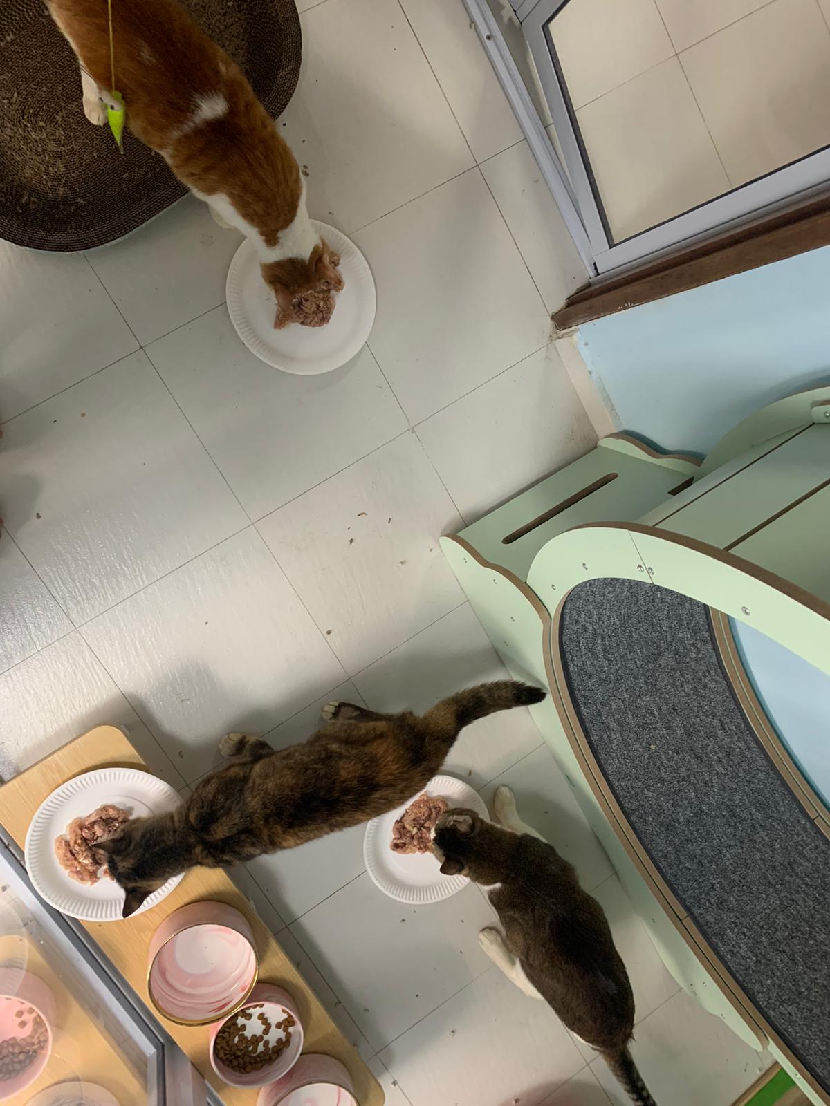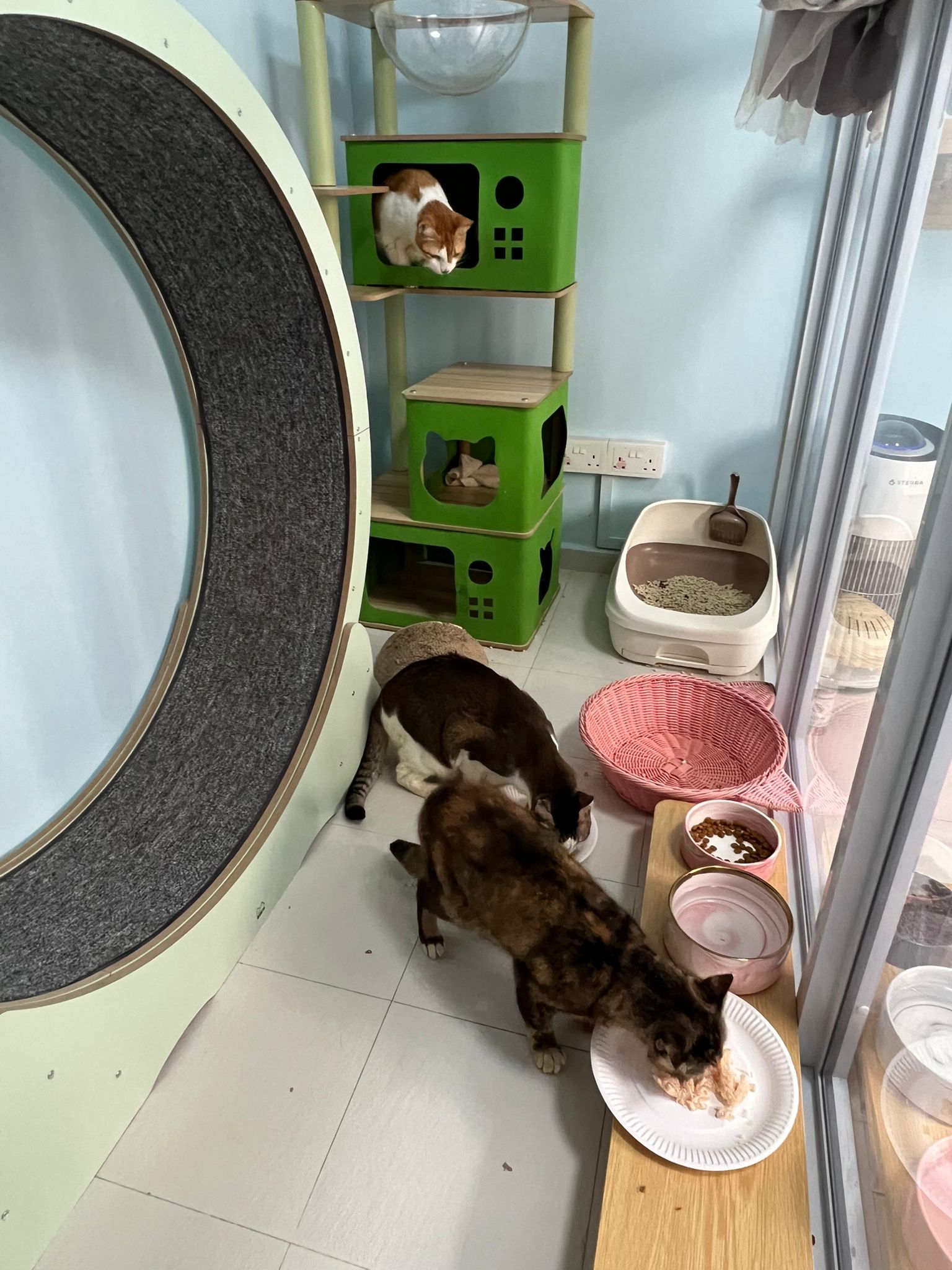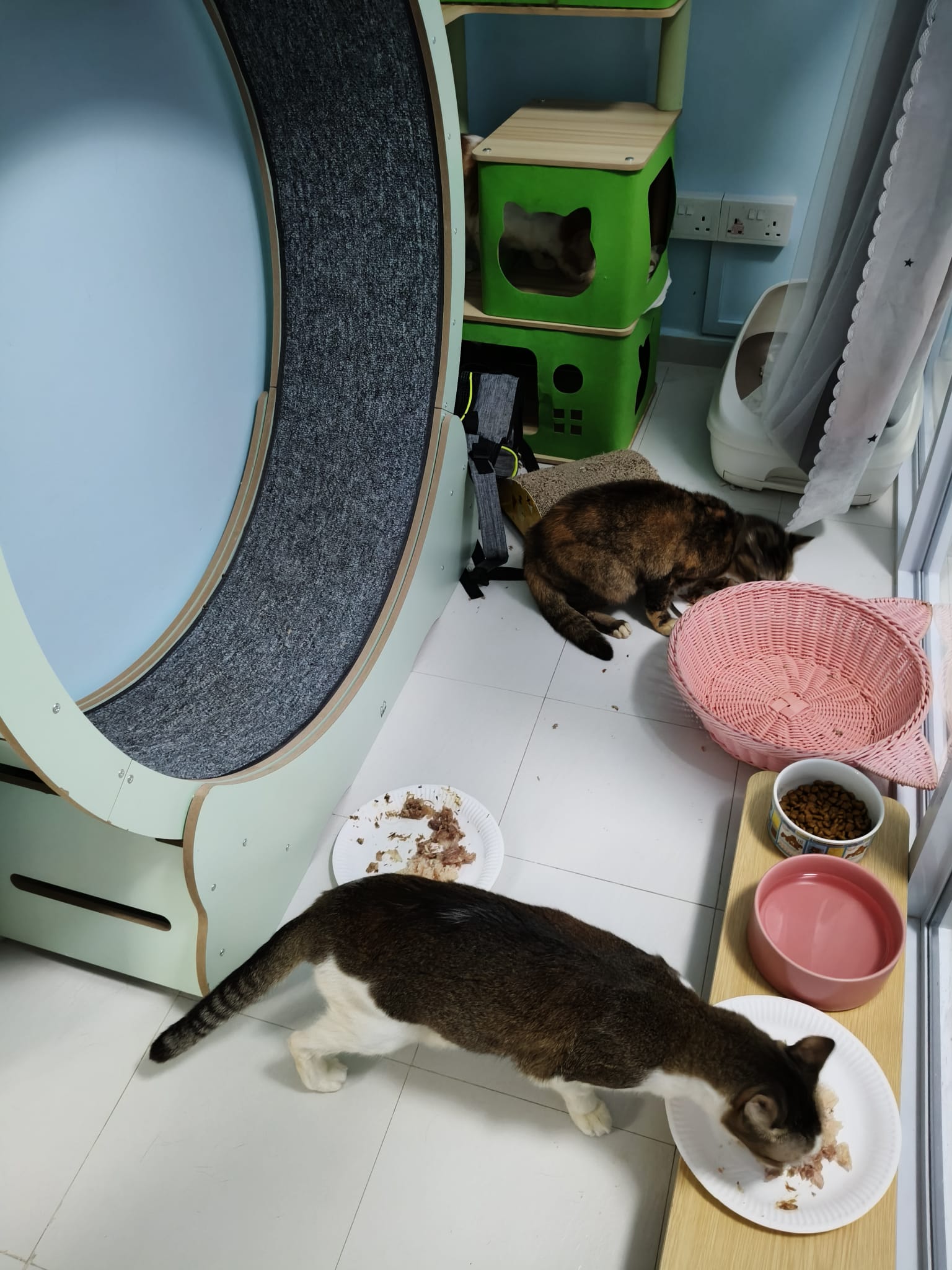 9Am+: all 3 of them eat tgt. 2 sets of poo today, one obviously from boy the poo so thick. But both sets quite dark. All wet food polished. Kibble also gone. They like feline natural.