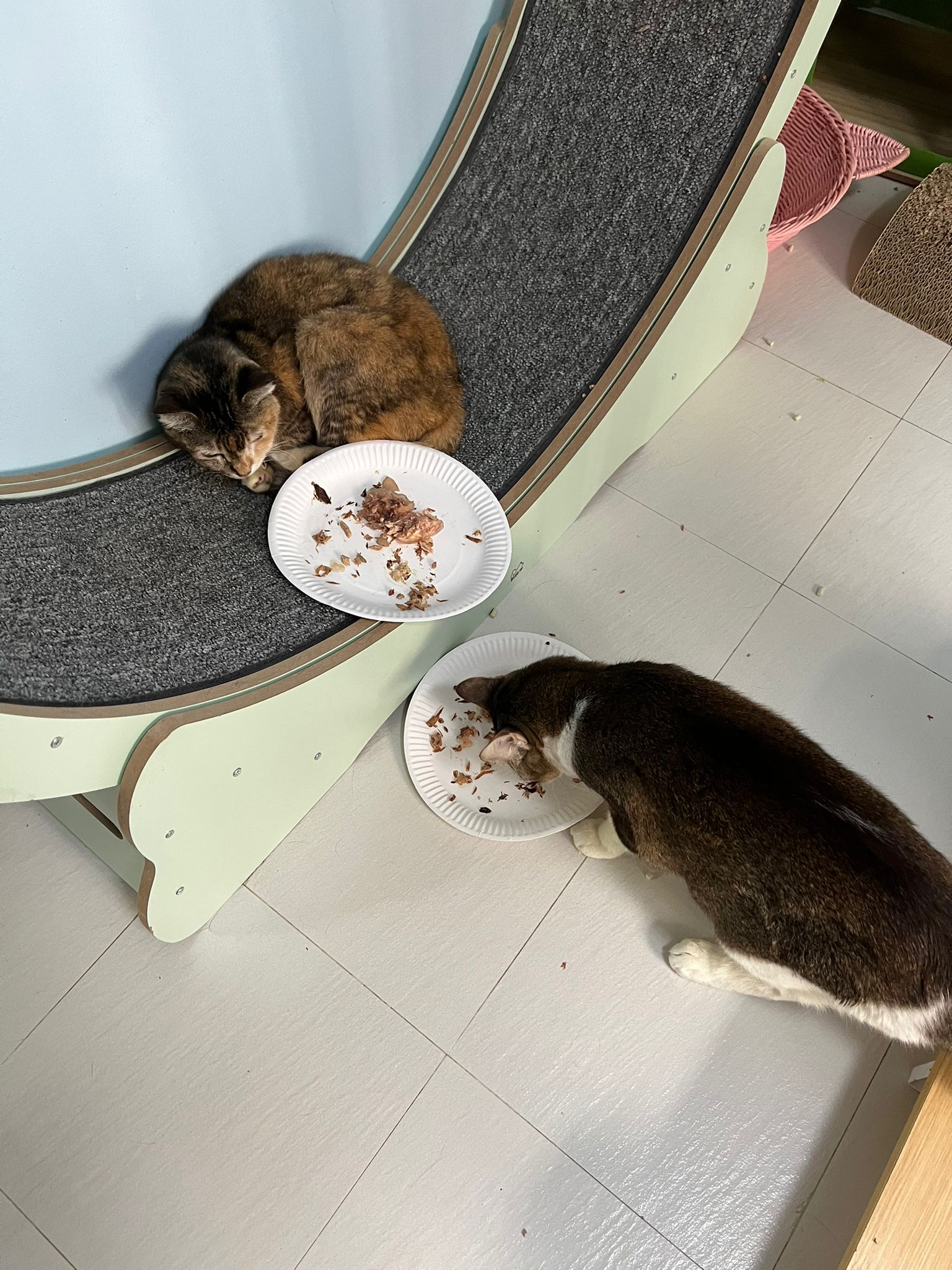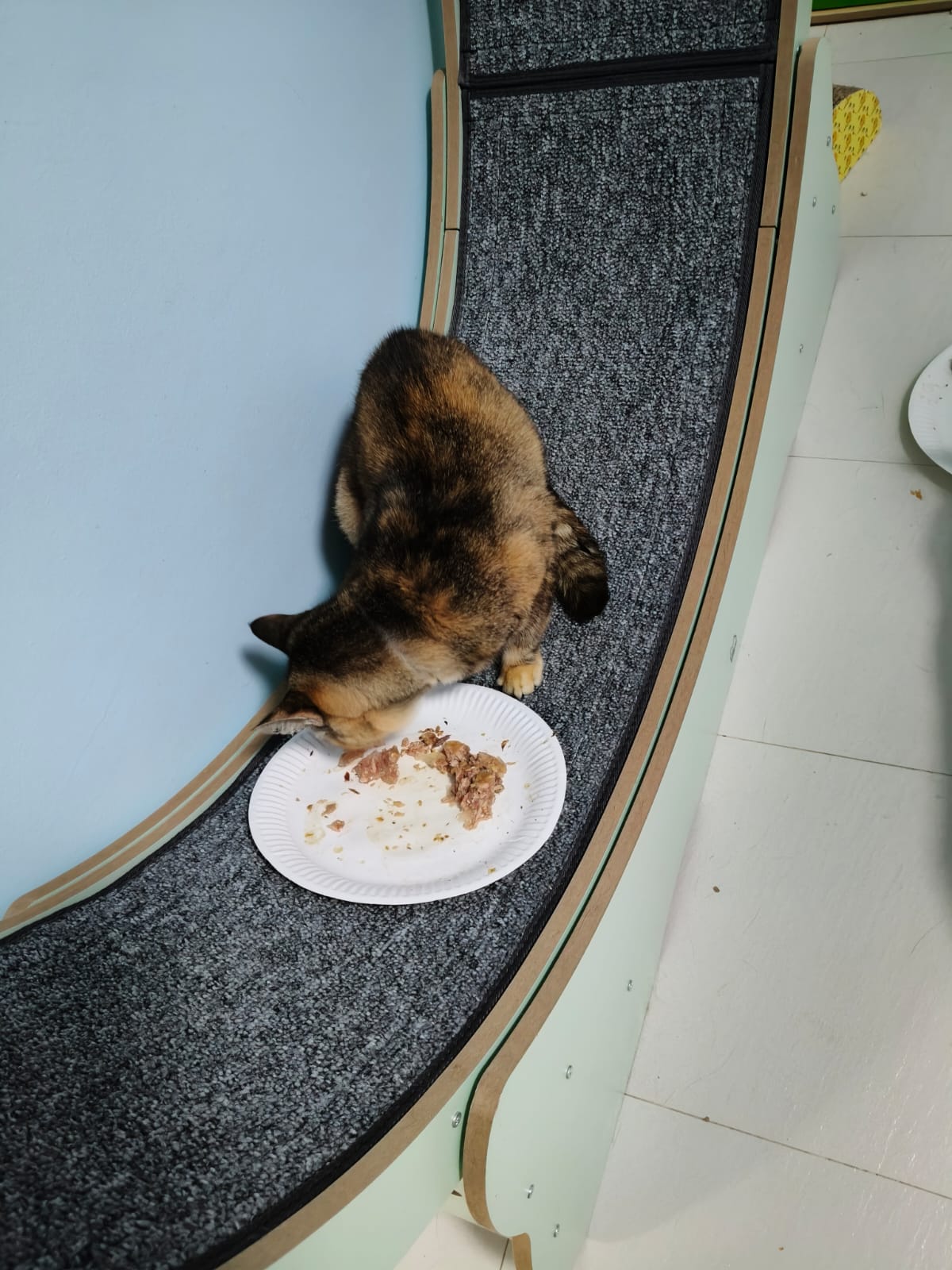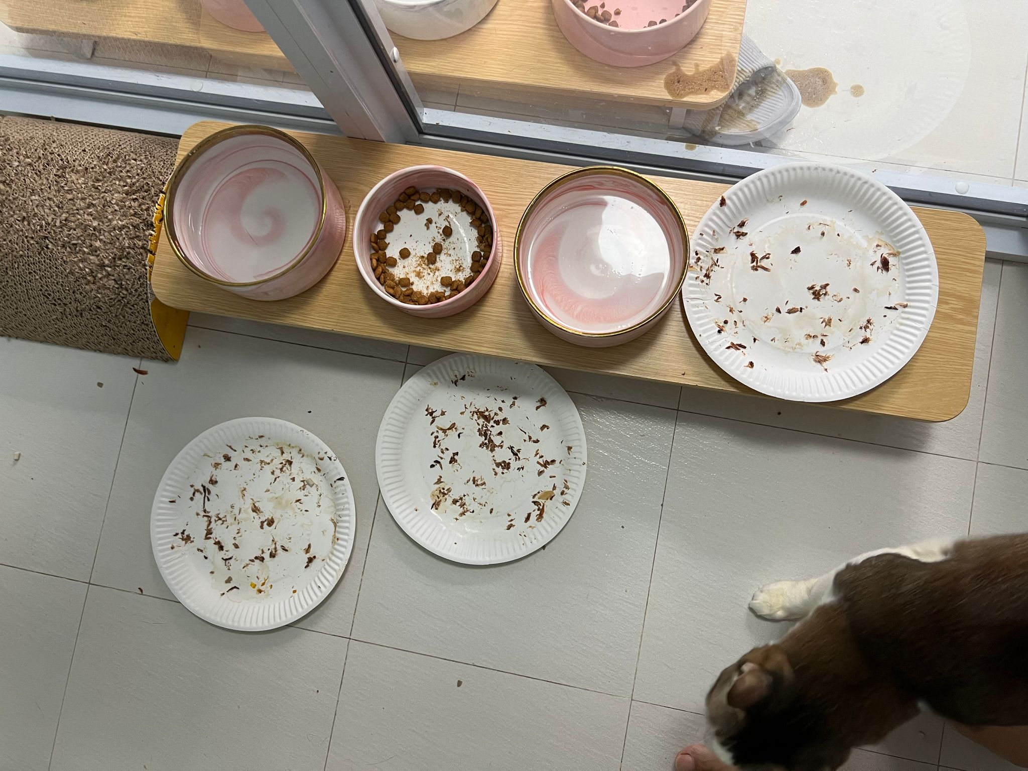10am+: wa their room 3 plates all quite full, like 2.5 plates left untouched, it’s tuna w pumpkin they don’t like ah.