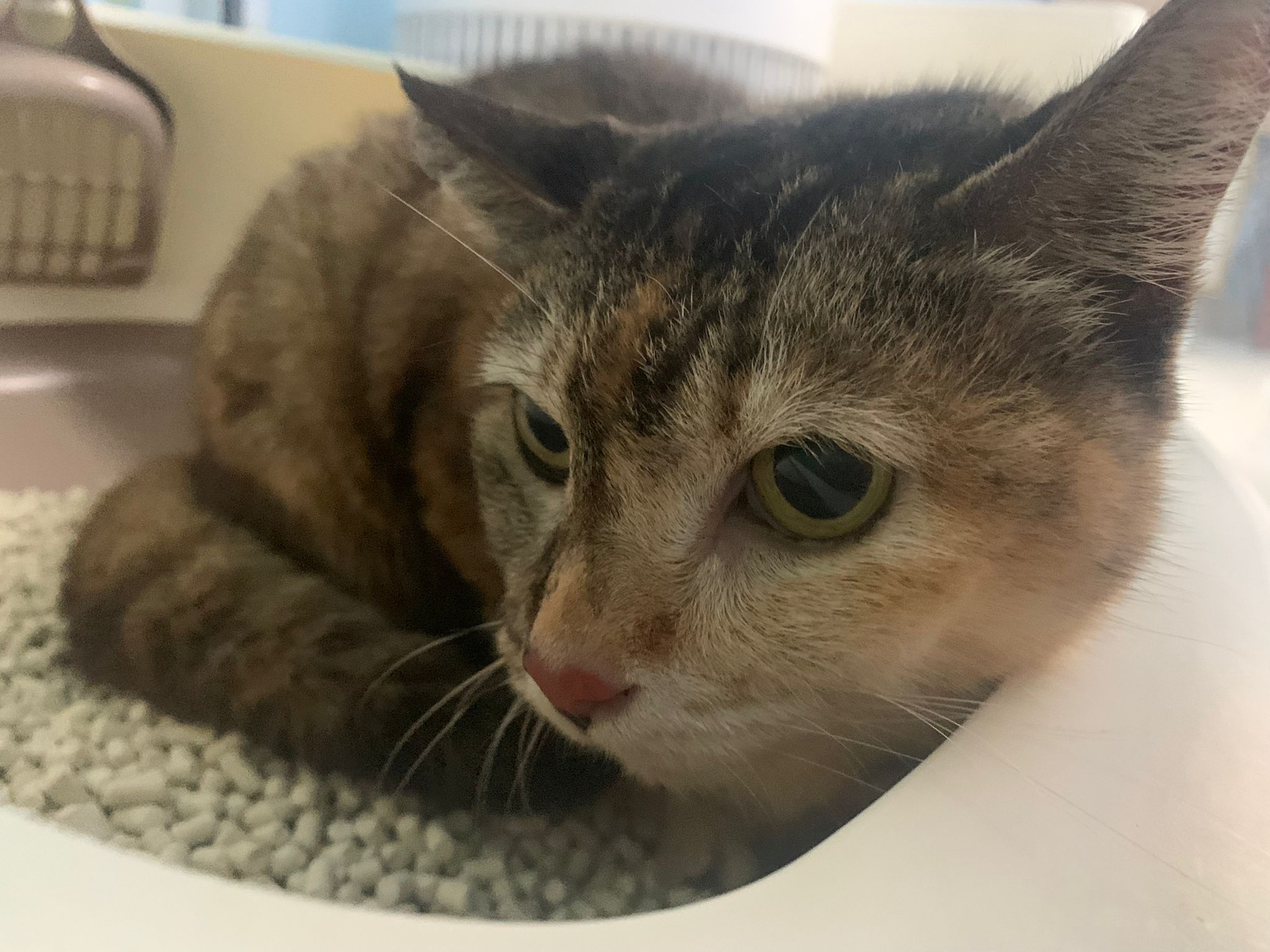 Brush her fur and she eventually sit in bin, not sure is it unhappy that I put her back in carrier cos I weigh her. Don’t walk about anymore.