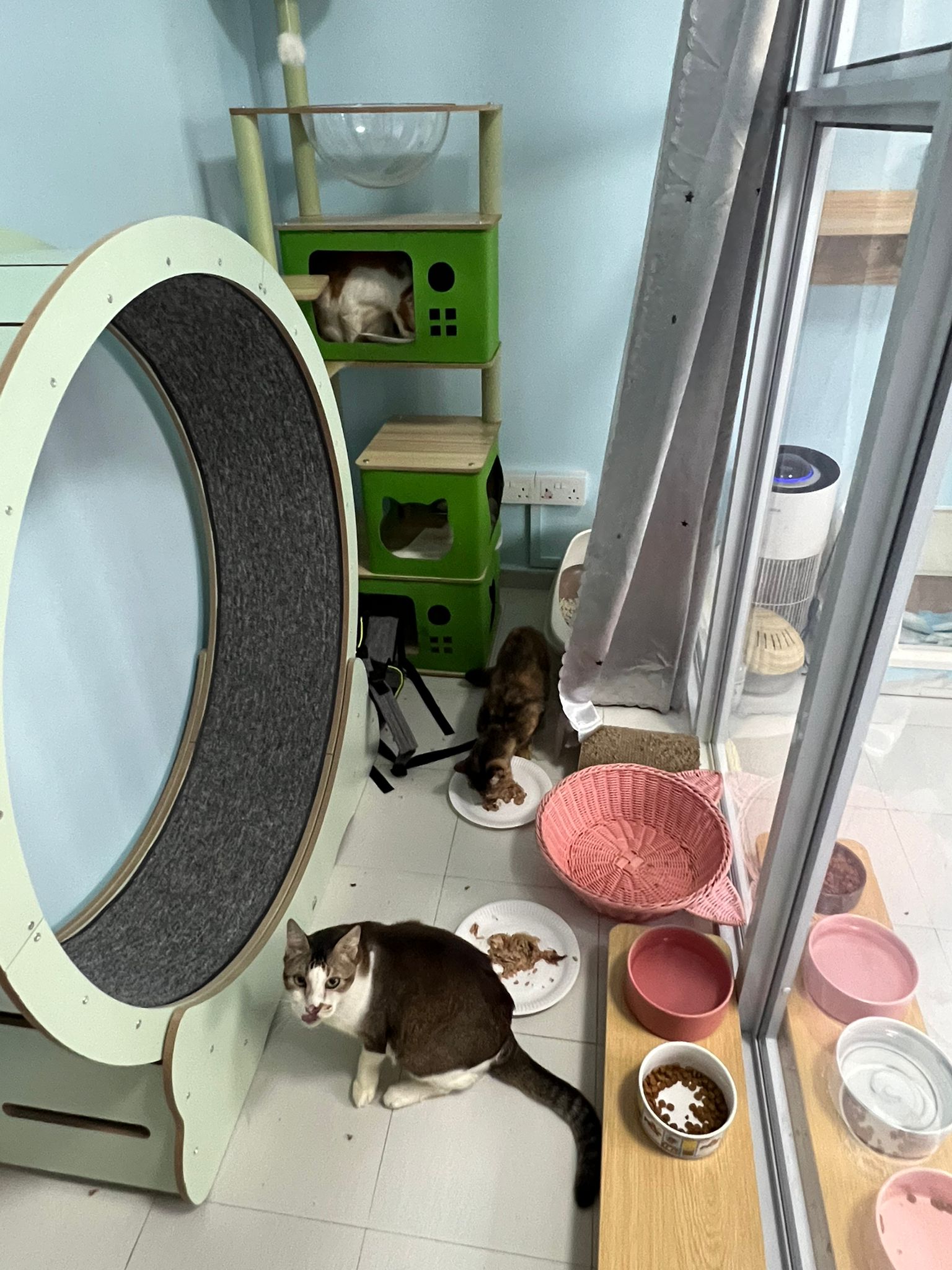 I check their bin, for 3 days overnight – the pee amount is a lot, should be from her cos she is a kidney cat. Brush her a little, she like to sit on the wheel, didn’t exercise, I move the wheel a little and she run off. She allow sayang but like to hiss. On floor got 2 nails, think her nails dropping off. Cos she will use sb here. I put in one more oval sb for her, didn’t see them use it yet.
