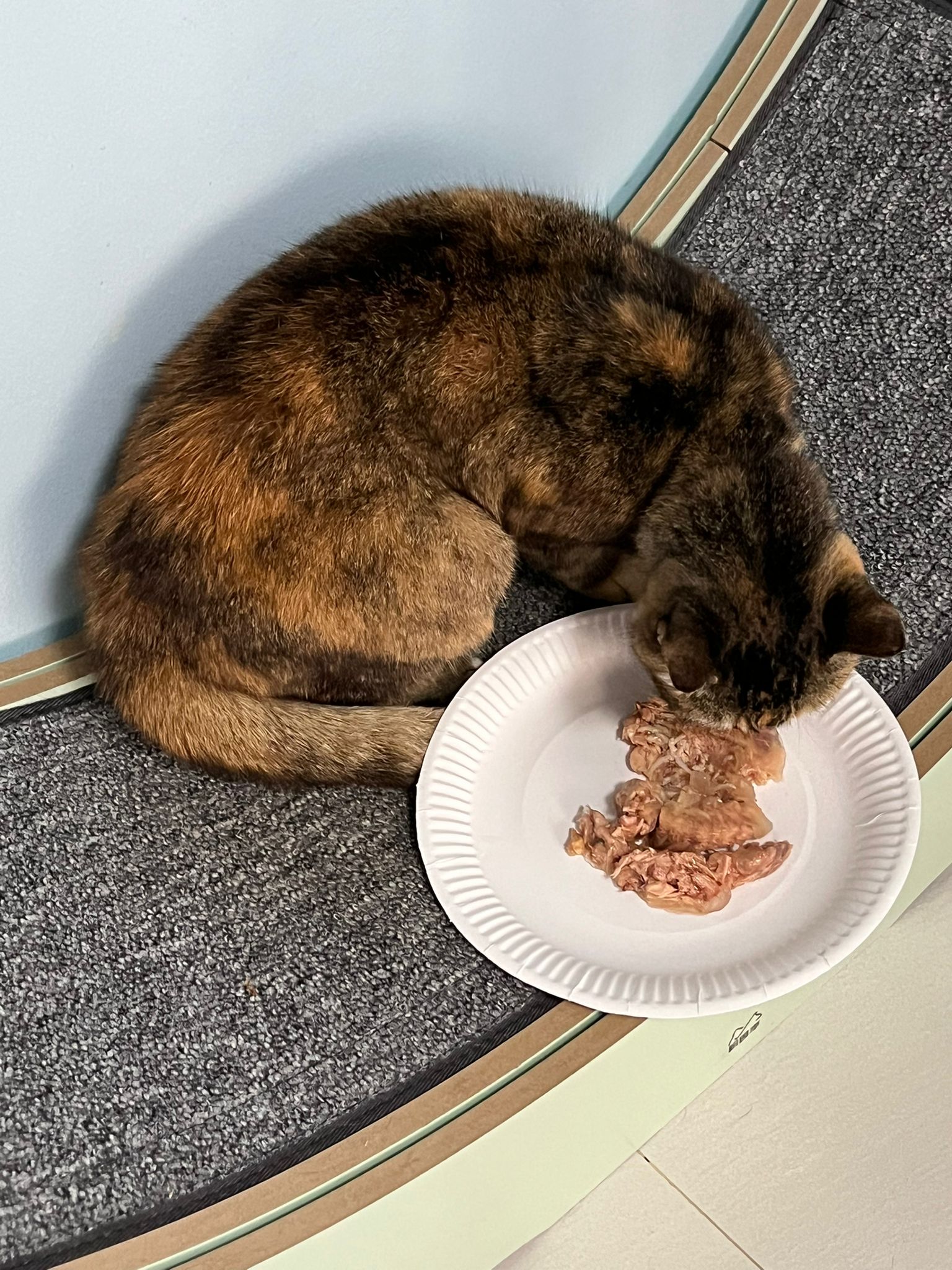 10am+: serve extra RC tuna w chicken for her, put directly for her on the wheel and she didn’t eat direct. so later see who will finish it.