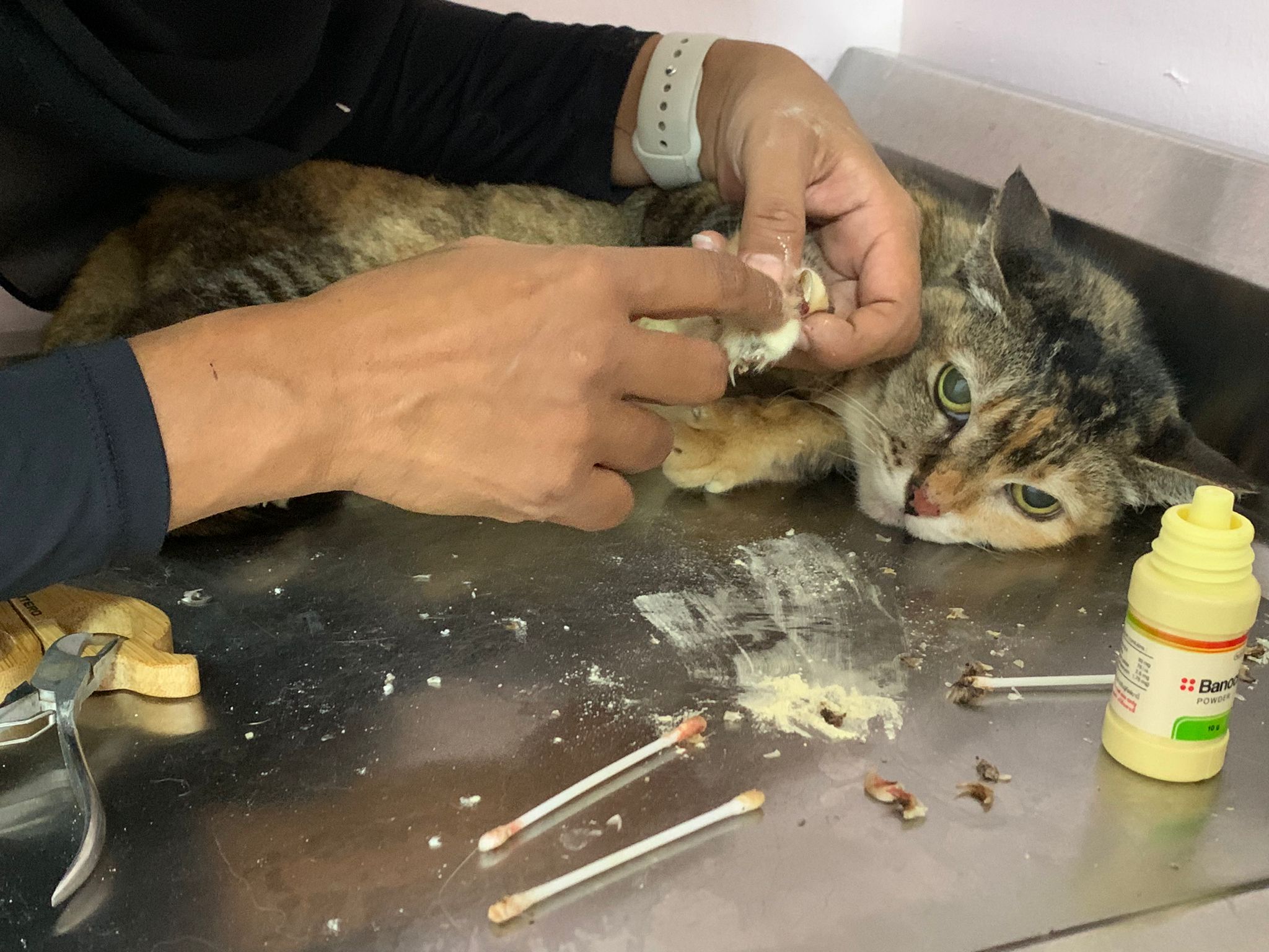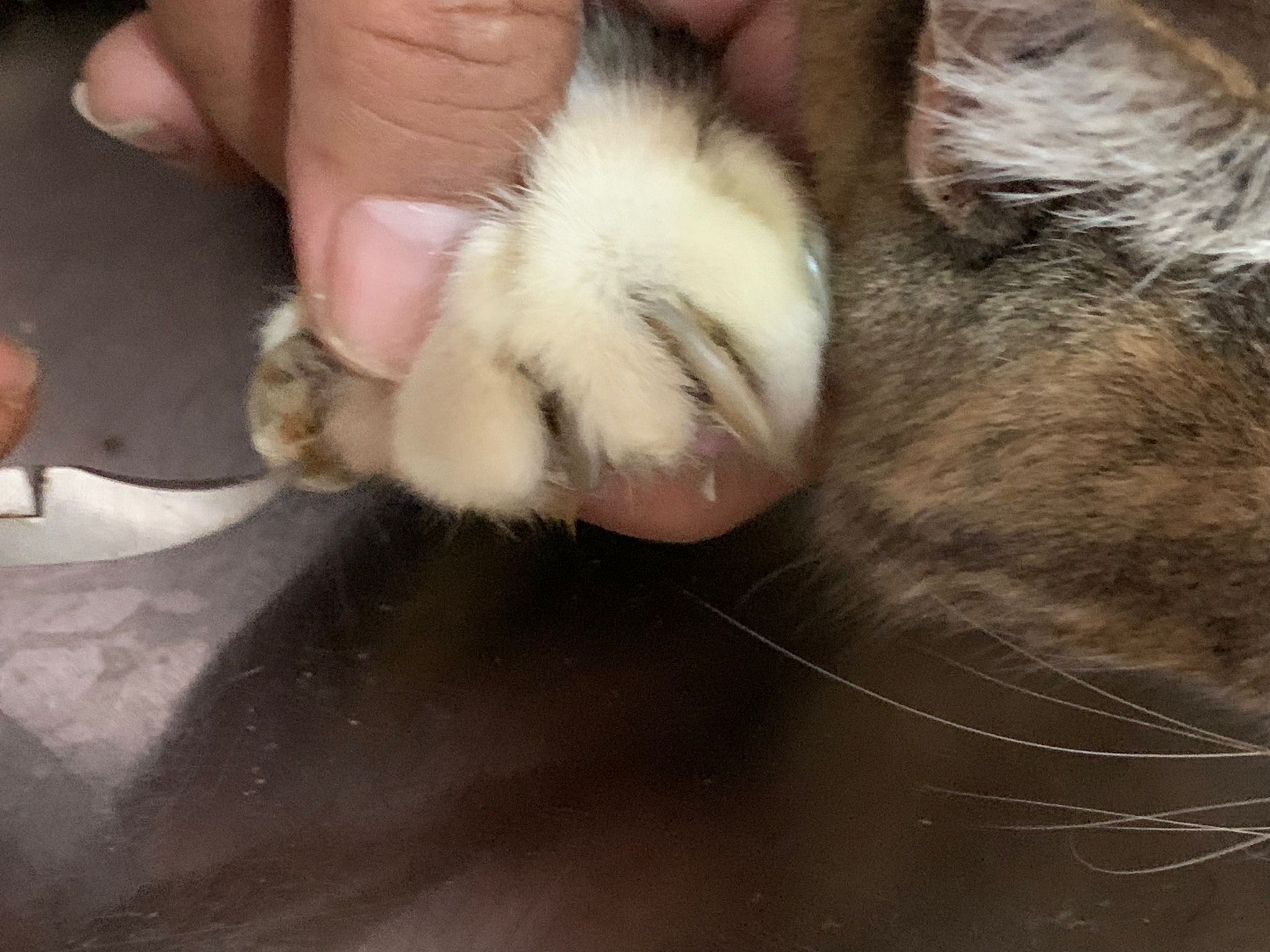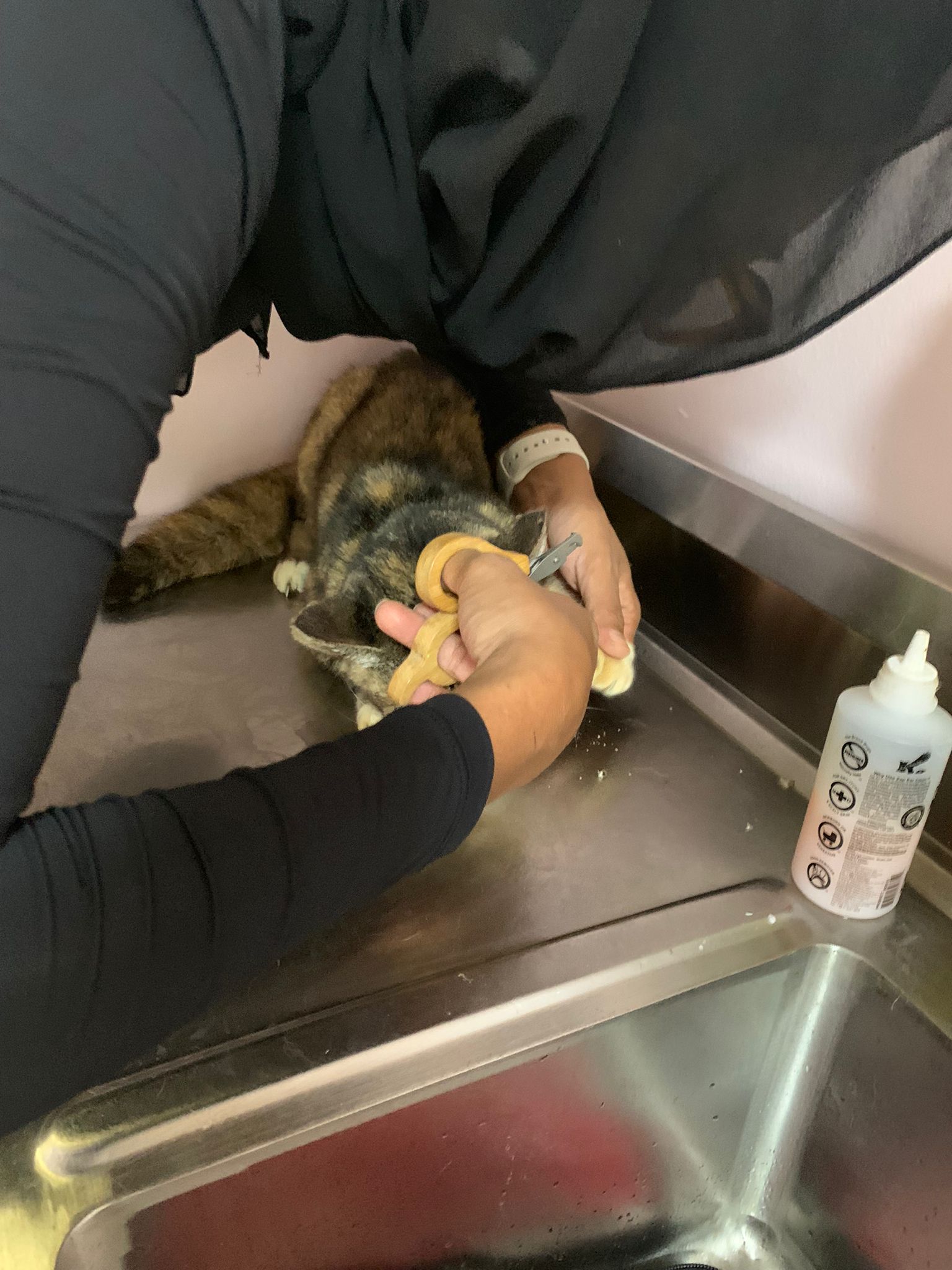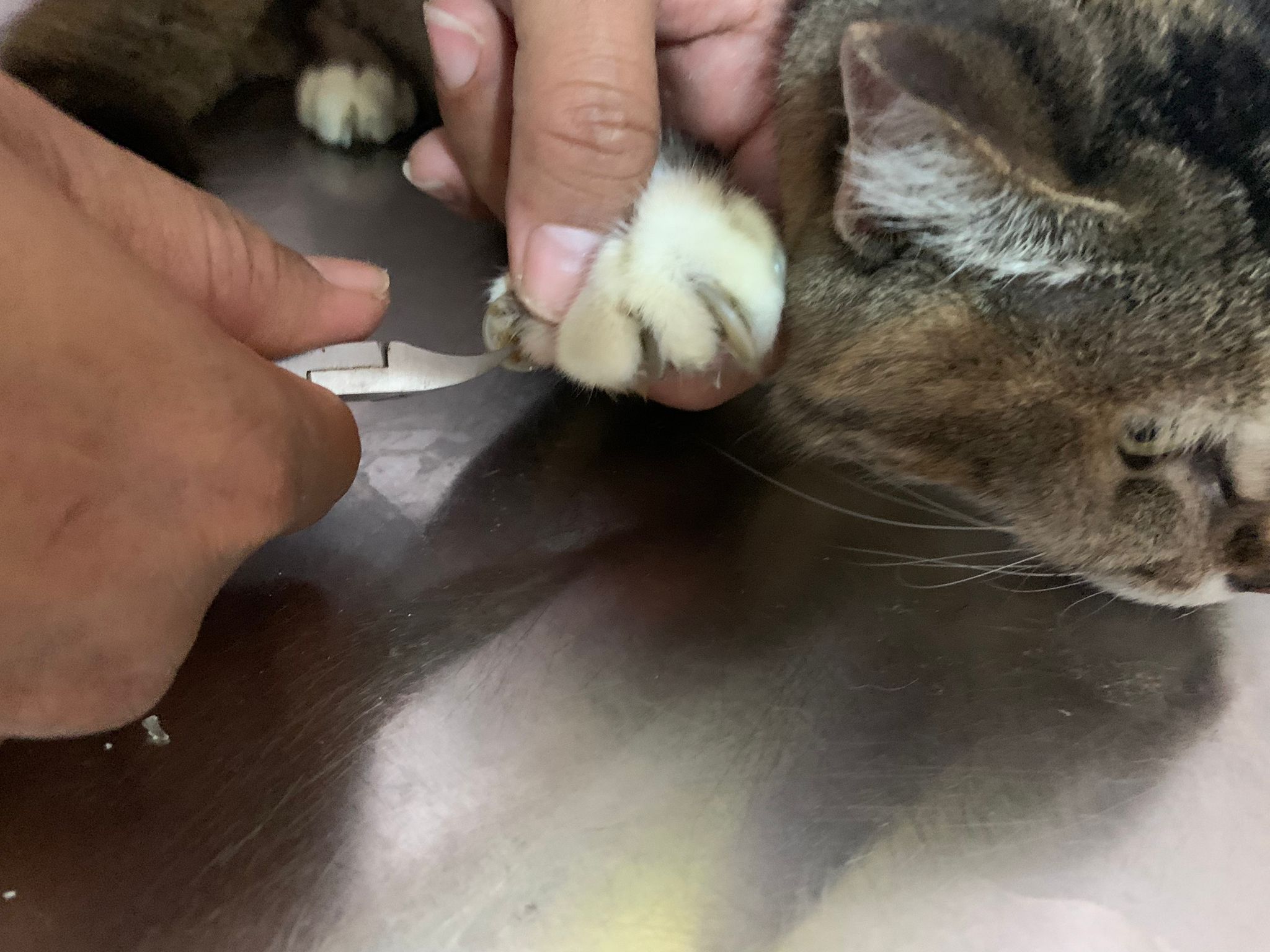 11am+: first to groom cos their nails ingrowth. She is much steadier than expected. Only once she wanna snap cos the right paw all ingrowth, one section swollen. Both front paws use lots of ab powder. She is calm in 猫房. Nails cut very long for her.
