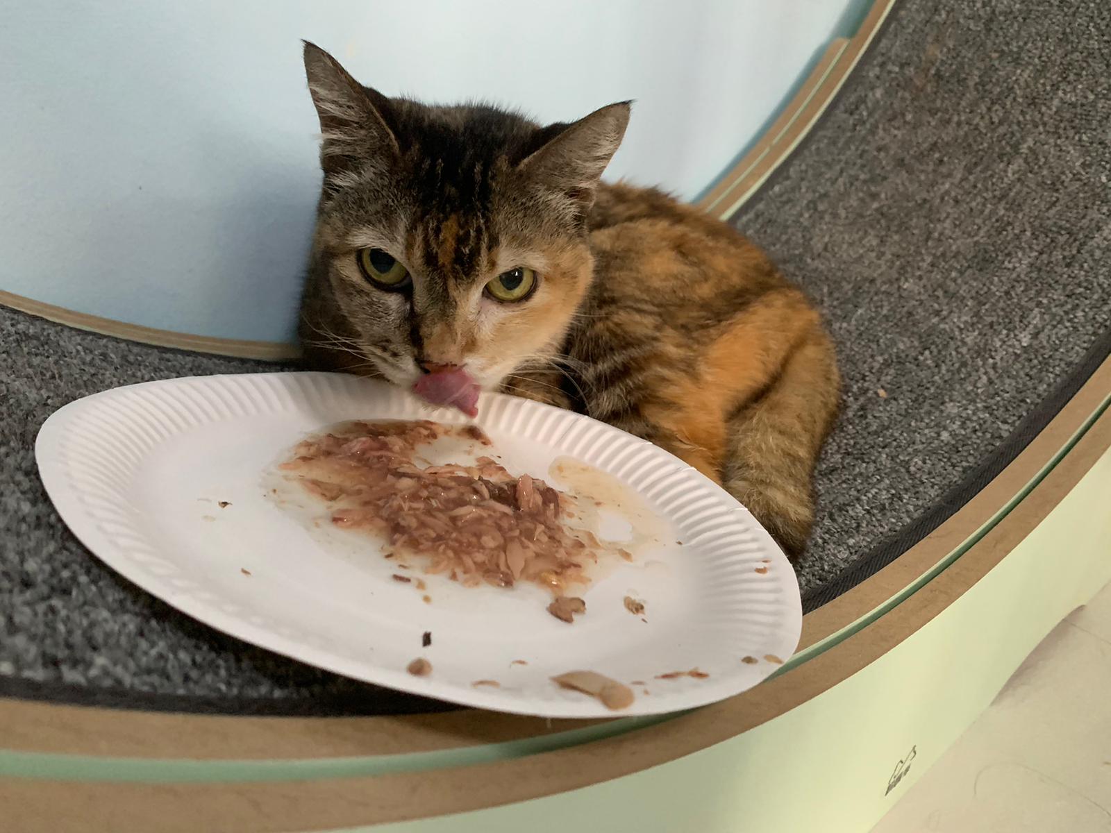 +: all good plate empty. No poo. Jo serve tuna food all got eat. The kibble bowl w the ba woo Erm … they don’t like branded treats ah? Think they like The feline natural much more.