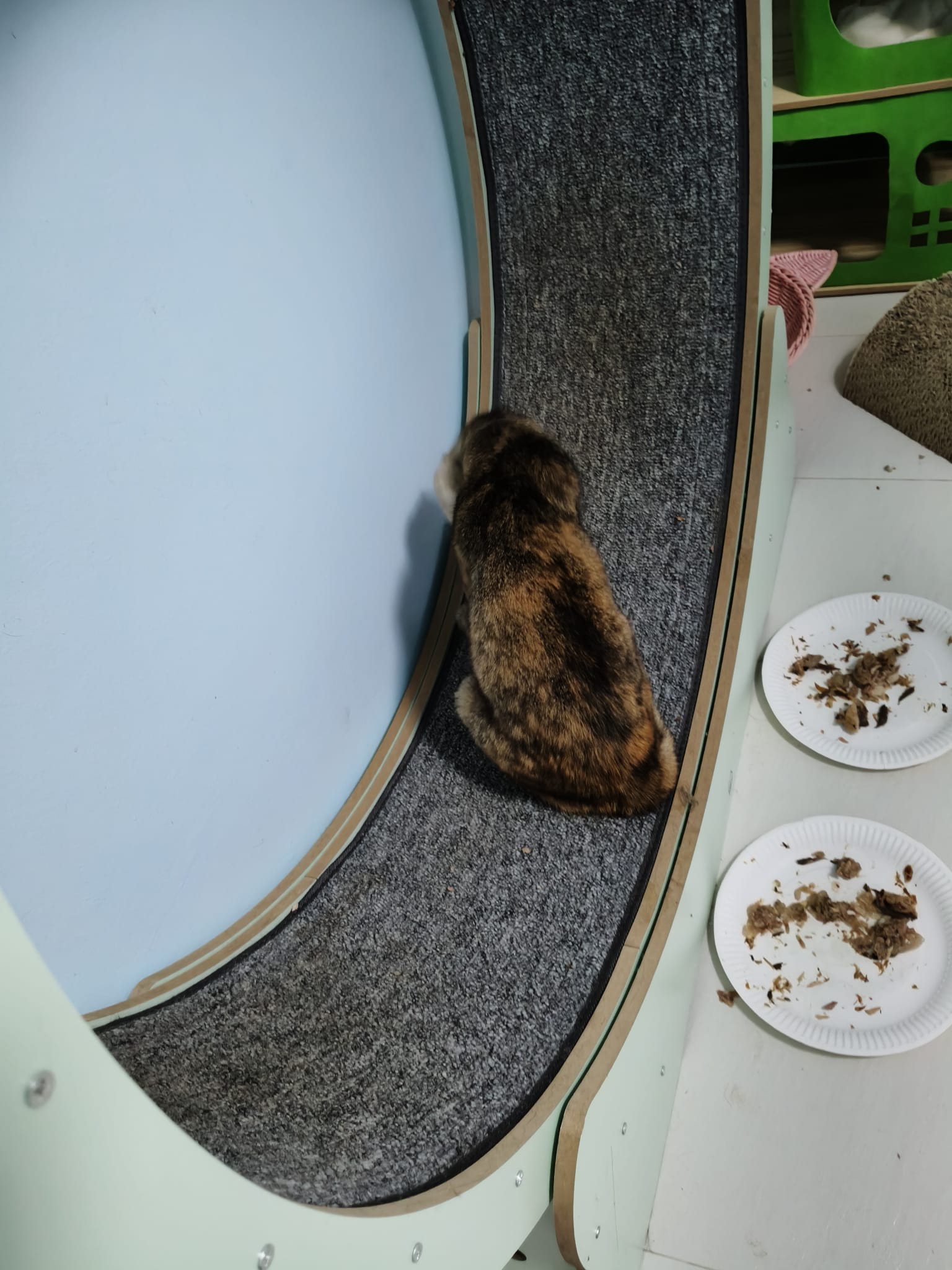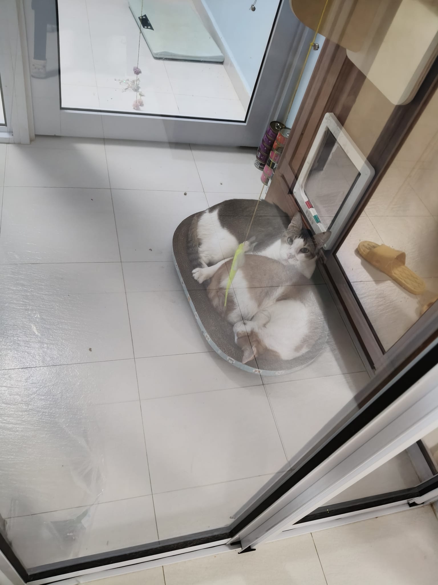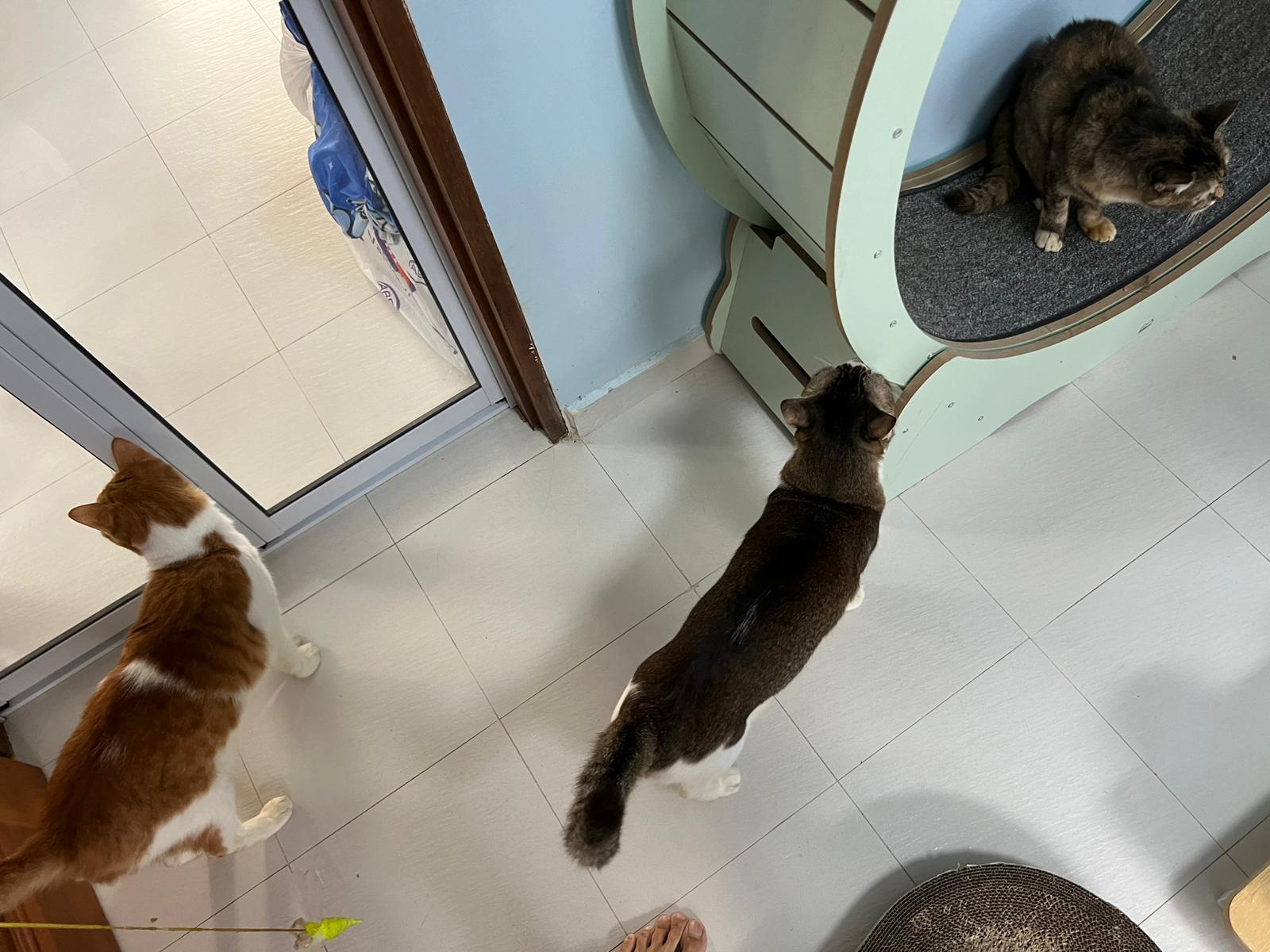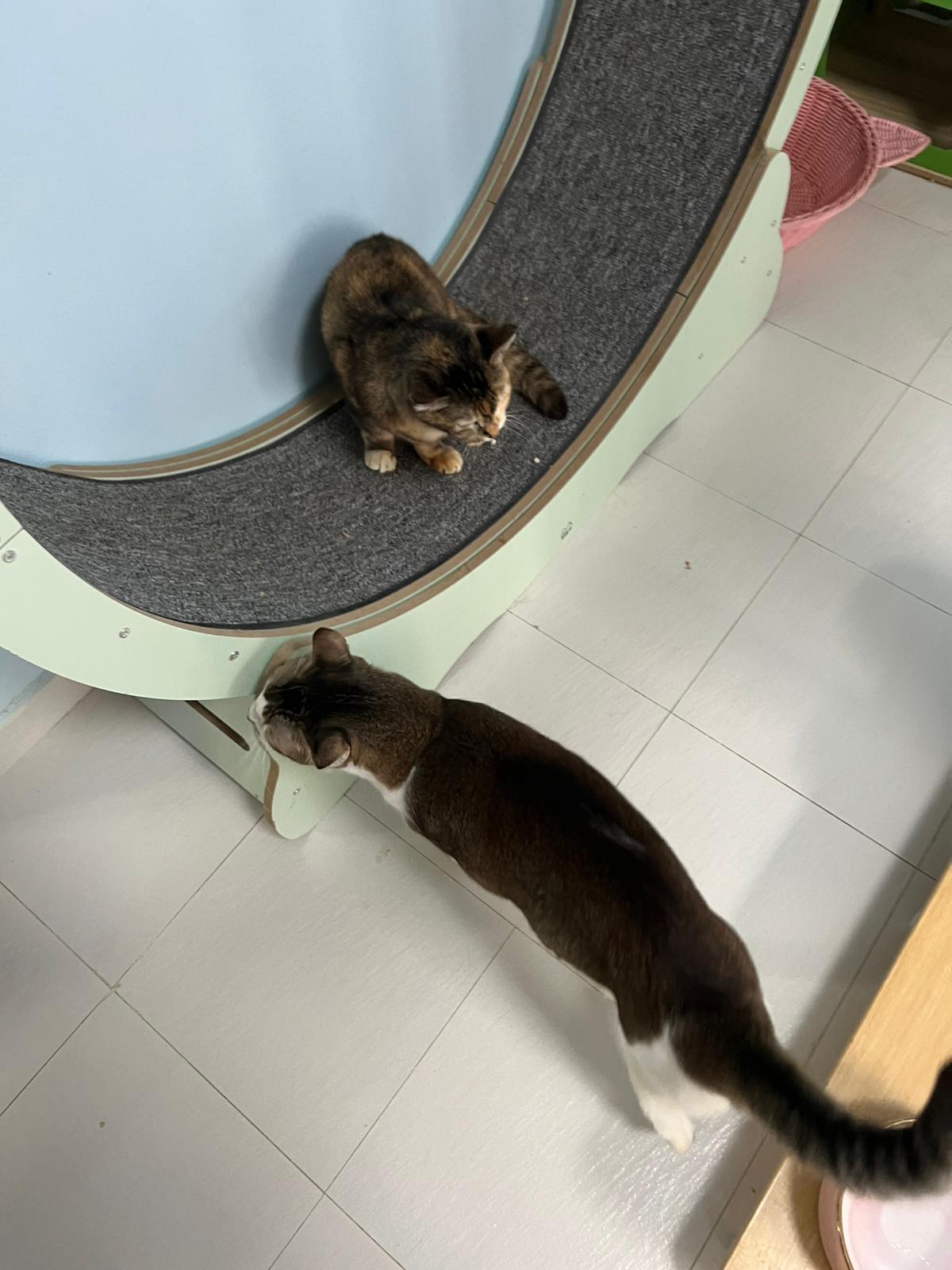 10am+: Today cherie don’t hiss at him alr. Even when his face is facing hers 1cm apart. Like got sit on the wheel. I’ll wait for her to go home then bring the wheel to 猫房 tv room.