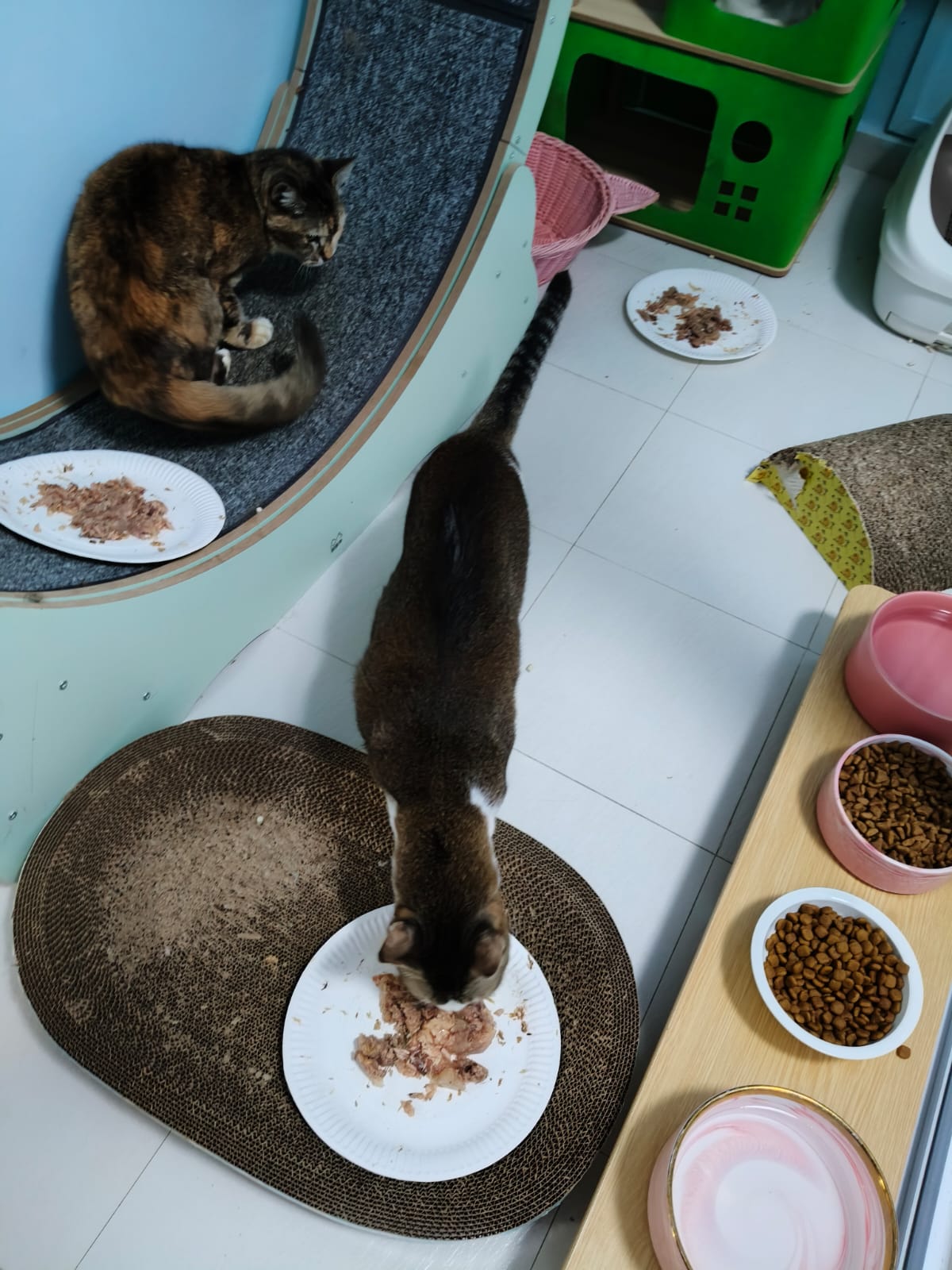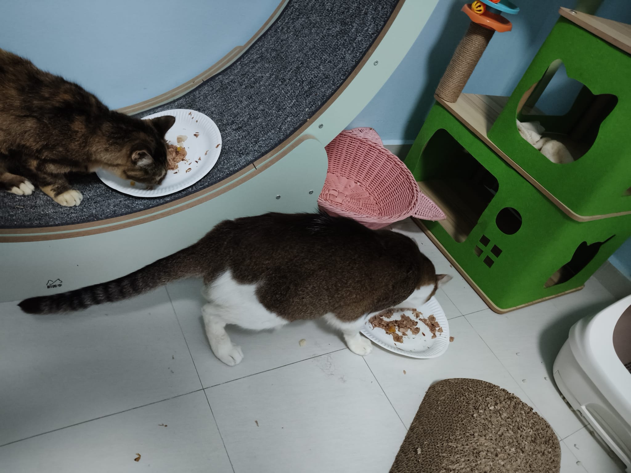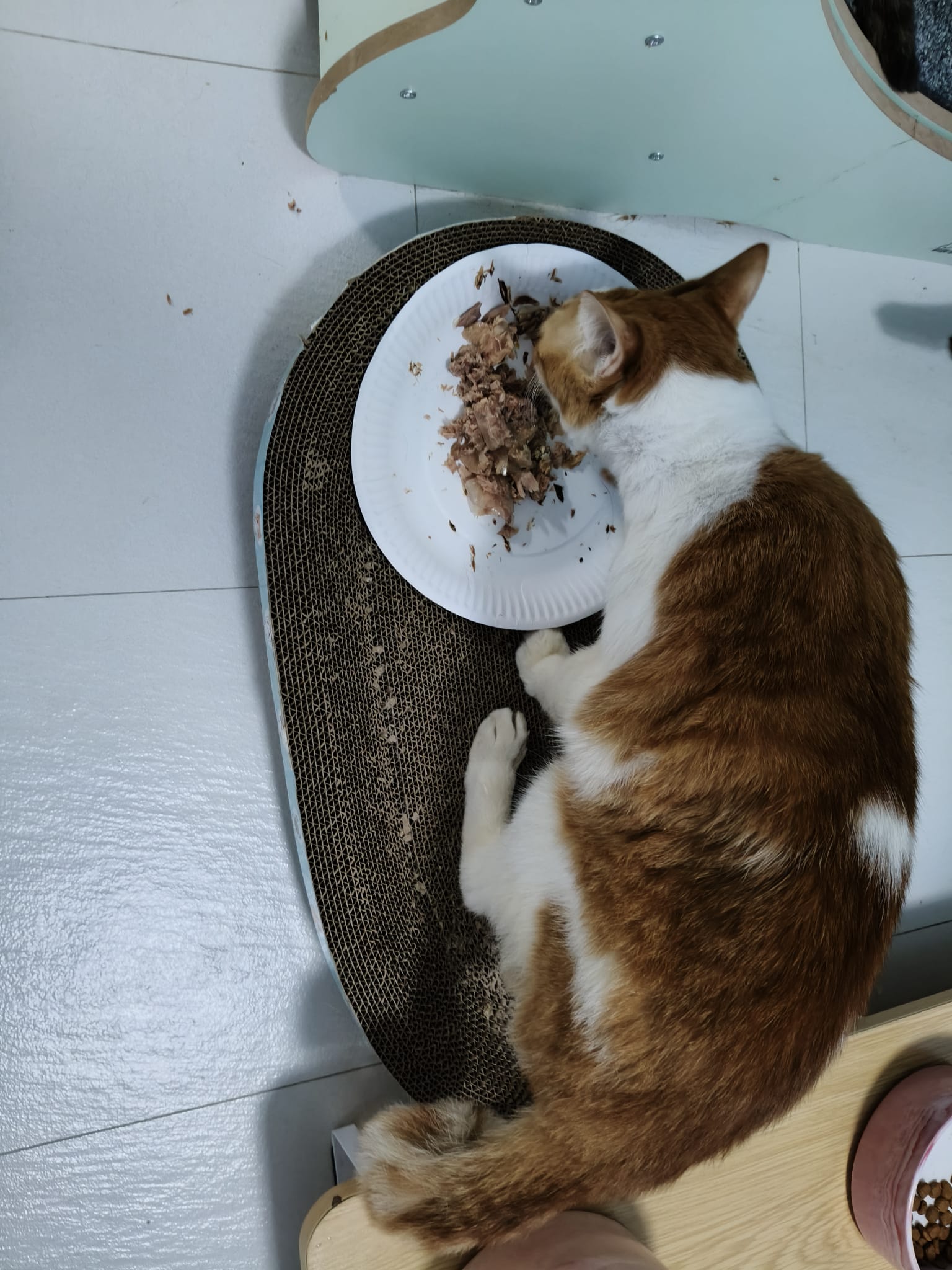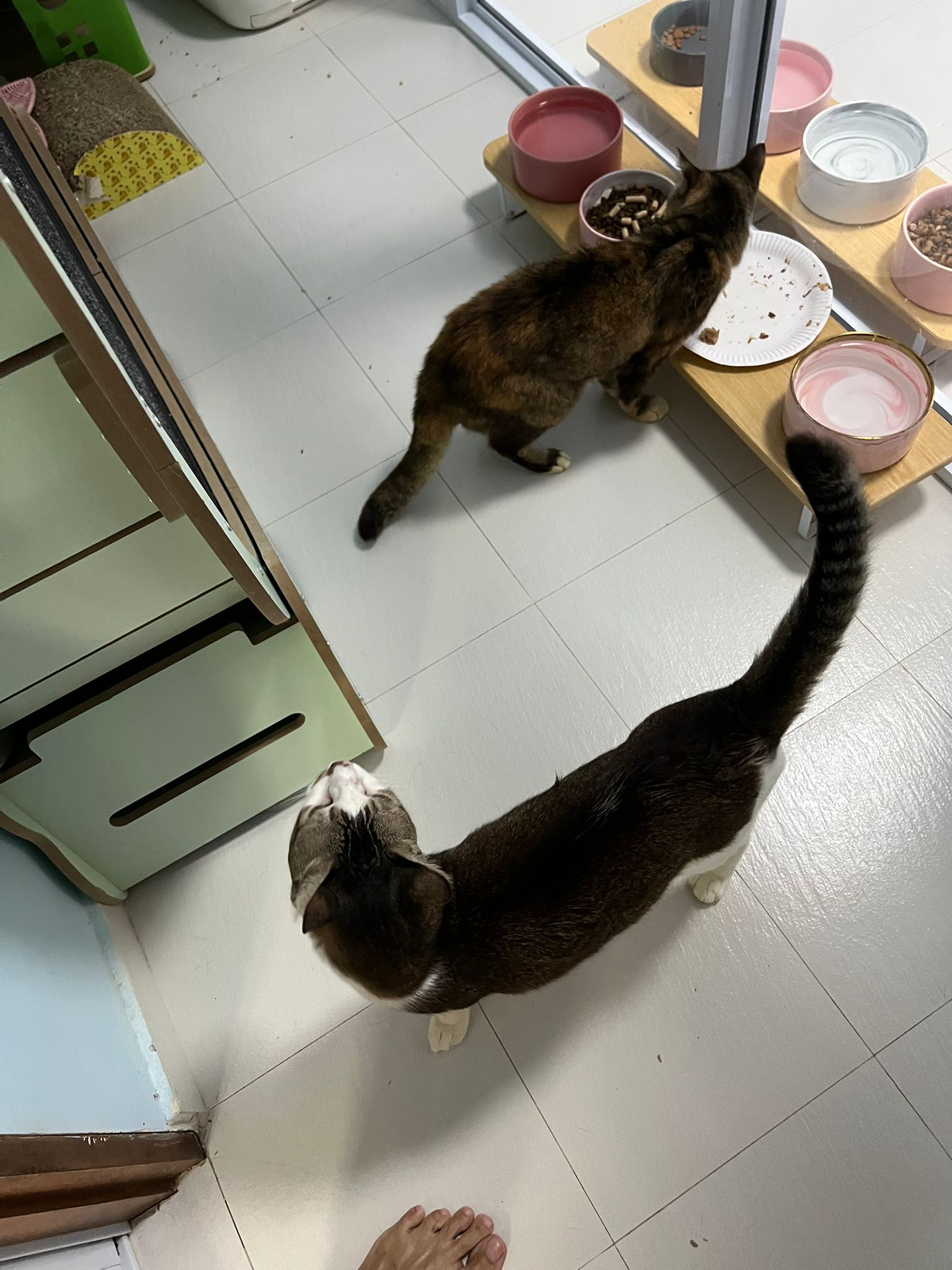 she meow at me to serve food wor. I thought is Benji. Given them tuna w white fish. They eat tgt.