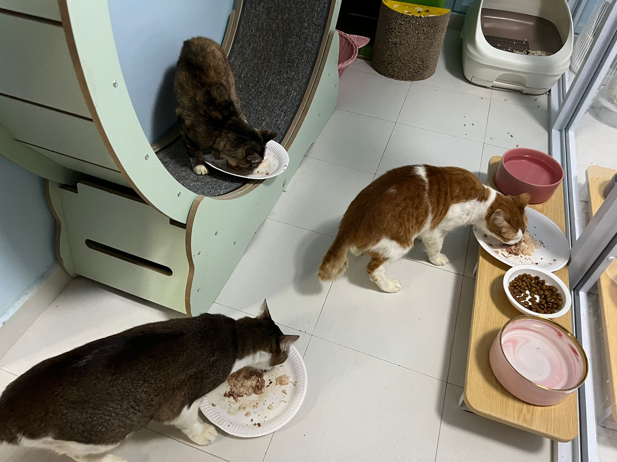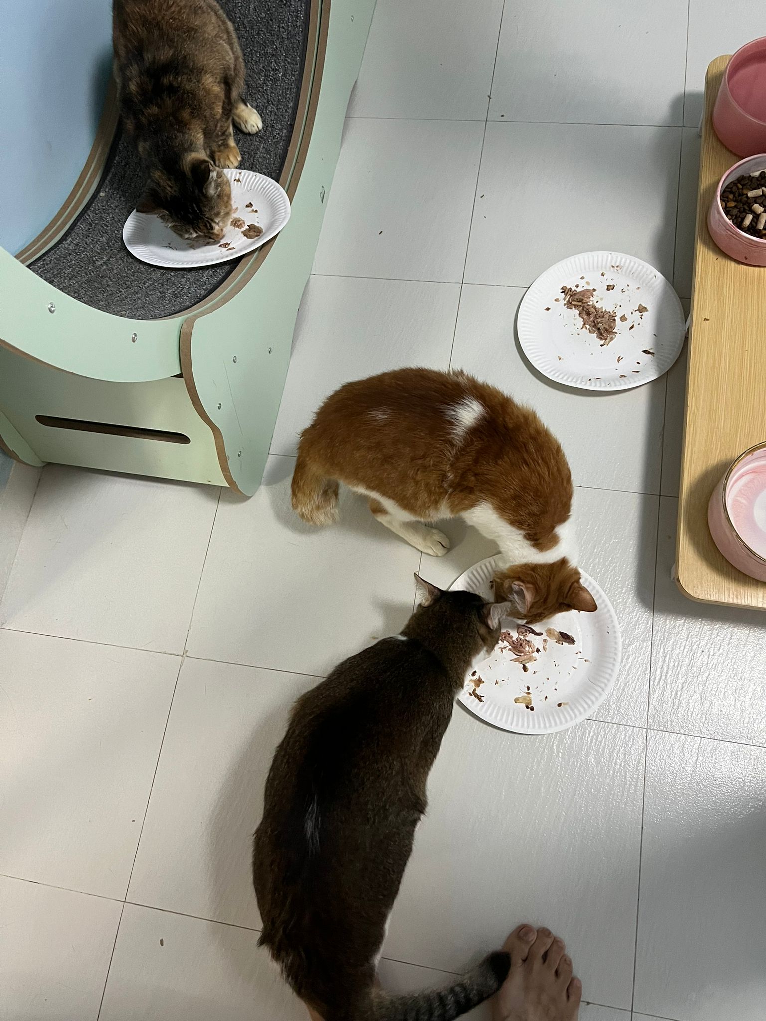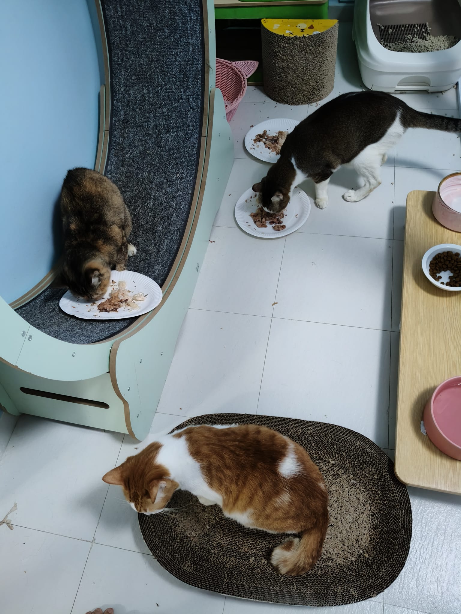 9Am+: all 3 of them eat tgt. 2 sets of poo today, one obviously from boy the poo so thick. But both sets quite dark. All wet food polished. Kibble also gone. They like feline natural.