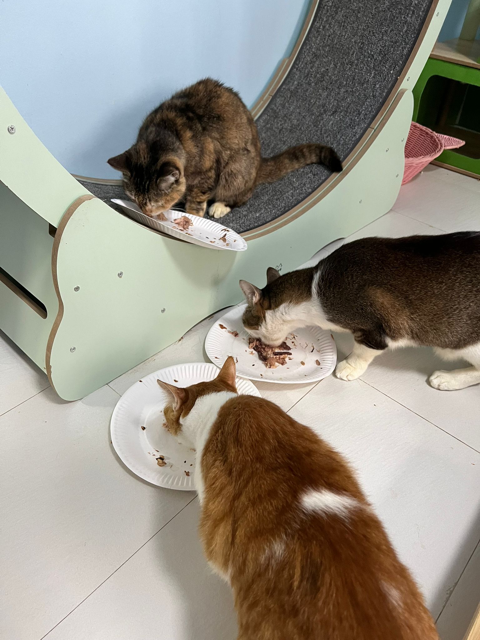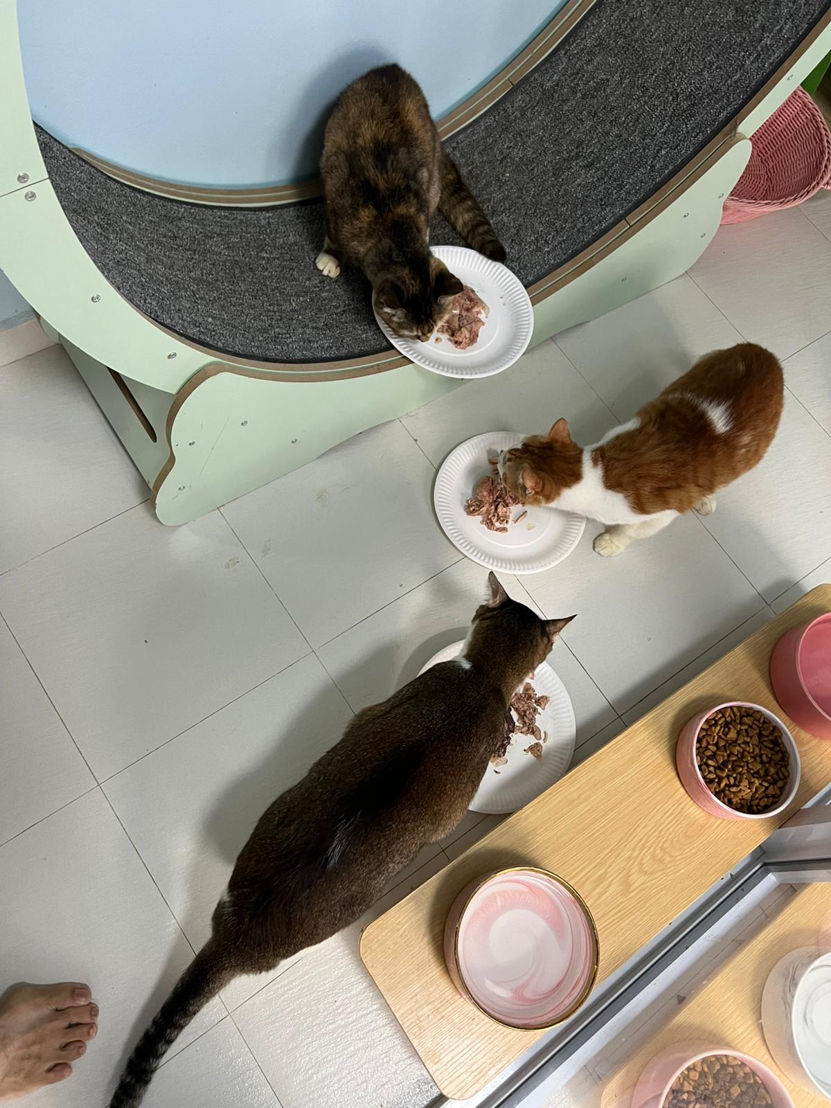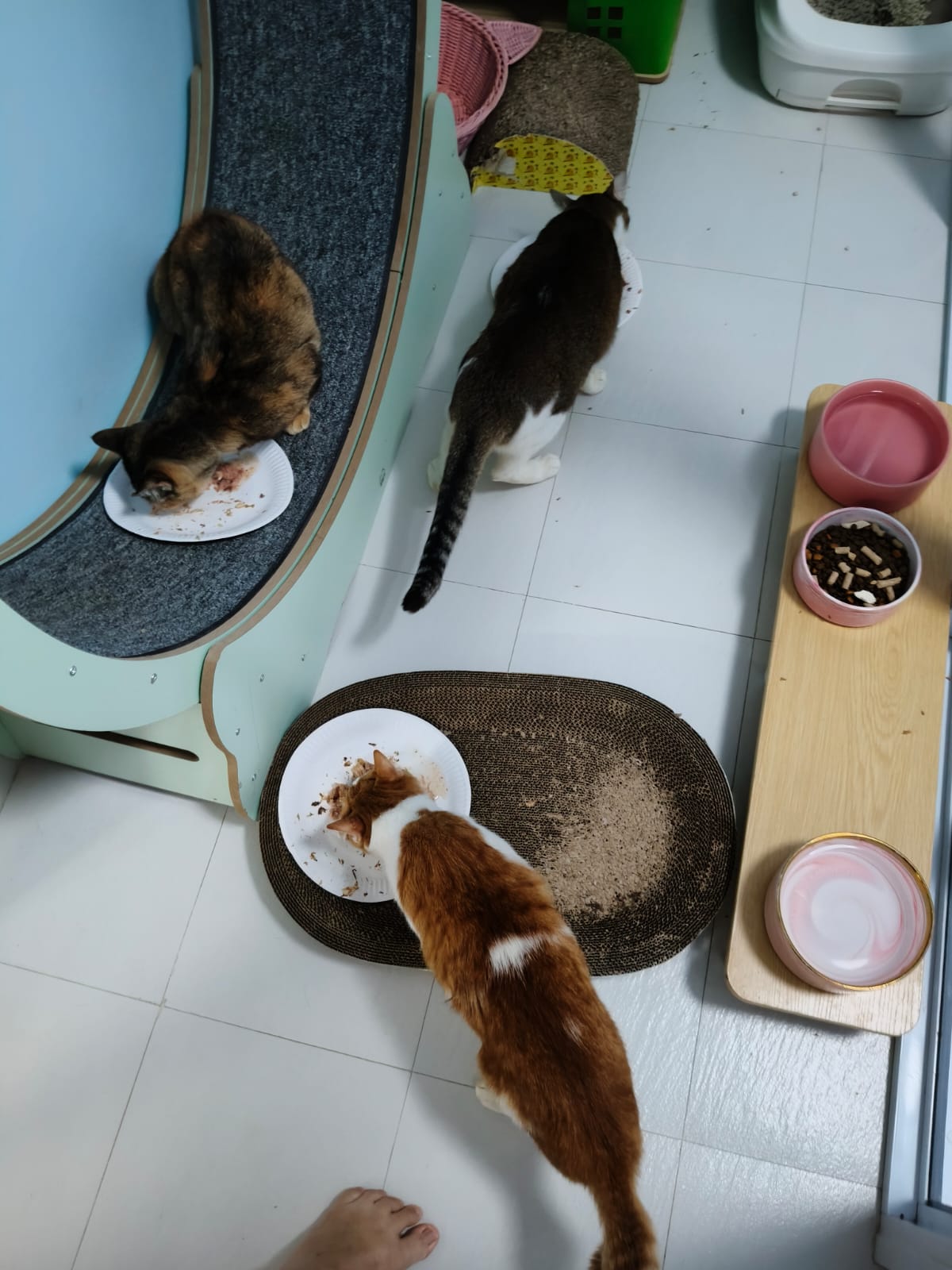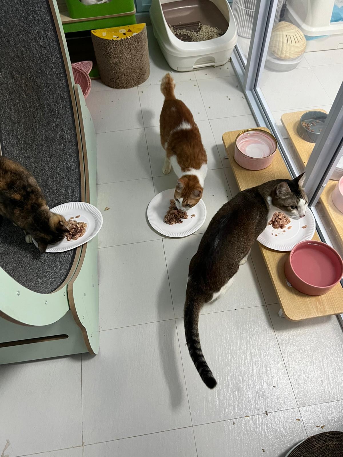 9Am+: all 3 of them eat tgt. 2 sets of poo today, one obviously from boy the poo so thick. But both sets quite dark. All wet food polished. Kibble also gone. They like feline natural.