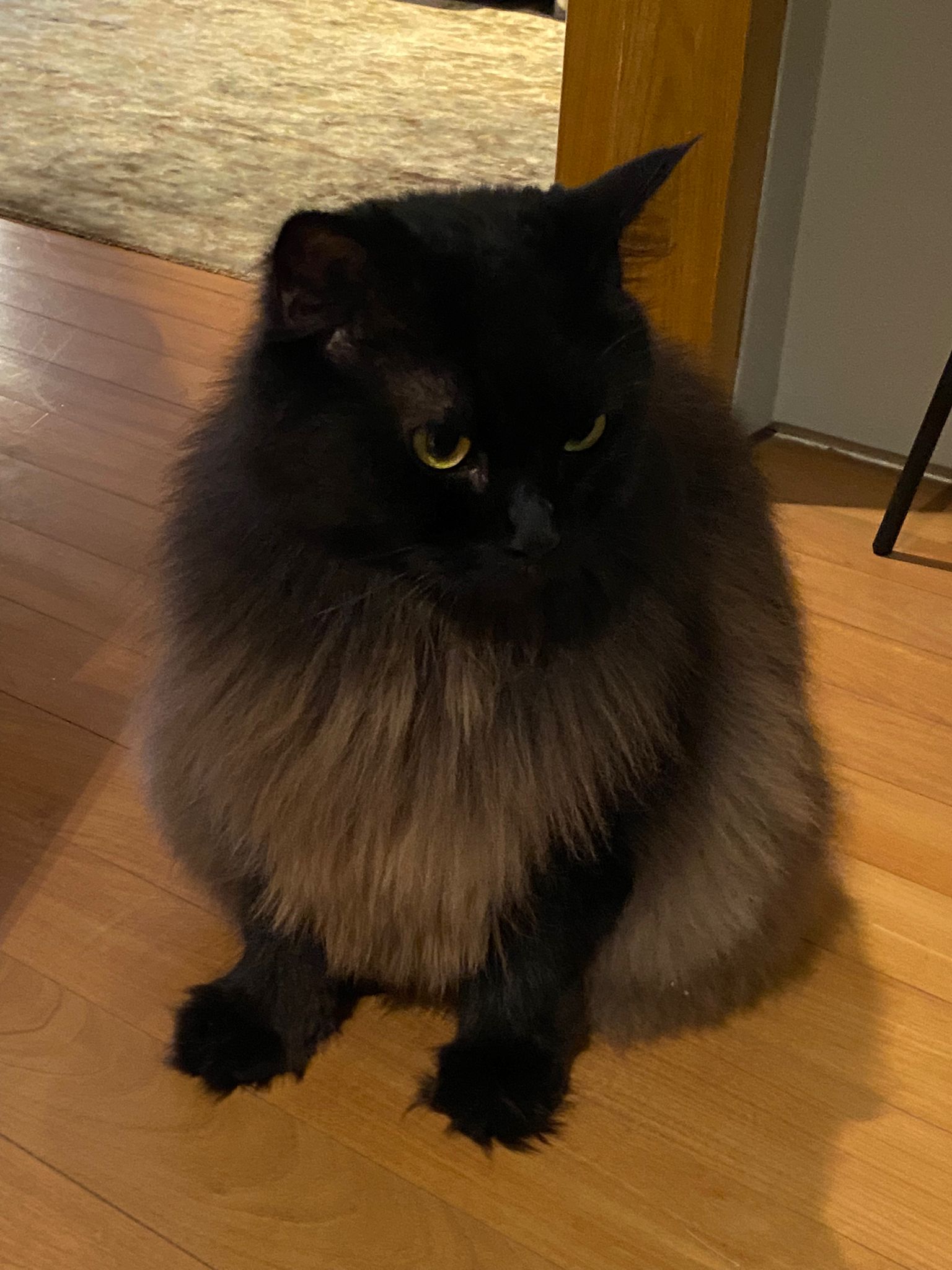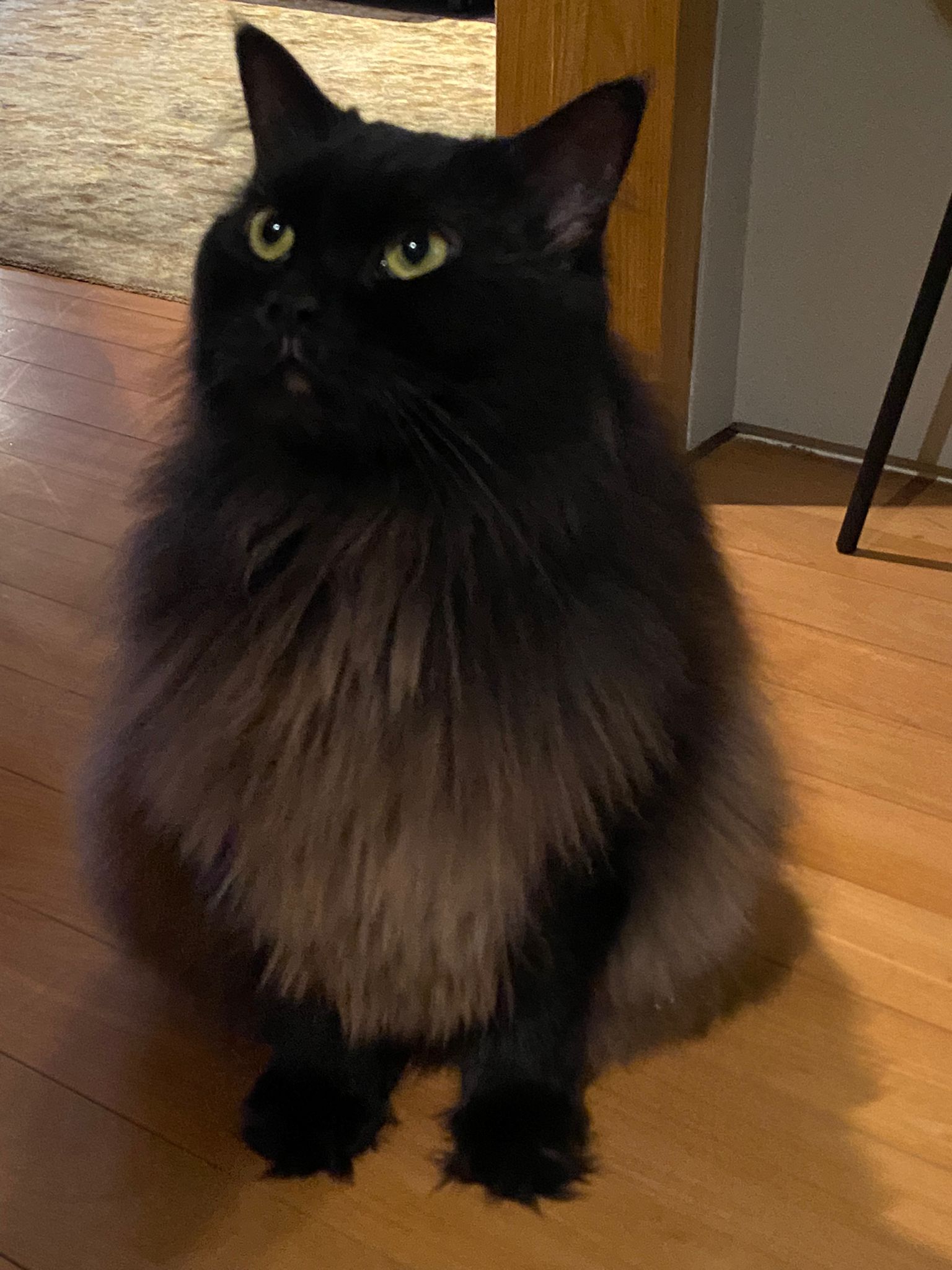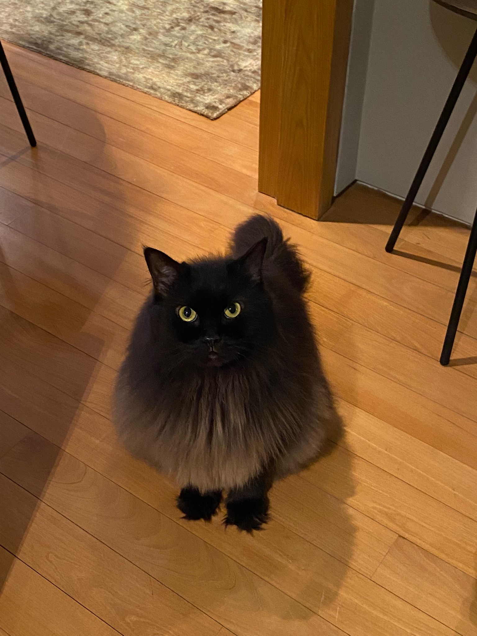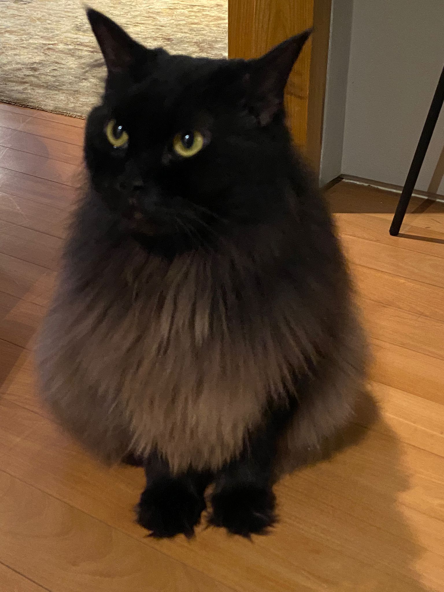 Found a new cat by the feeder. Fluffy tail one. Black cat.