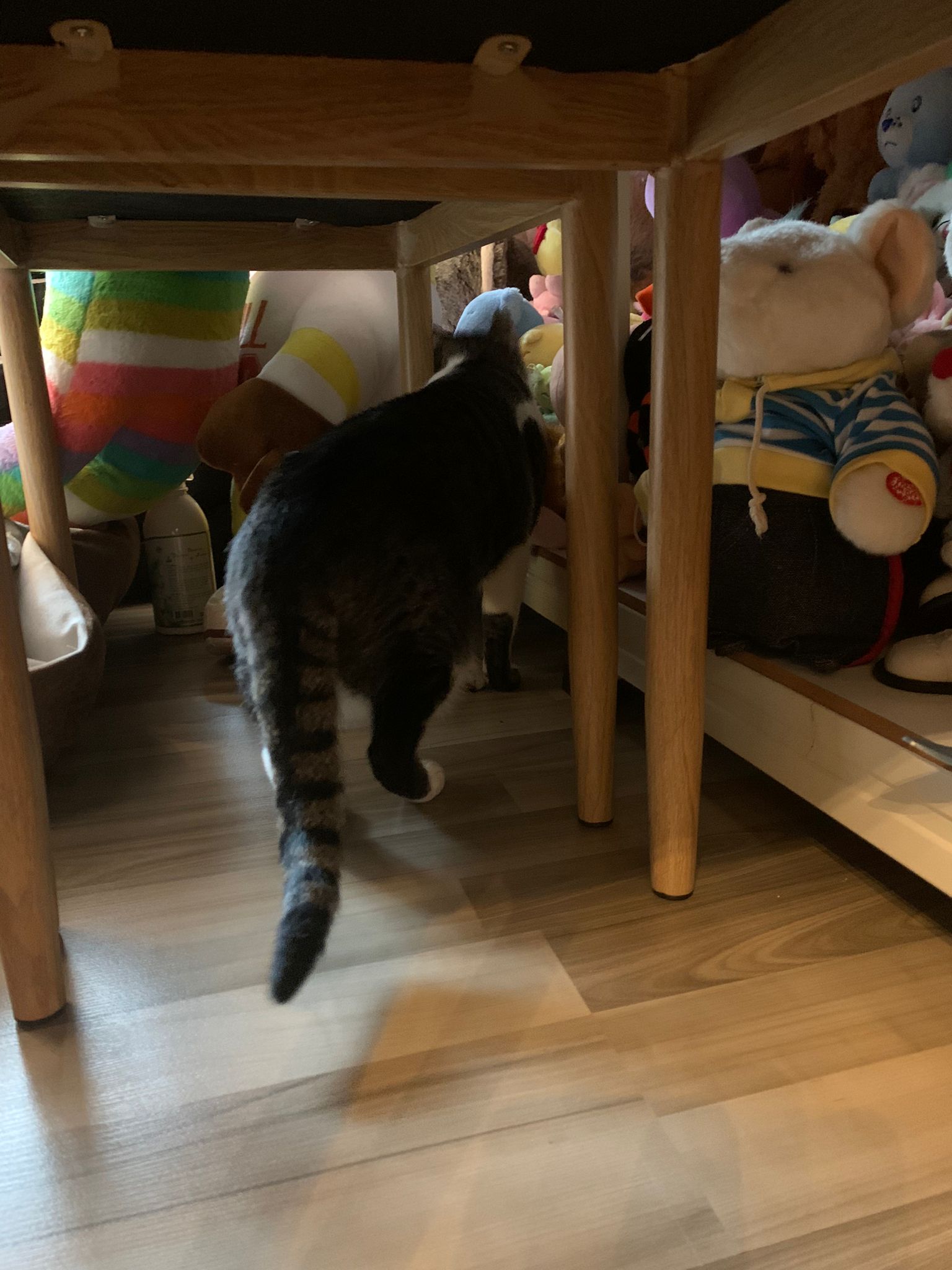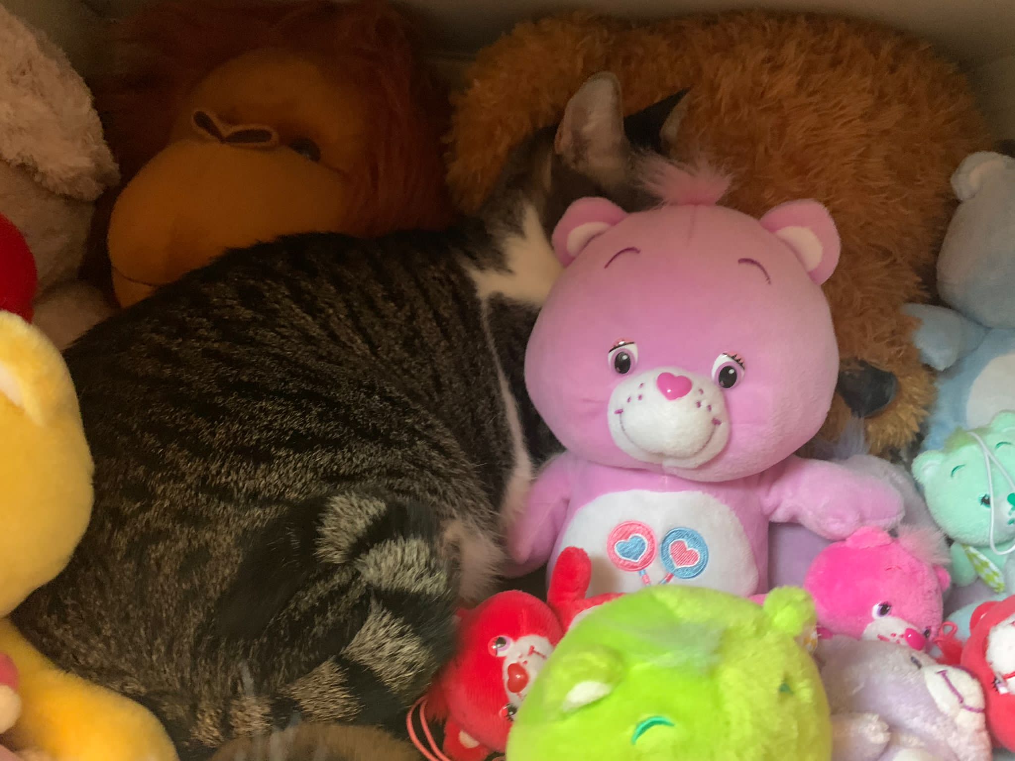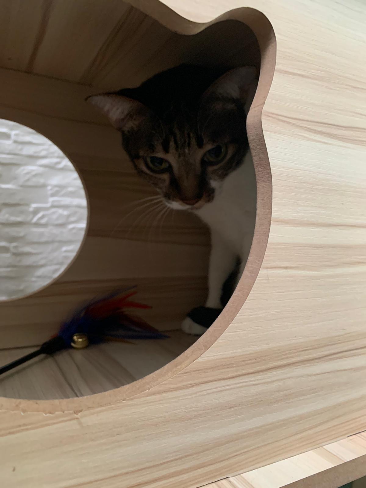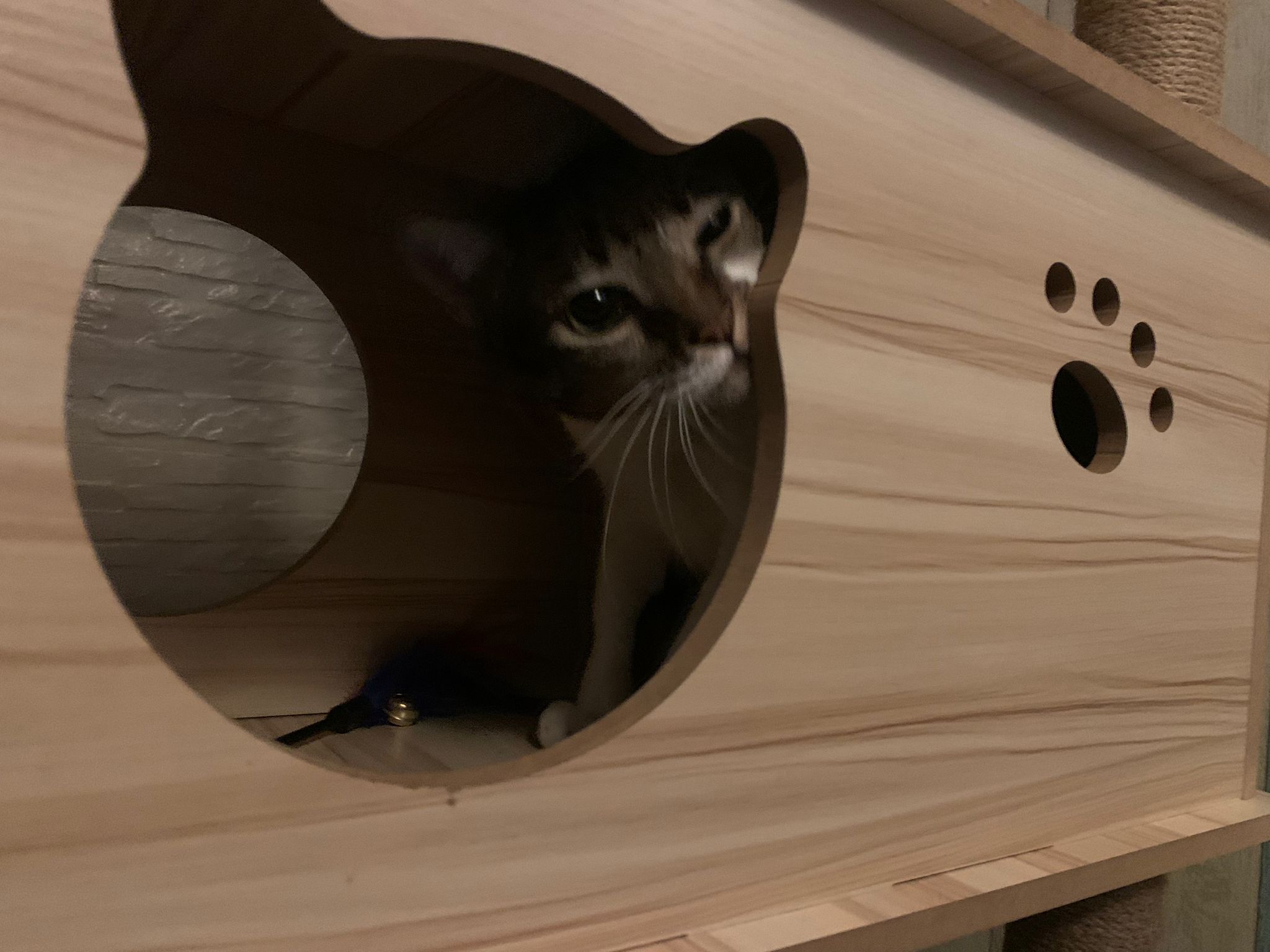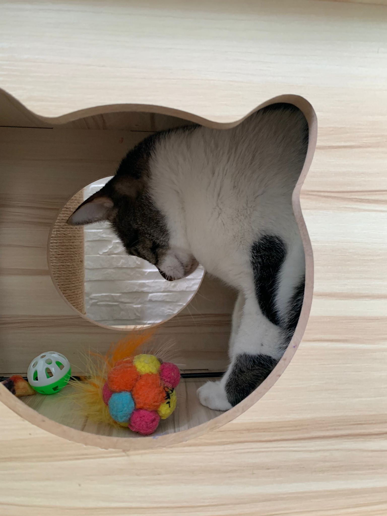 • 10pm: make peace w her since she don’t want leave the room, let her rest in the cupboard and give her a new paw toy