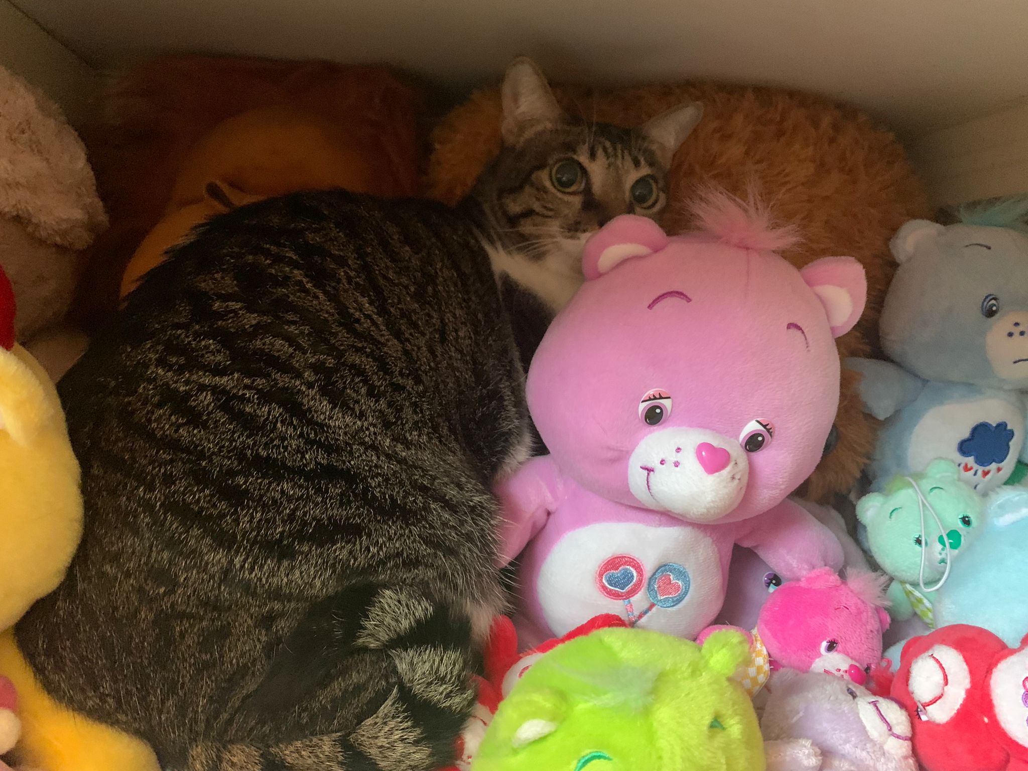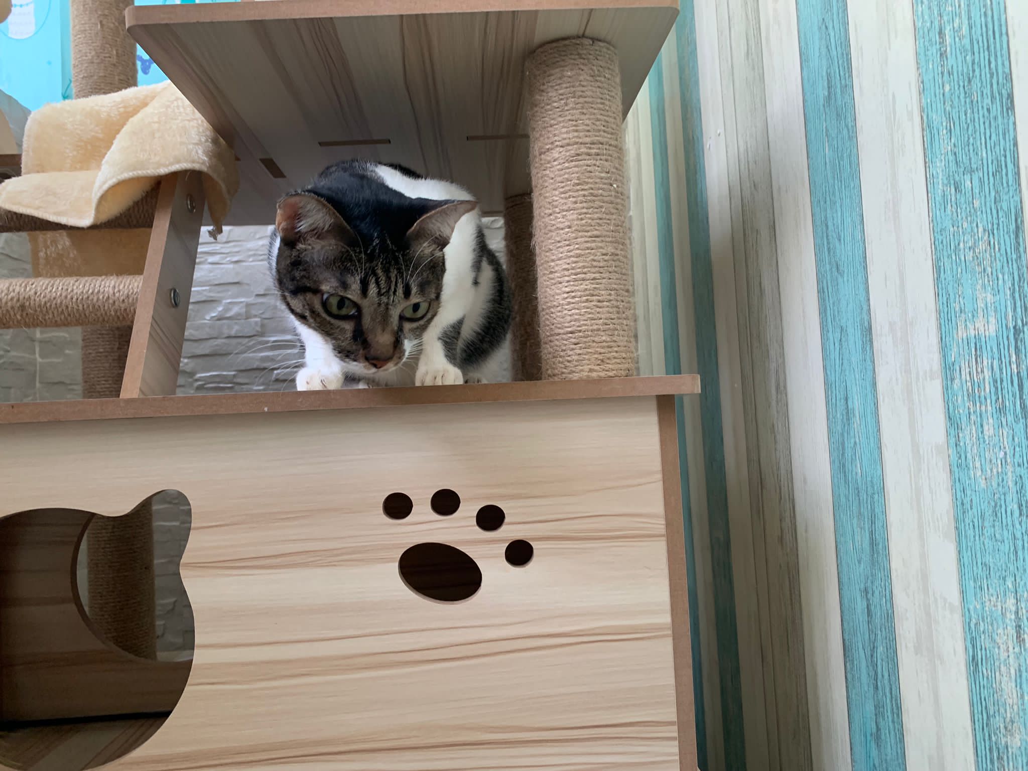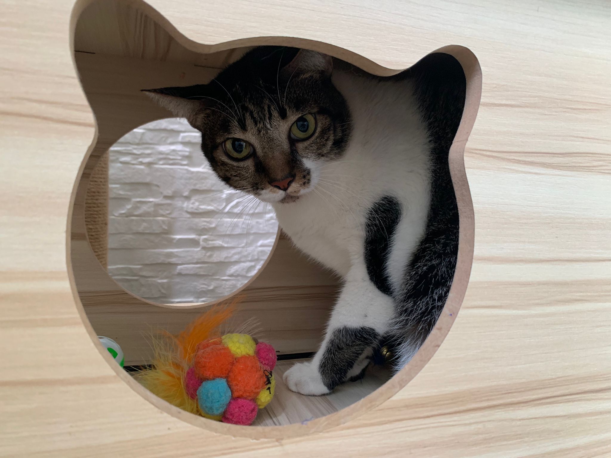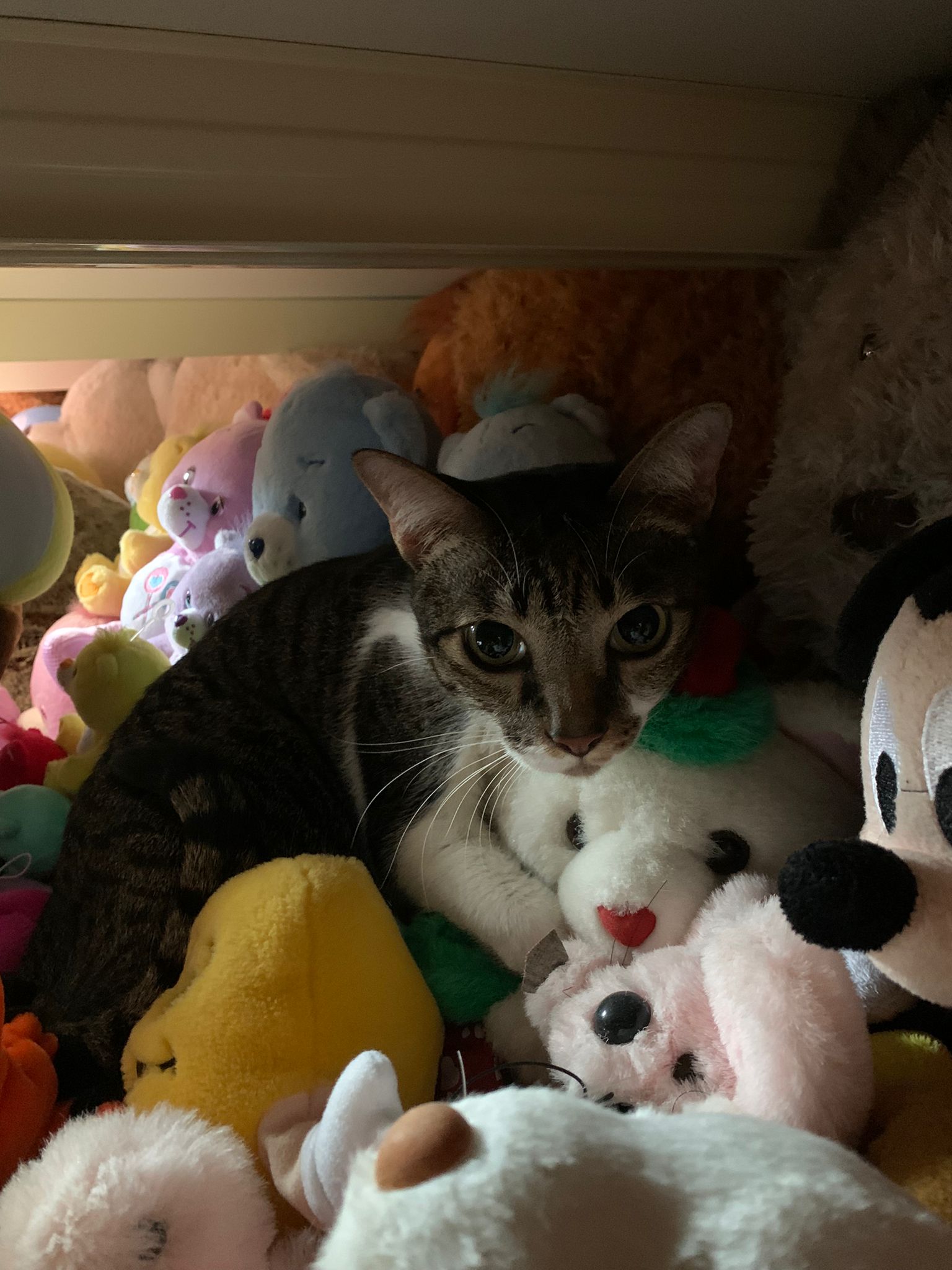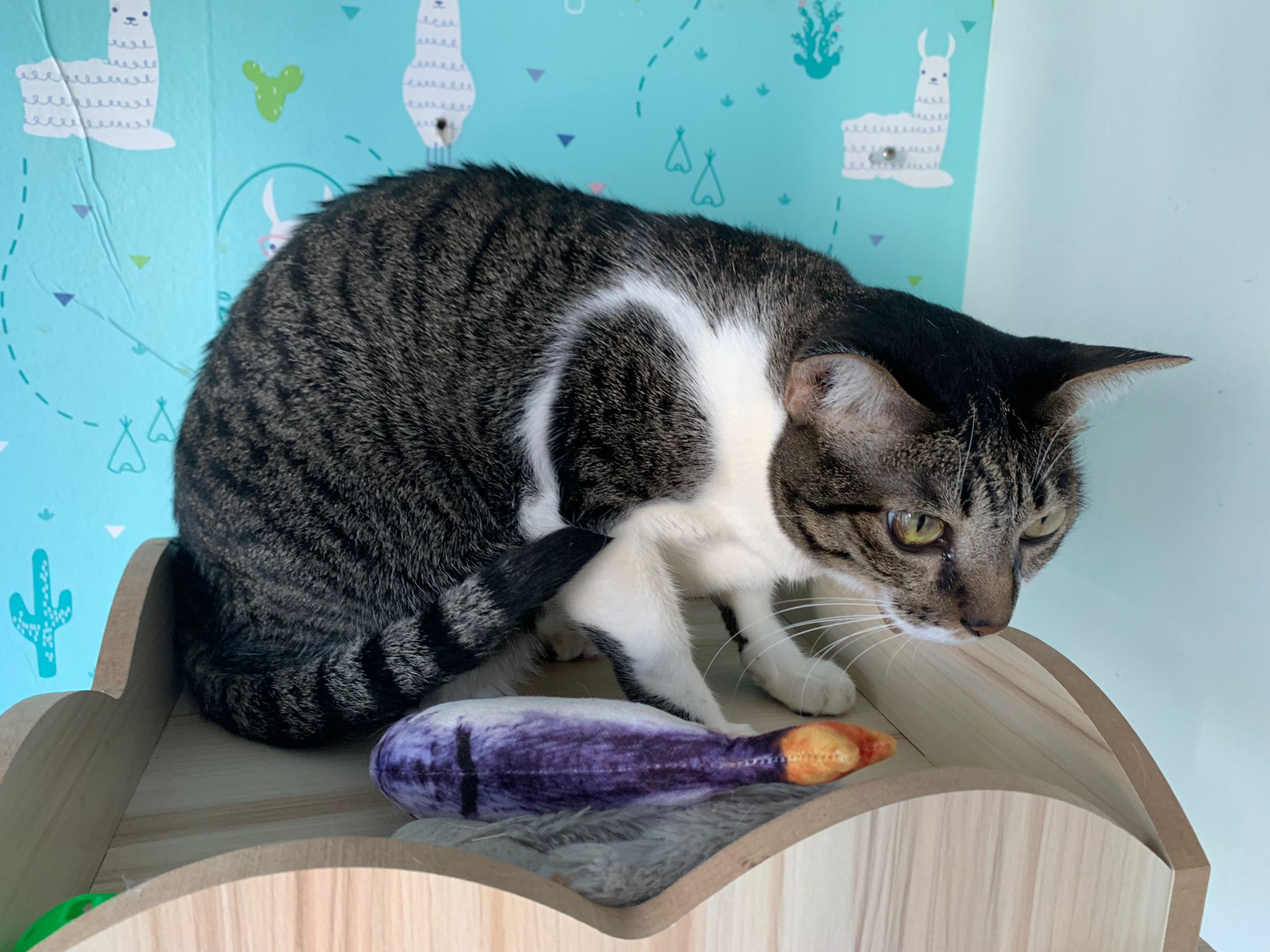 • 10pm: make peace w her since she don’t want leave the room, let her rest in the cupboard and give her a new paw toy