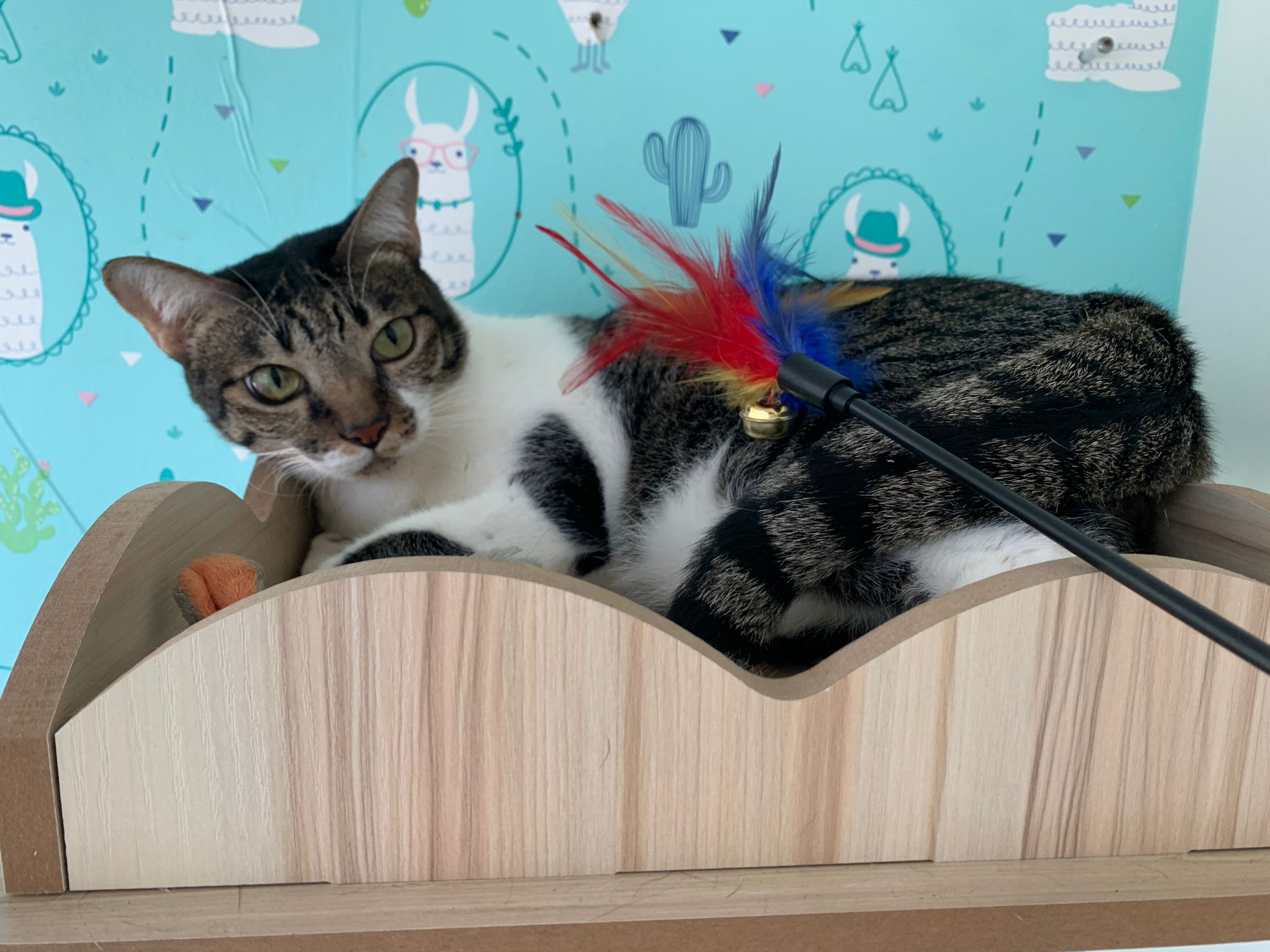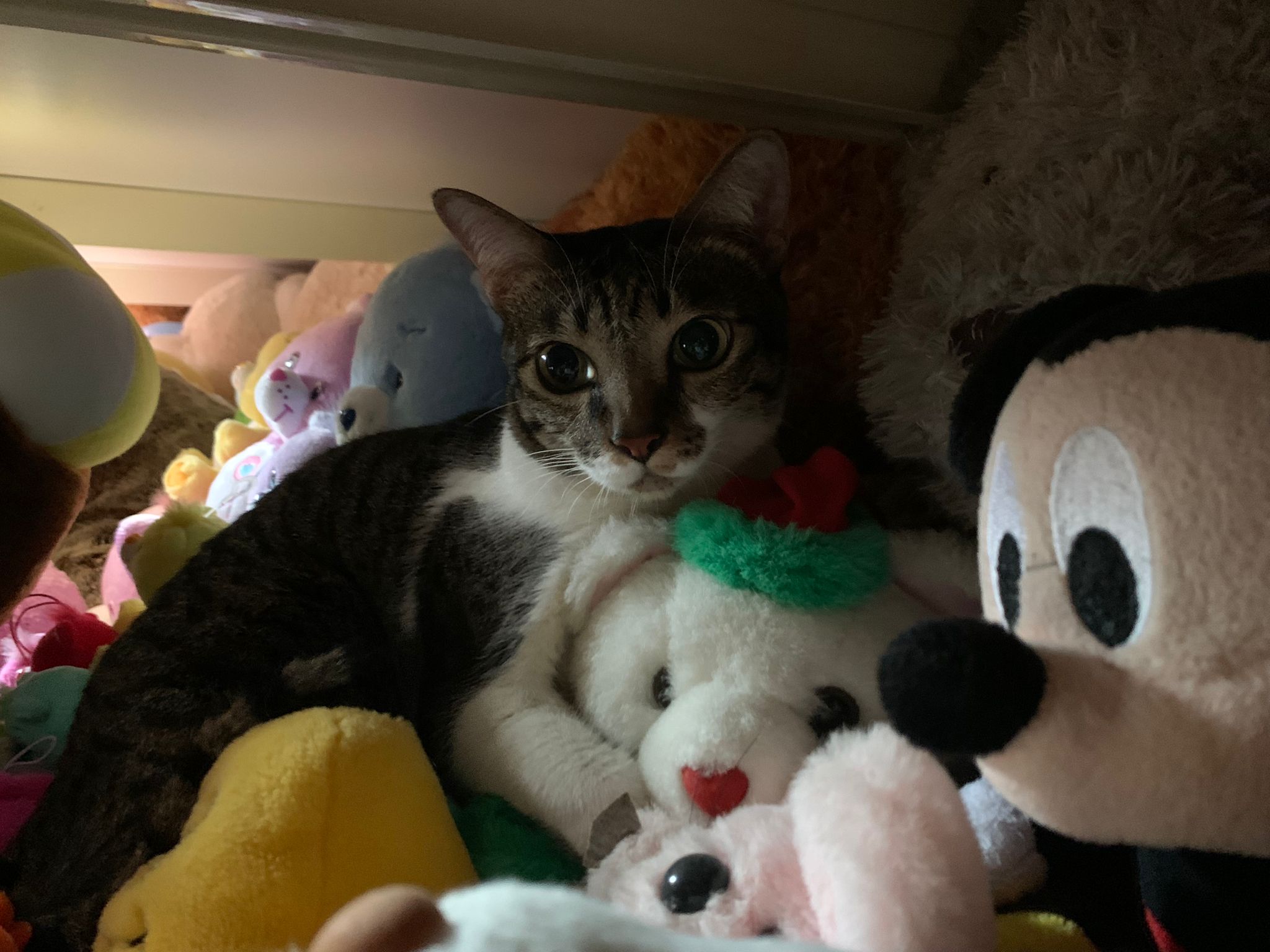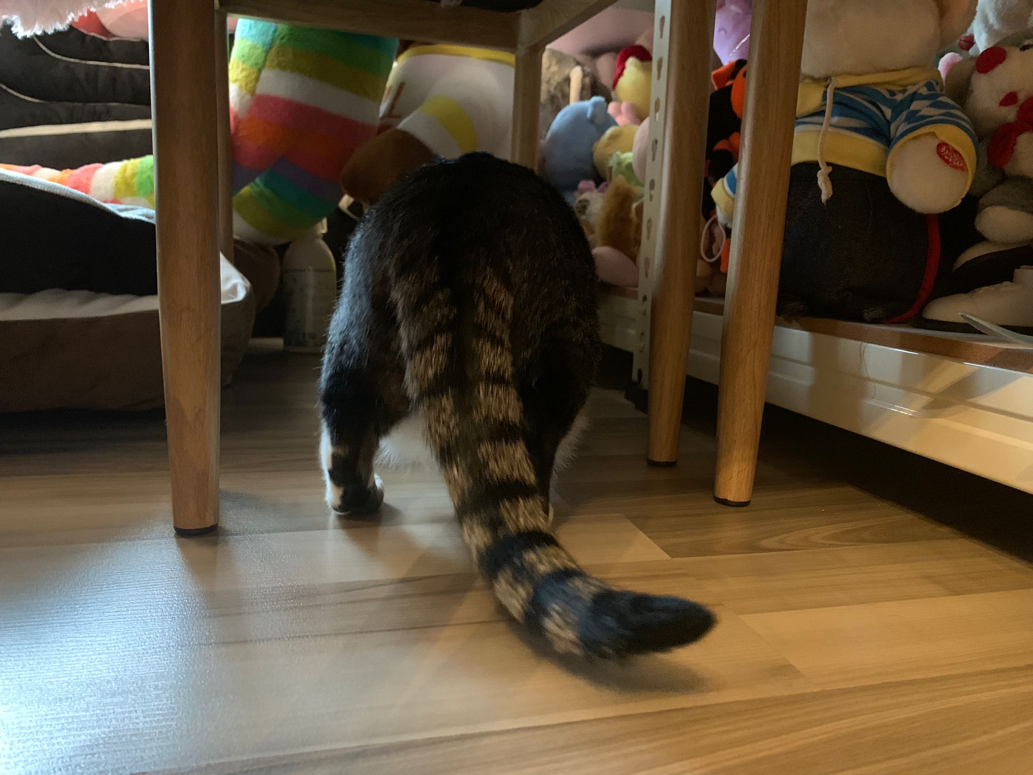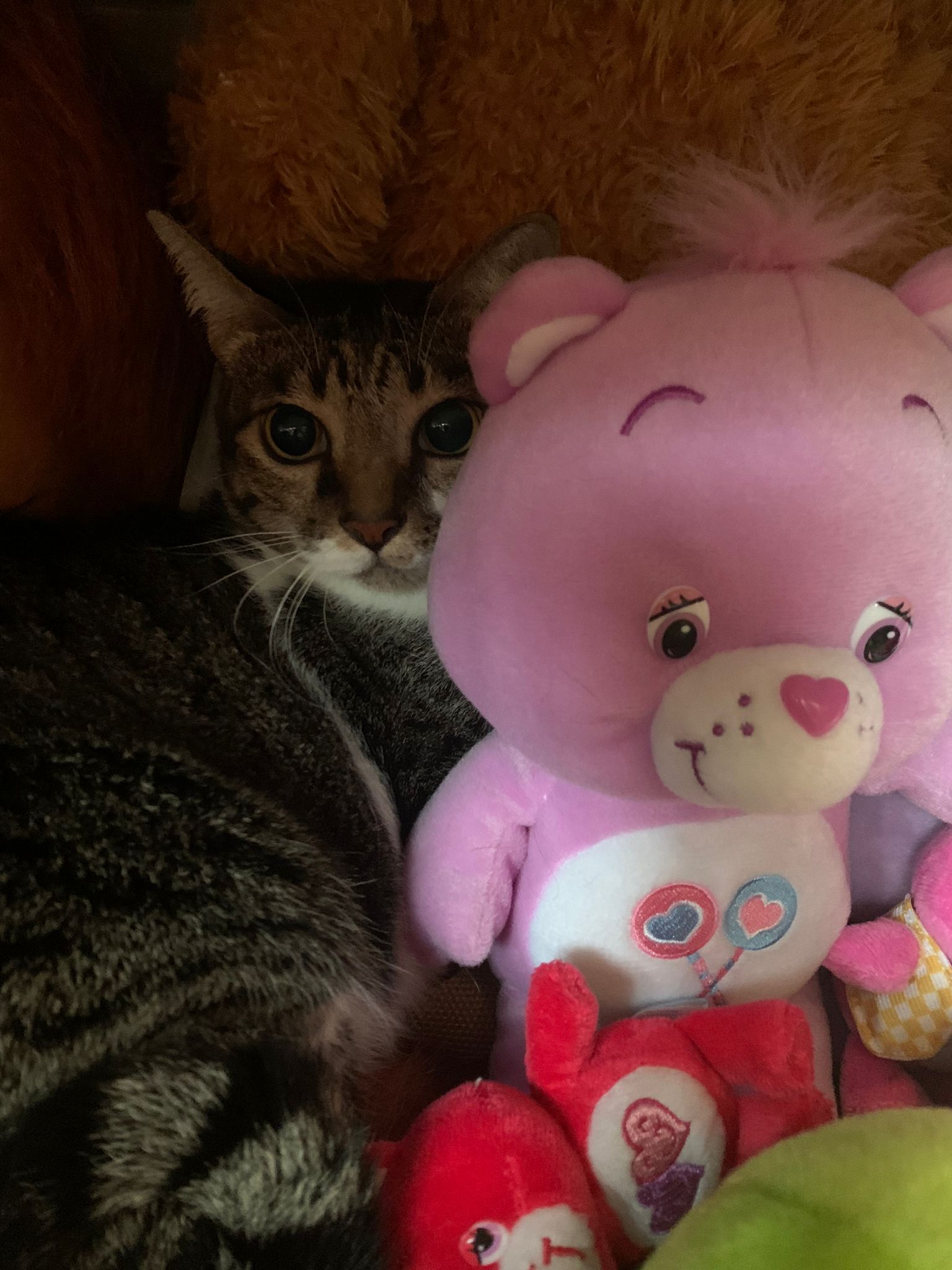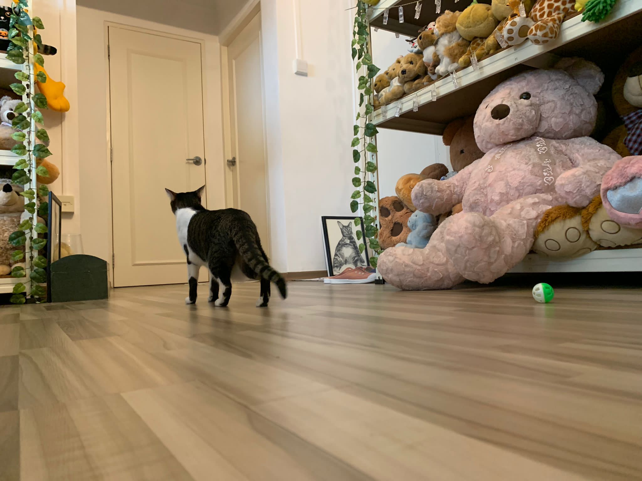 • 10pm: make peace w her since she don’t want leave the room, let her rest in the cupboard and give her a new paw toy