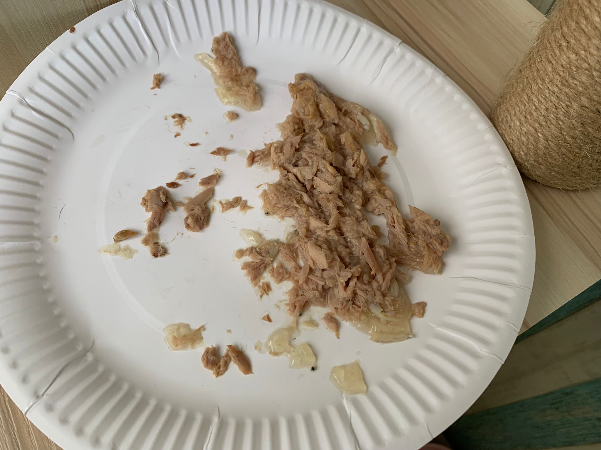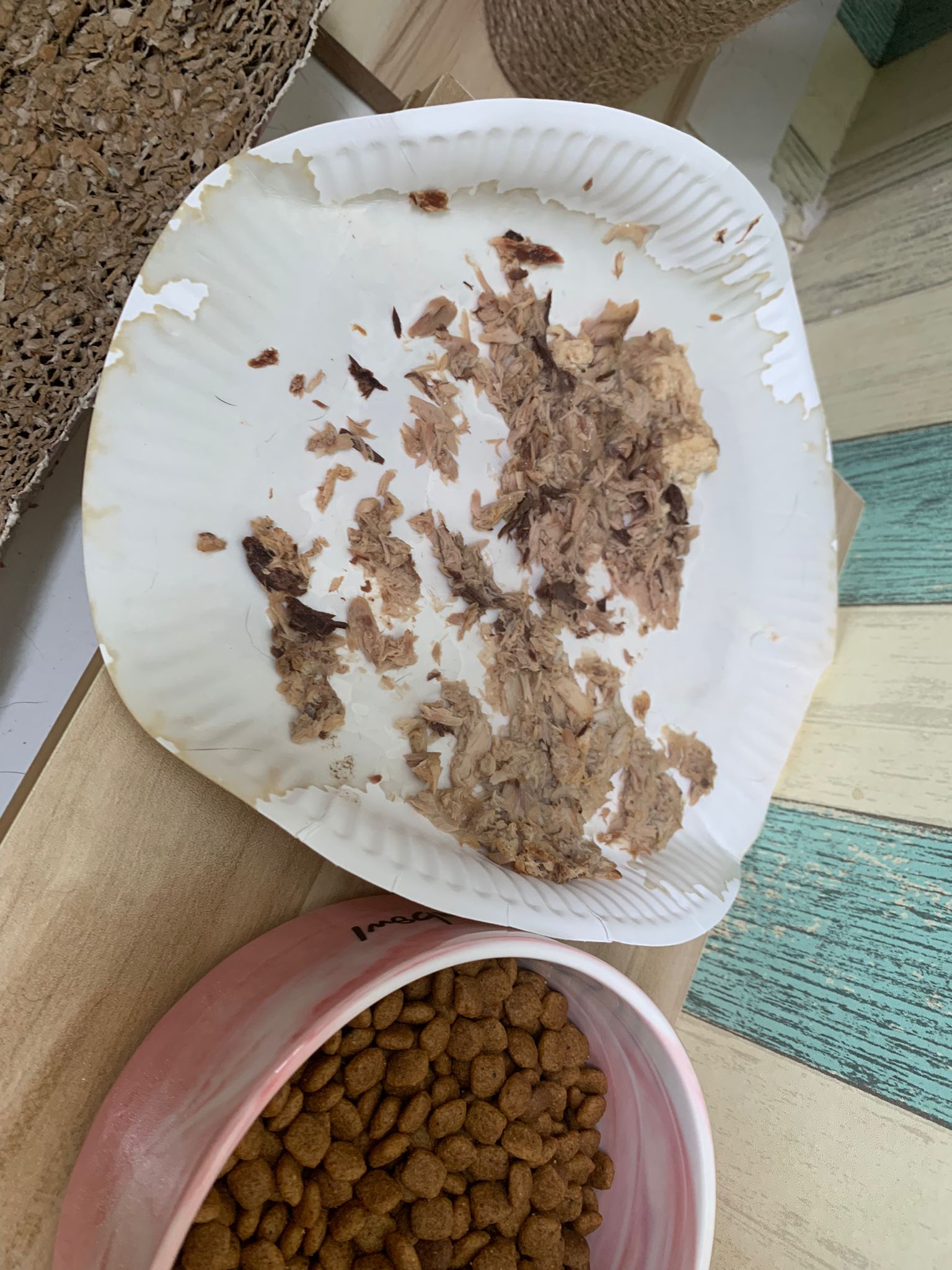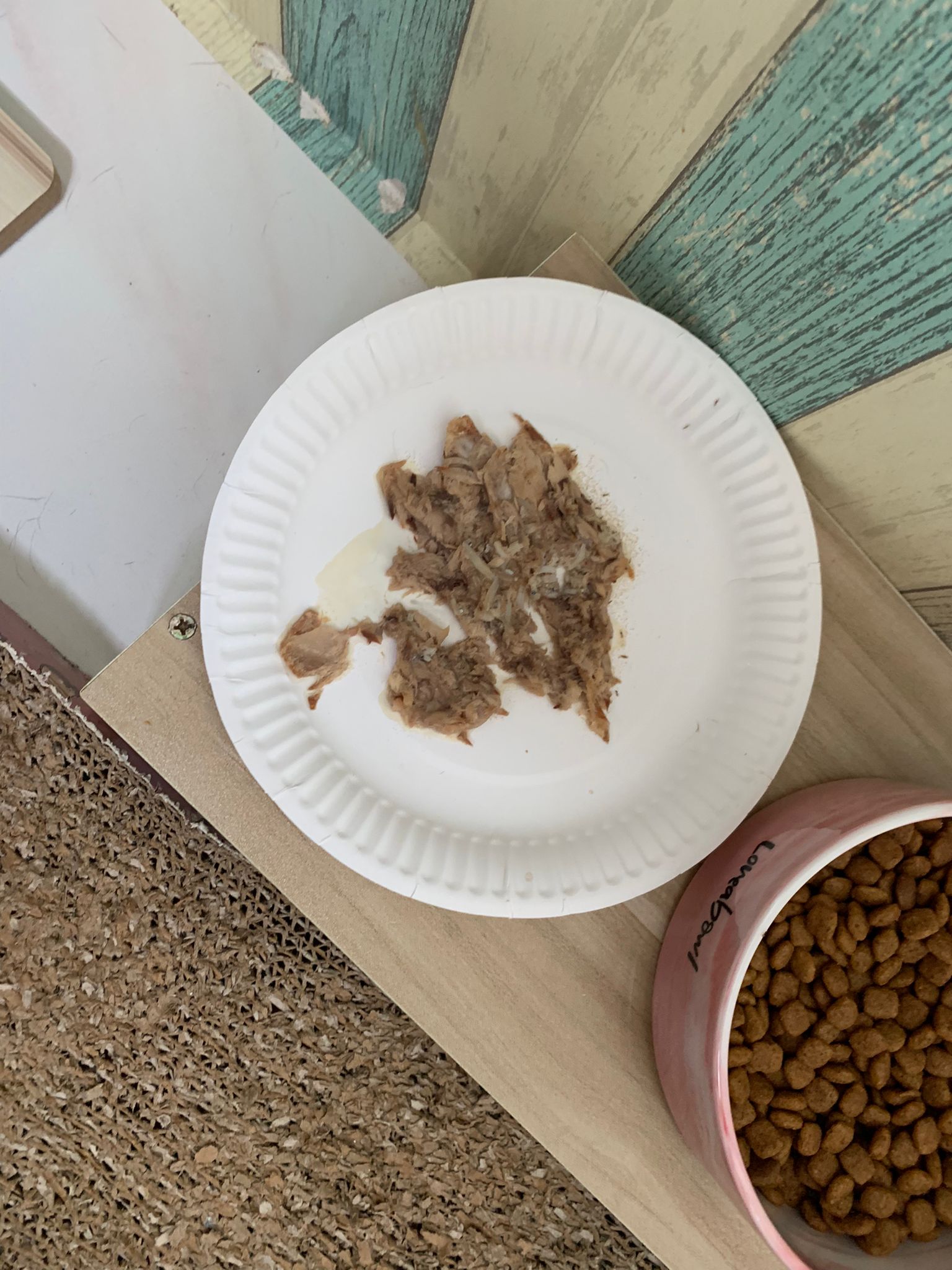 4.45pm: serve tuna w chicken. Her food plate is cleared today.