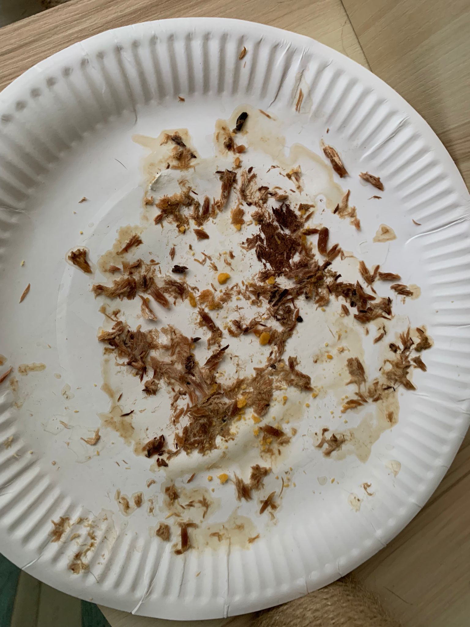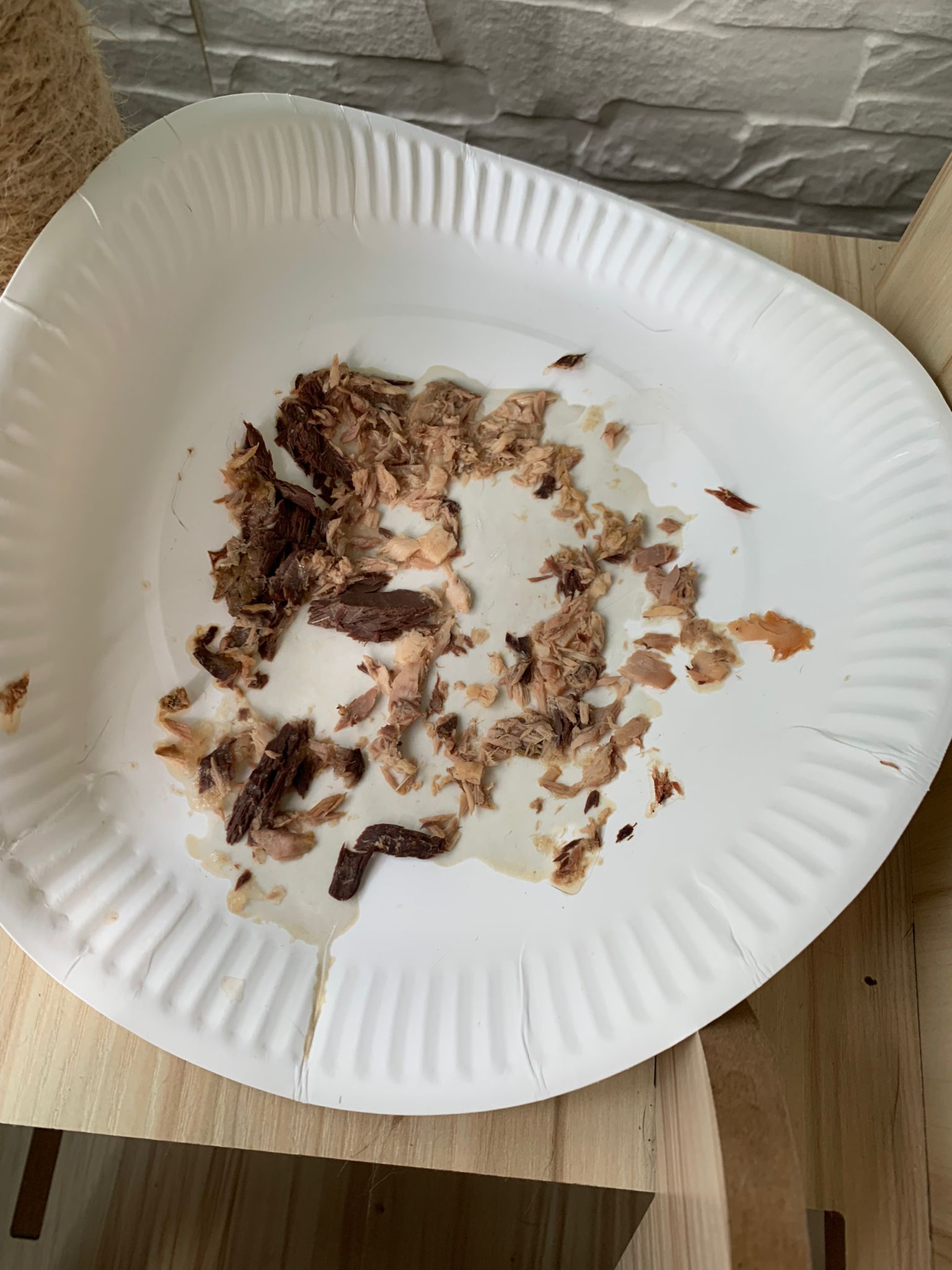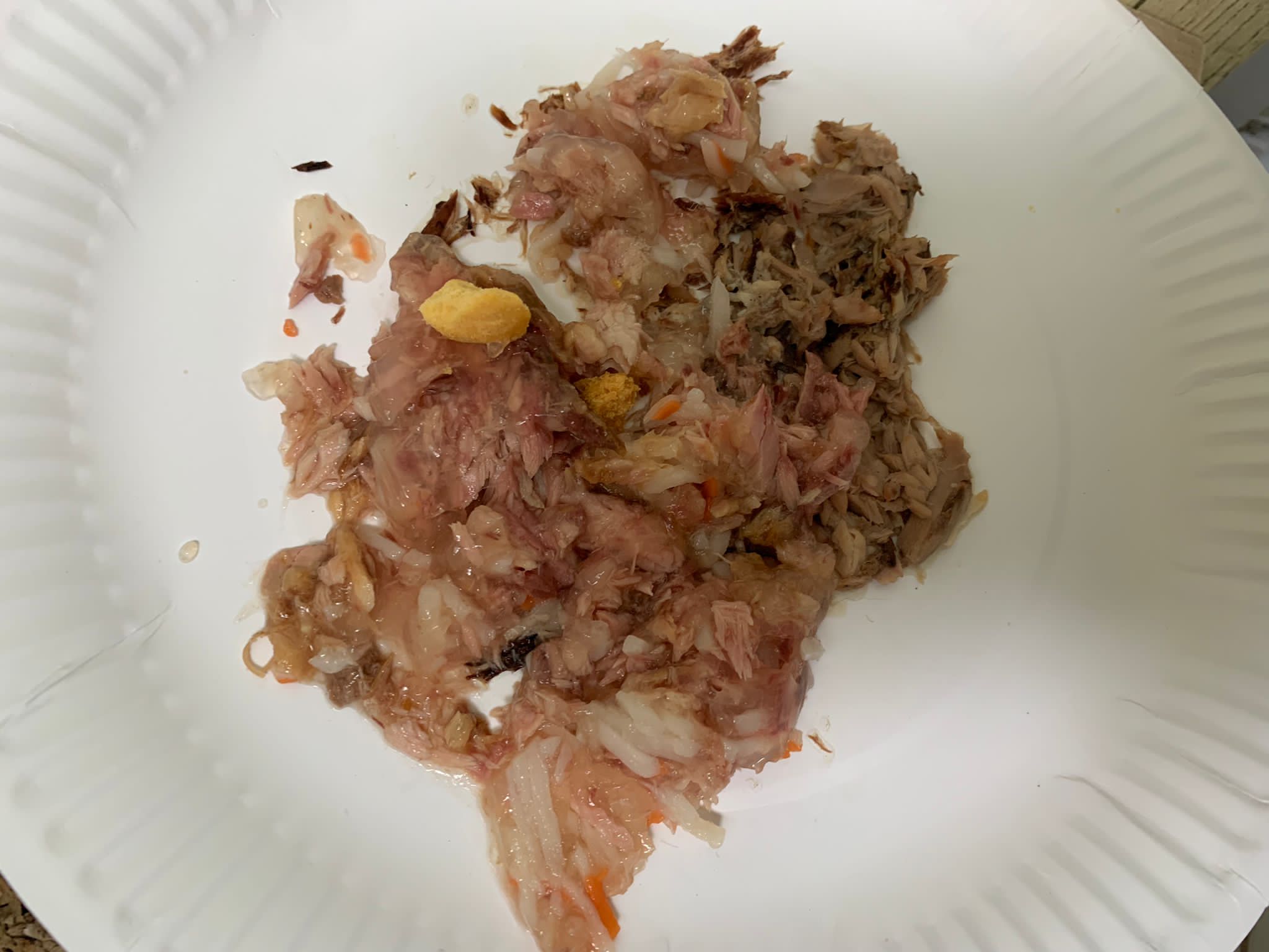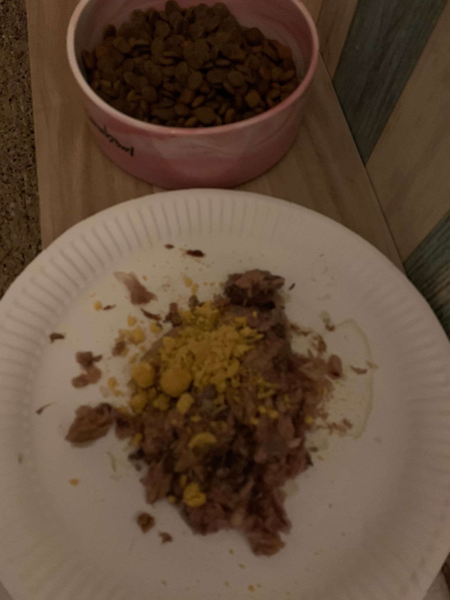 4.45pm: serve tuna w chicken. Her food plate is cleared today.