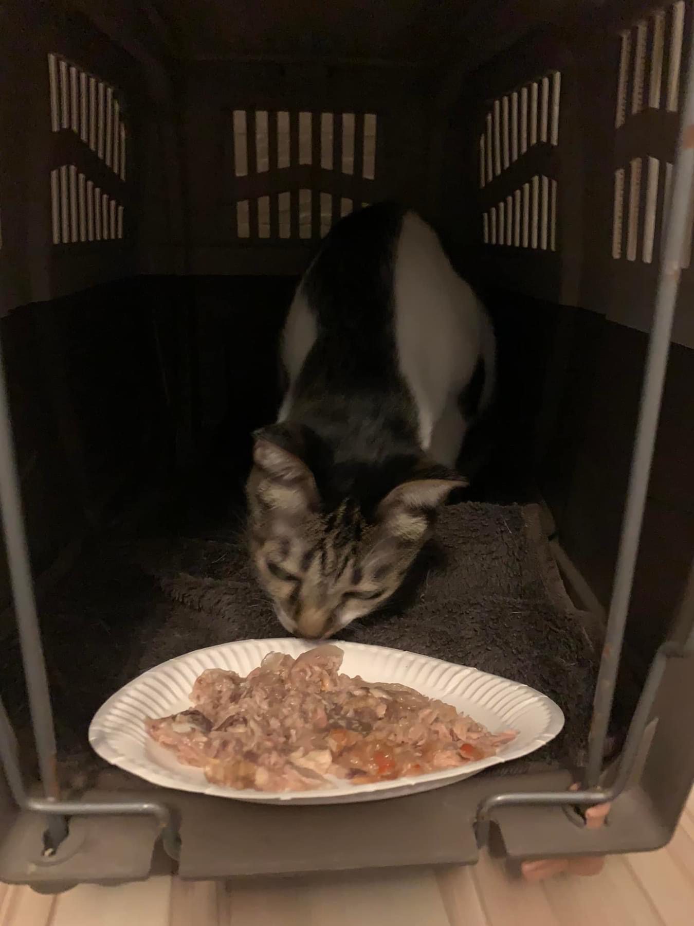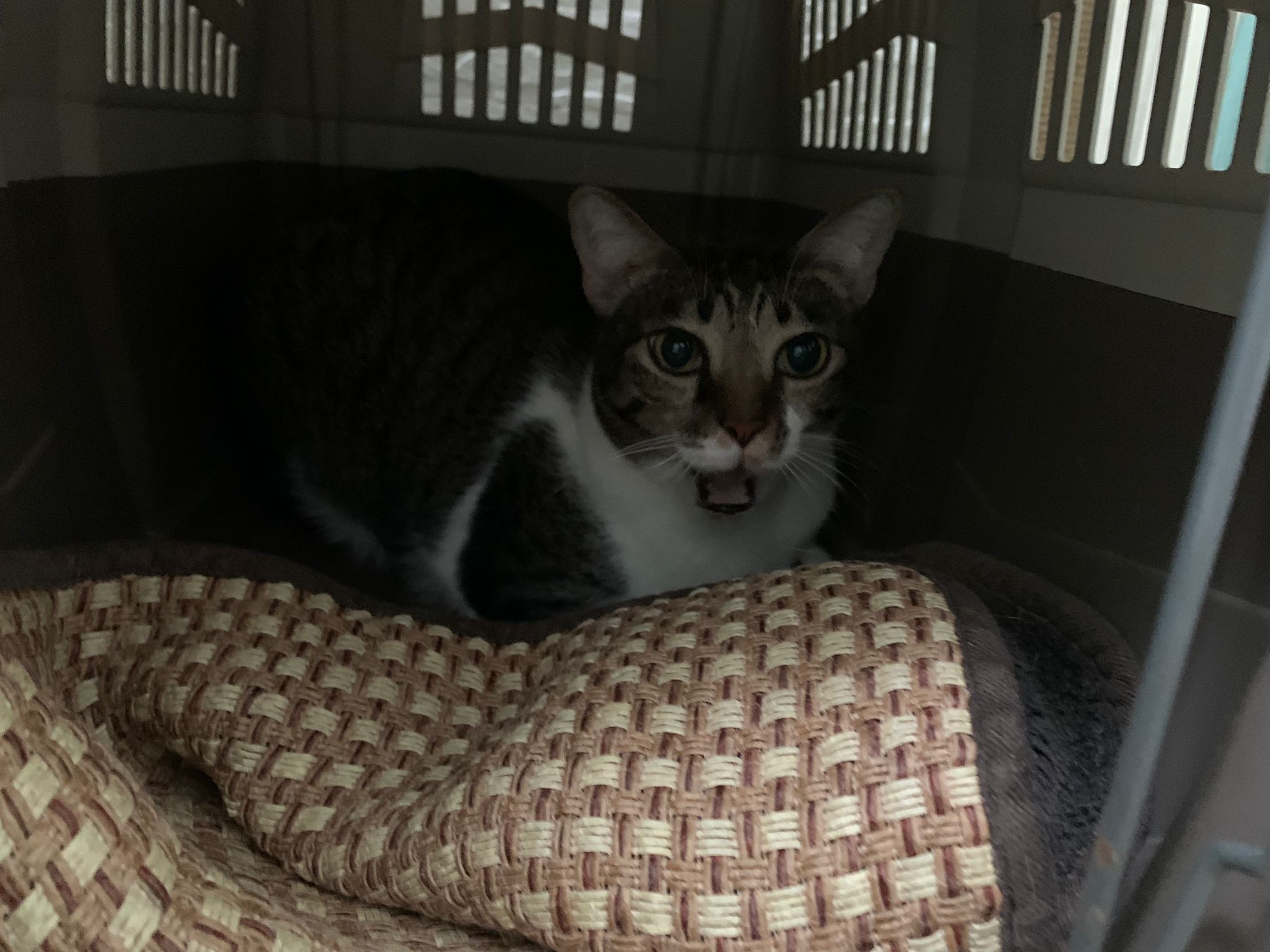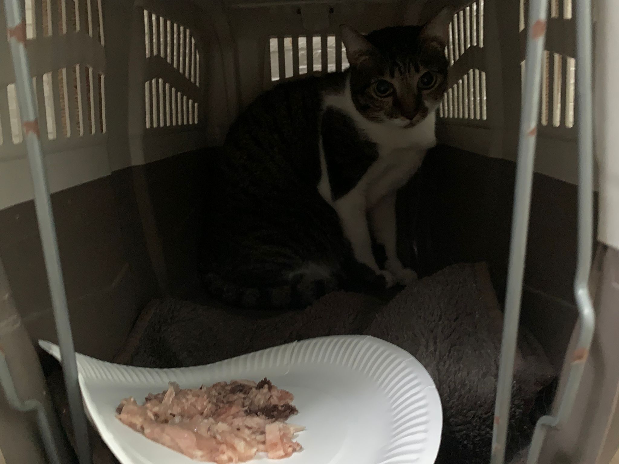 930am: got eat, raining heavily she is hiding in her carrier – cozier. Serve tuna w chicken ham.
