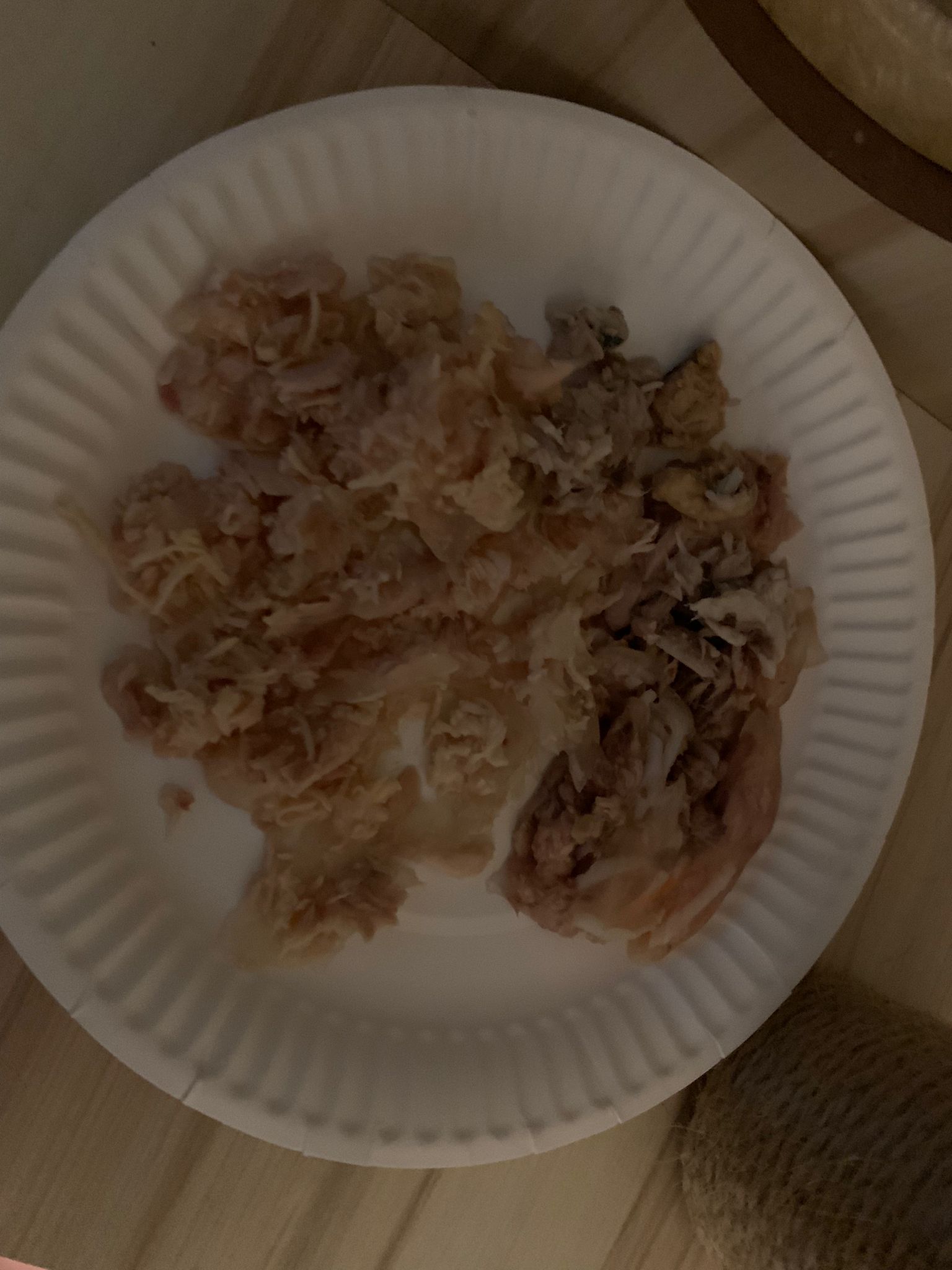 Serve tuna w chicken ham and I forgot another is what. Today I brain fried. Go out stock up food n litter.
