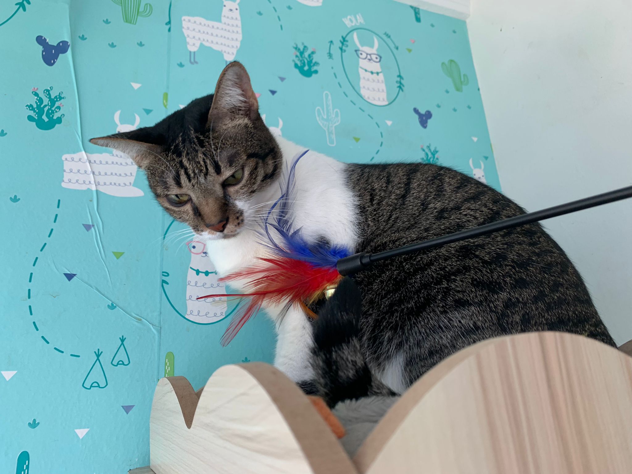 845am: got come down loh. Serve tuna w chicken. Play w whacking paw again, even take photo she want whack my phone. Even amber more steady than her.