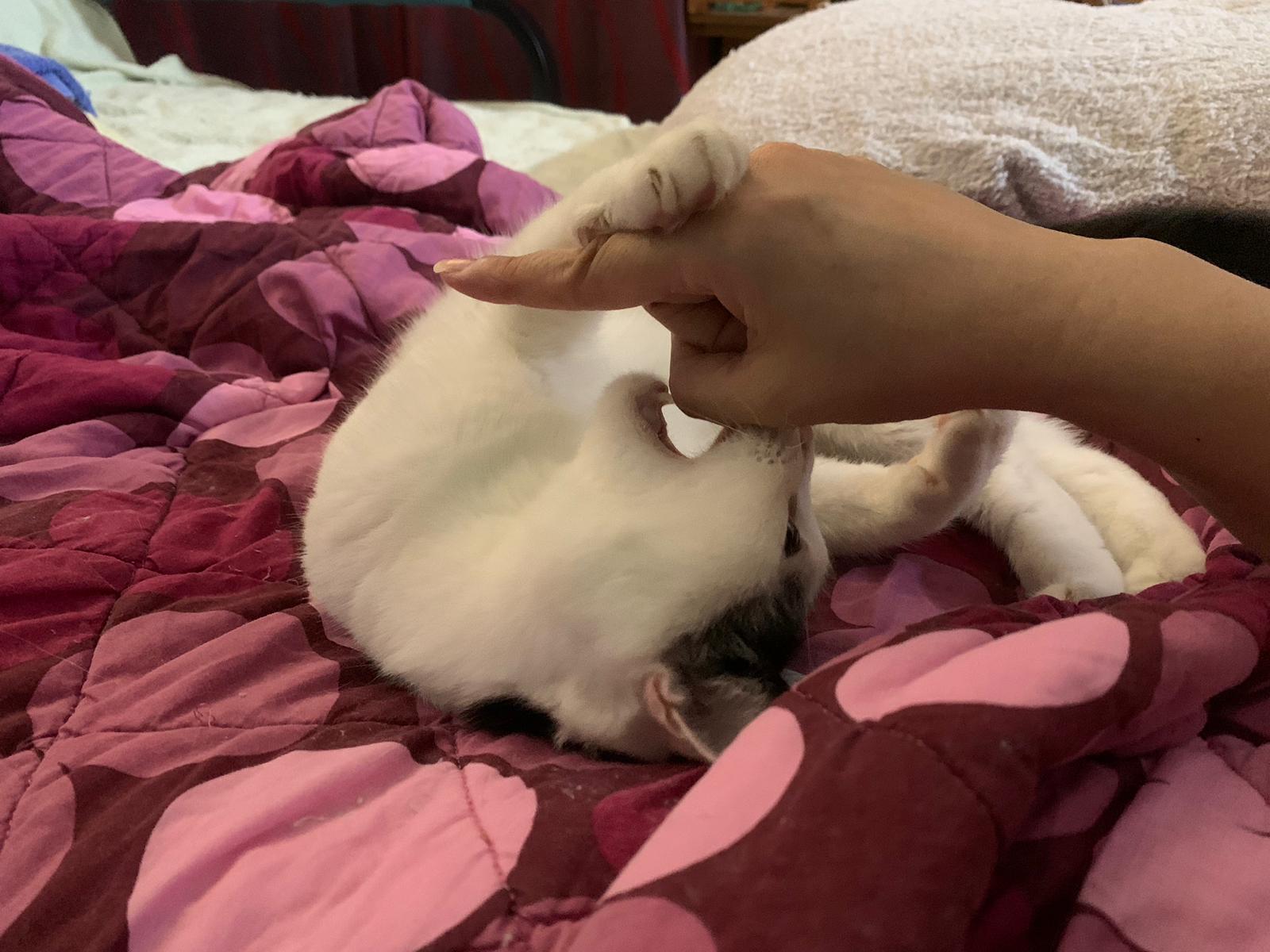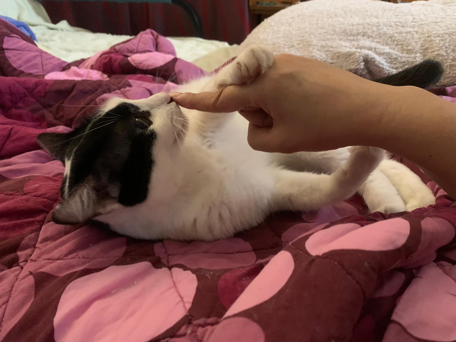 Night: didn’t see her eat. Lie on pillow to play belly rubs w me.
