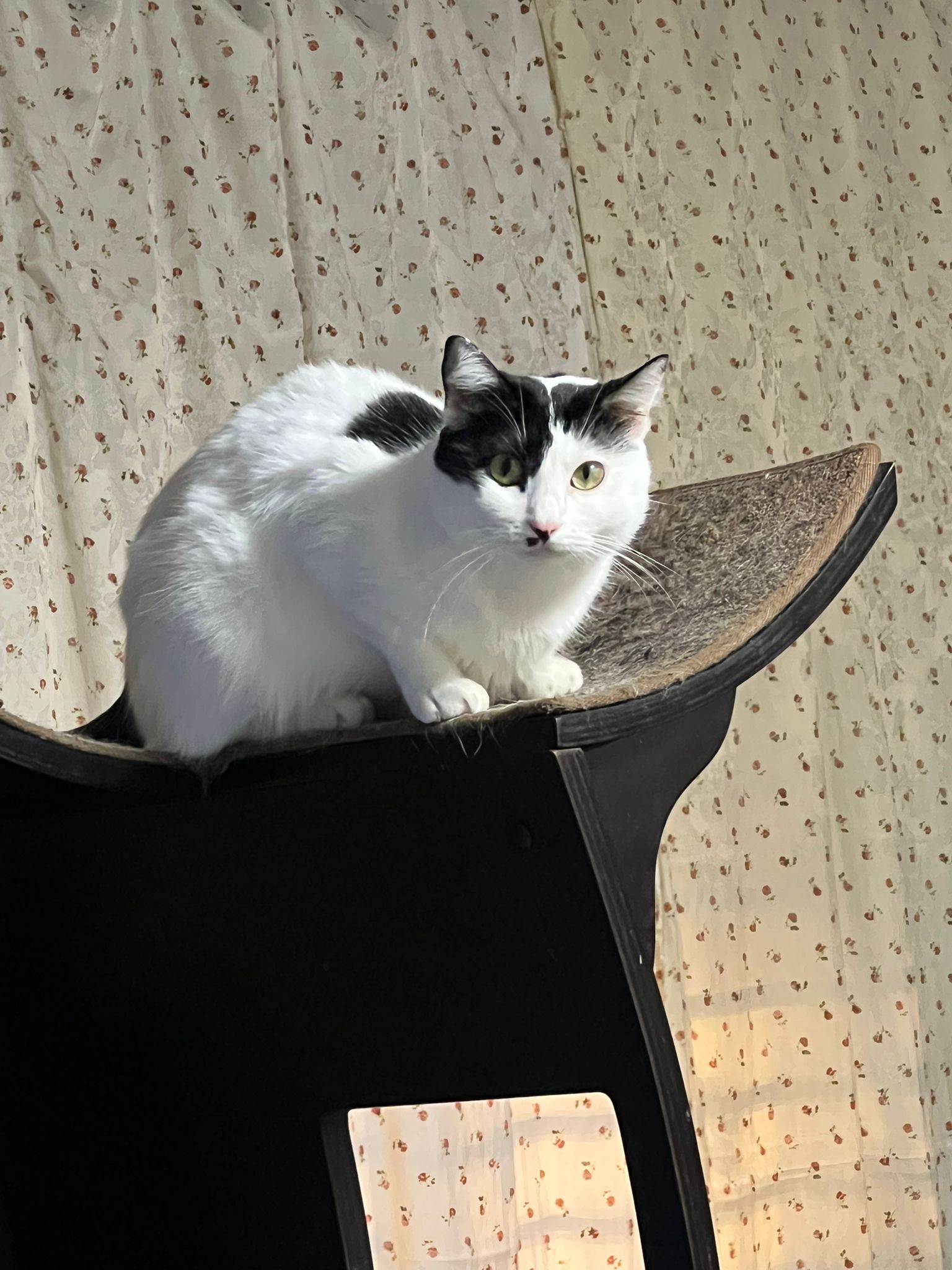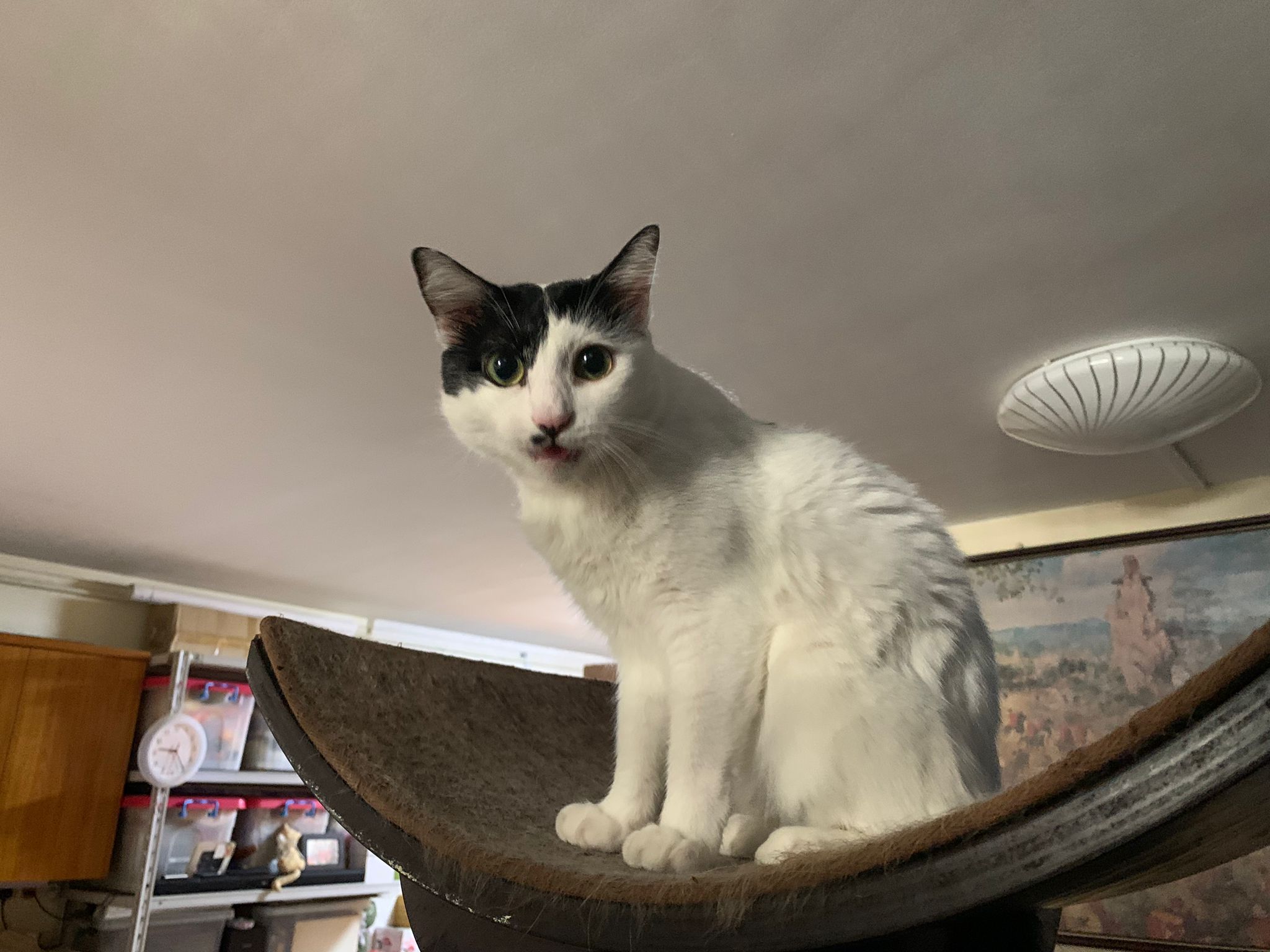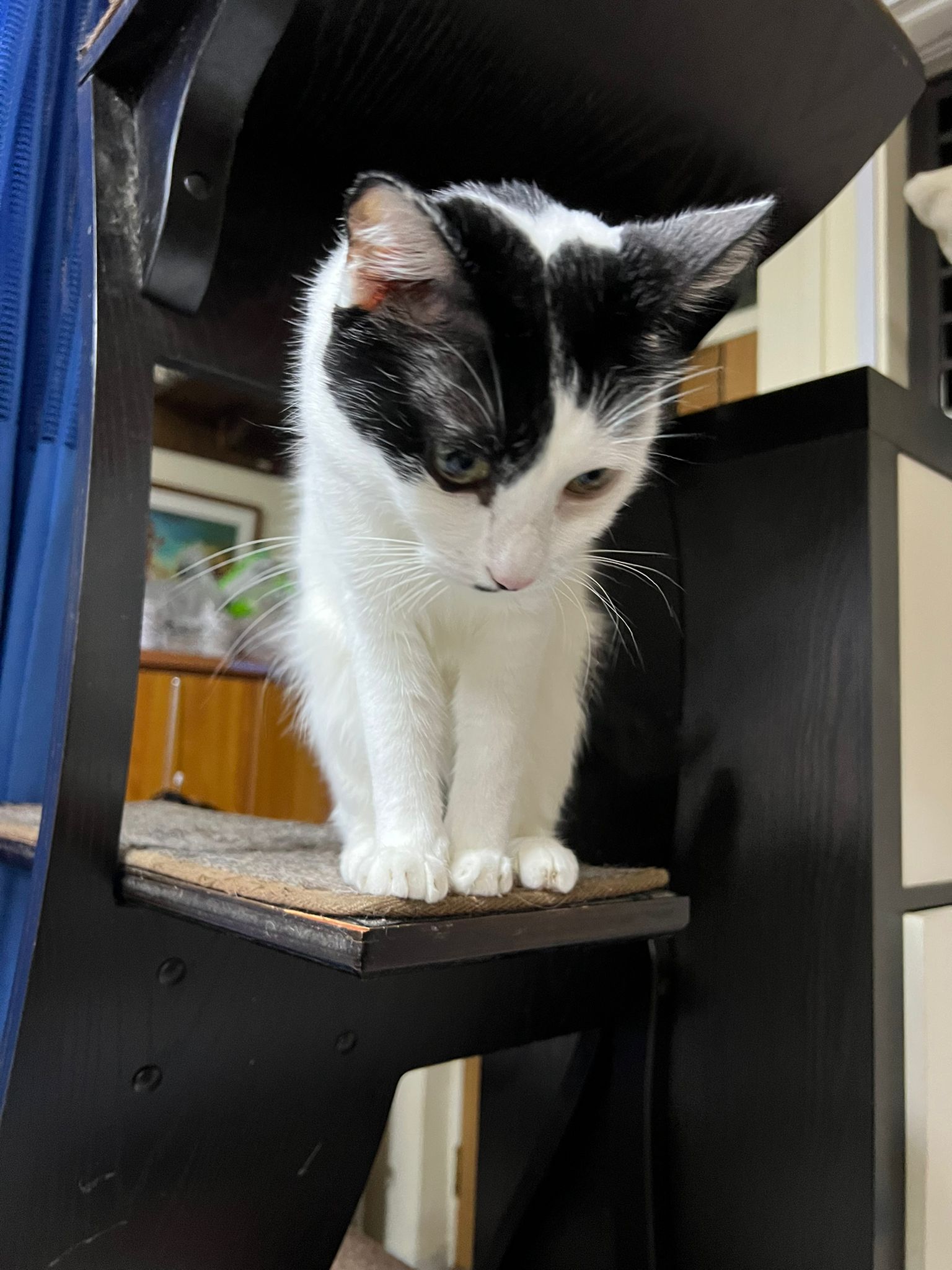 8am+: joy at the top of the expensive cat tree. I serve food and she n rufus share for a while n I wanna take video n she jump off.