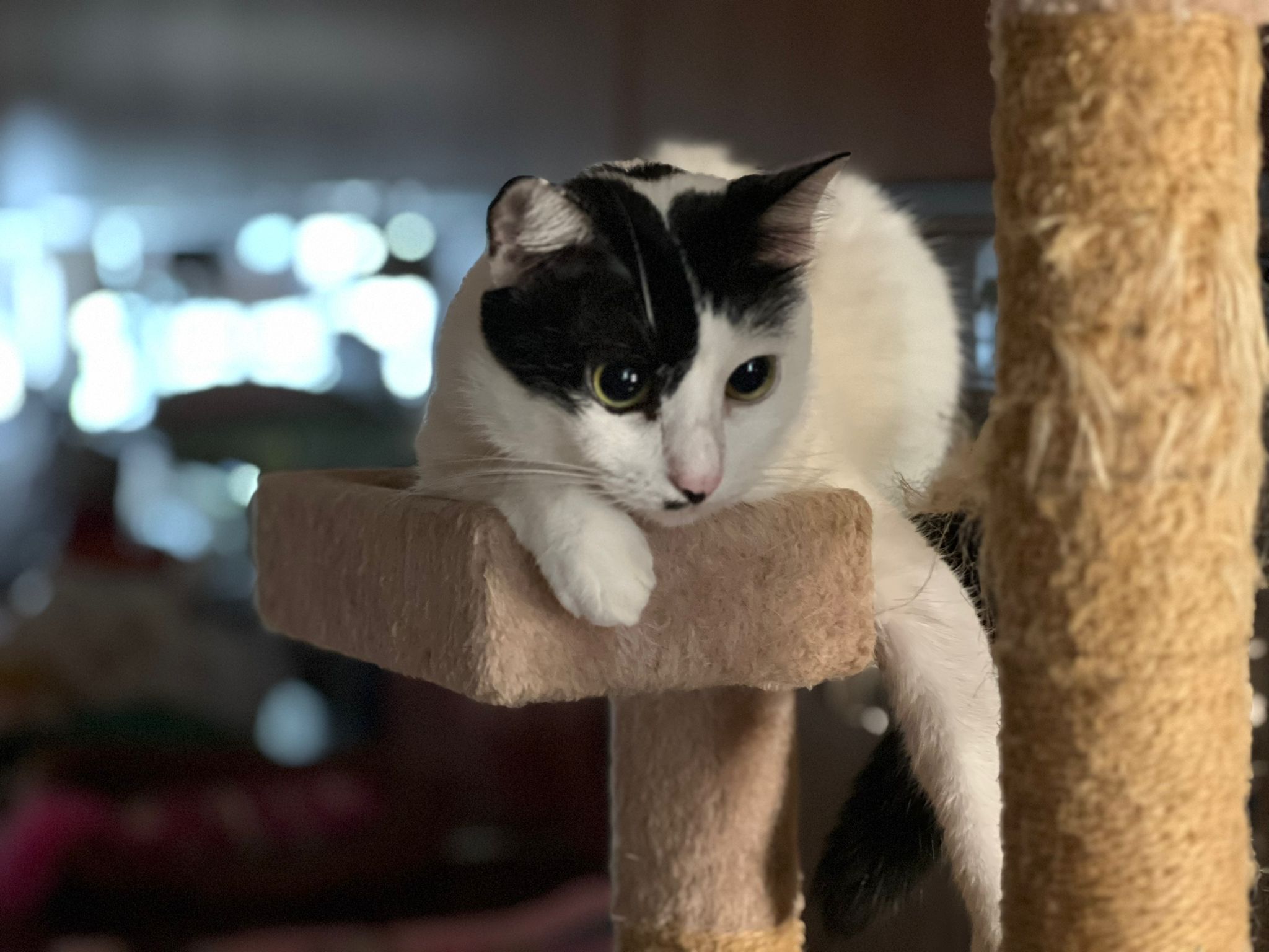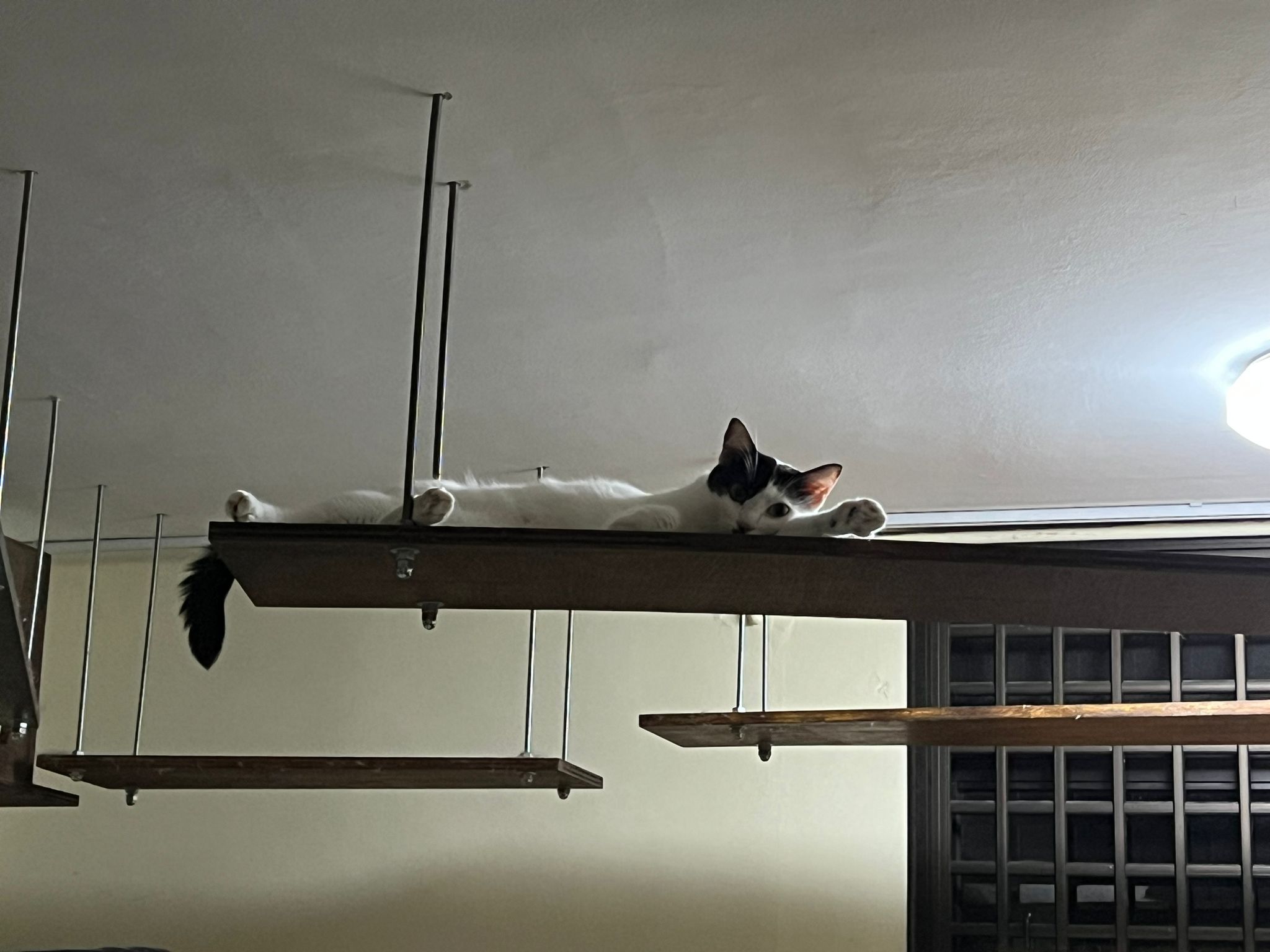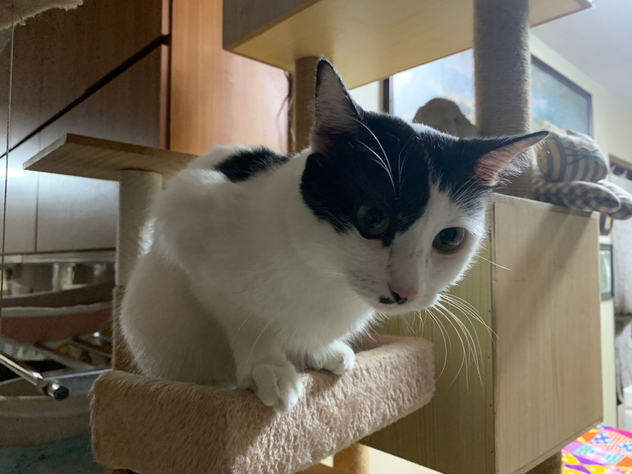 8am+: joy at the top of the expensive cat tree. I serve food and she n rufus share for a while n I wanna take video n she jump off.