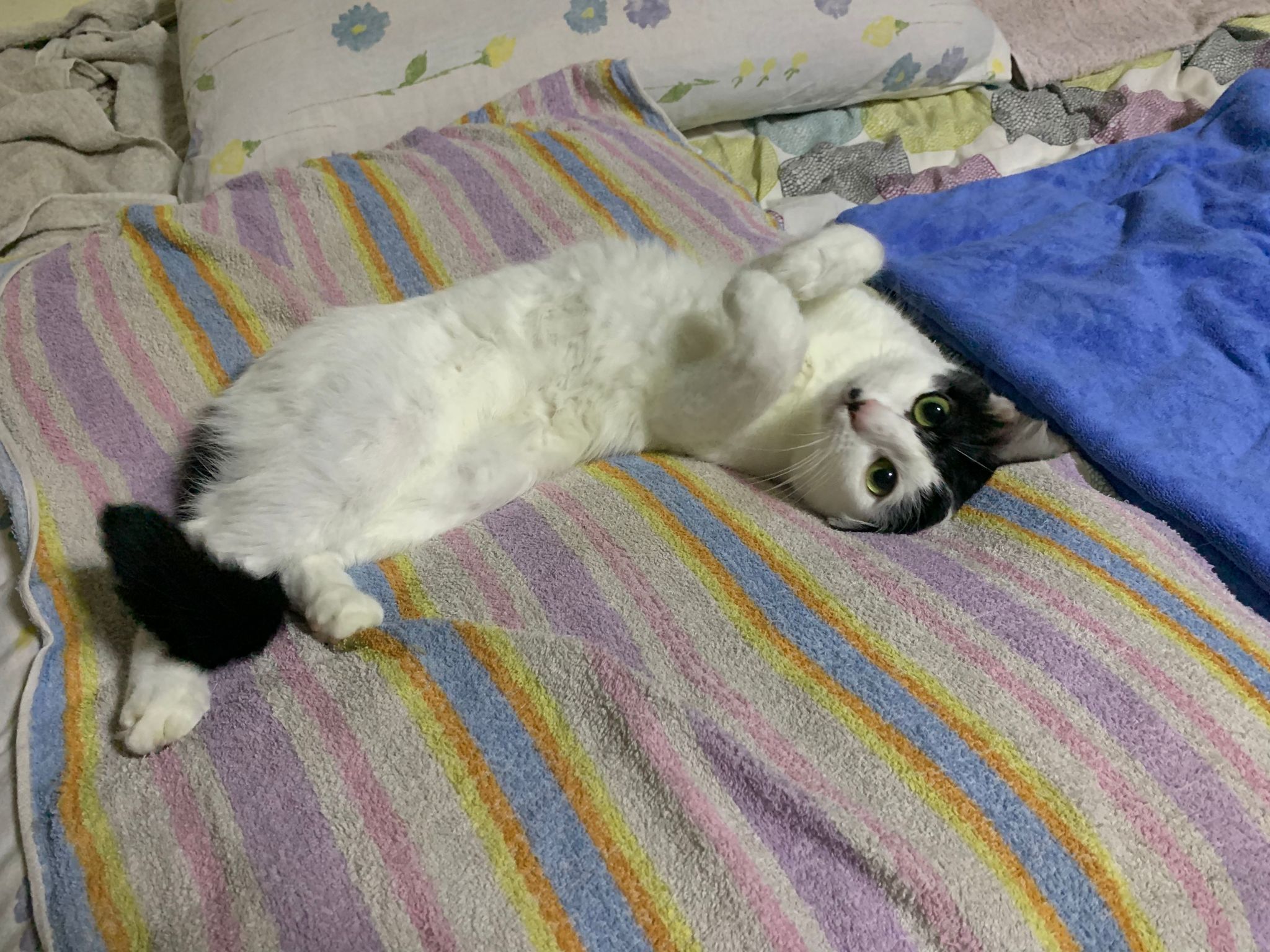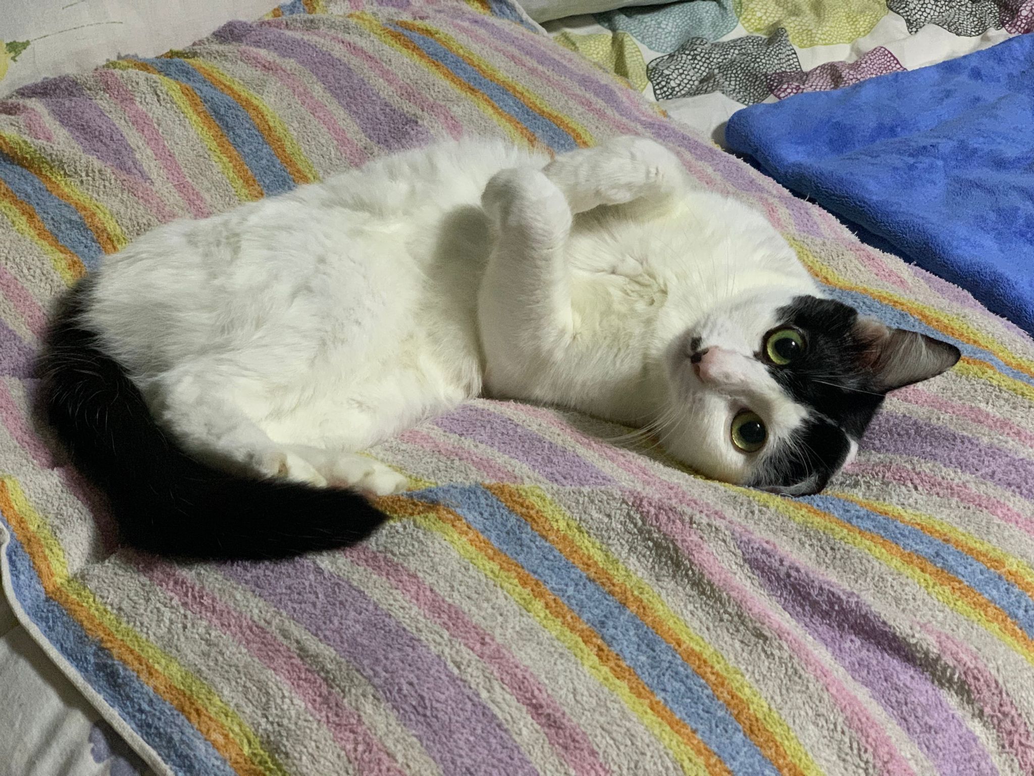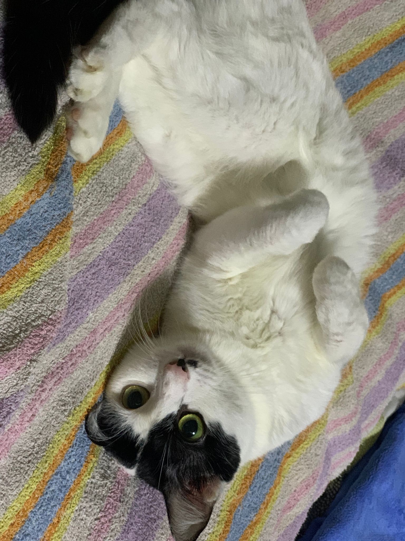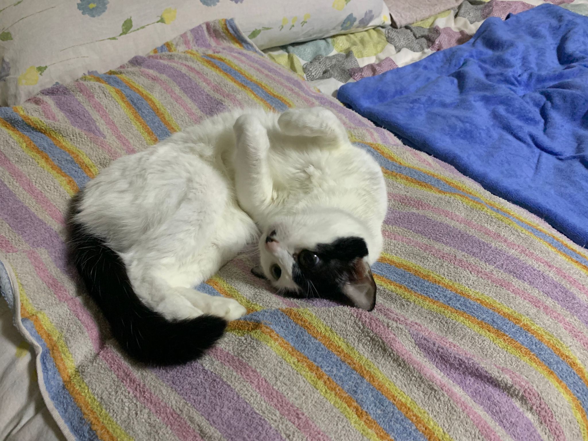 Night: didn’t see her eat. Lie on pillow to play belly rubs w me.