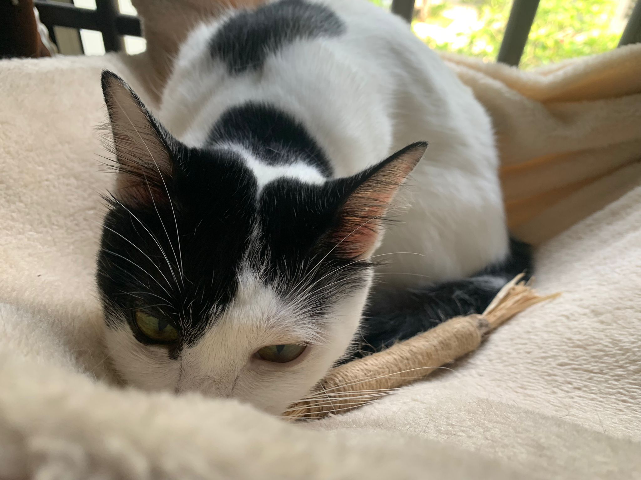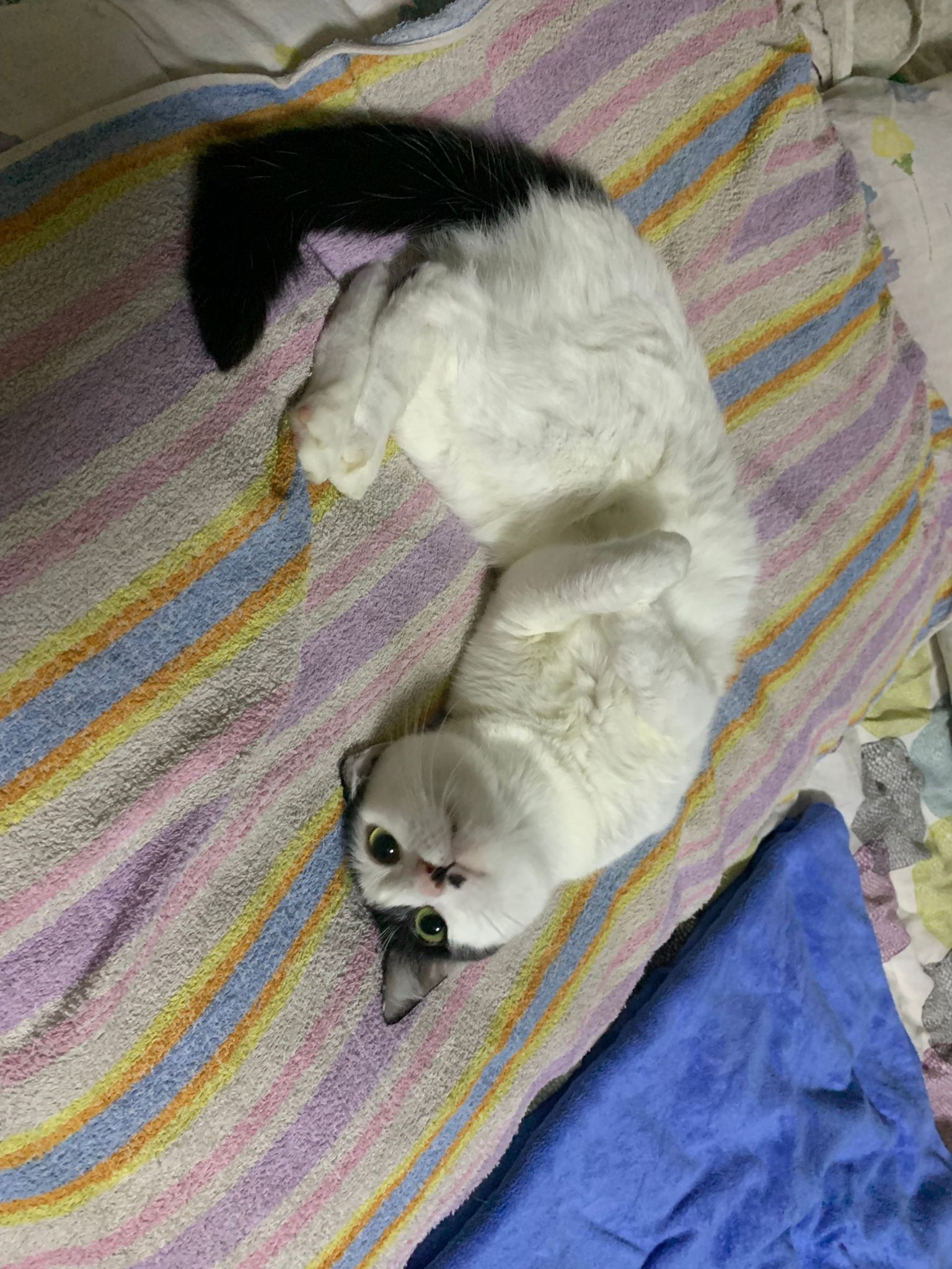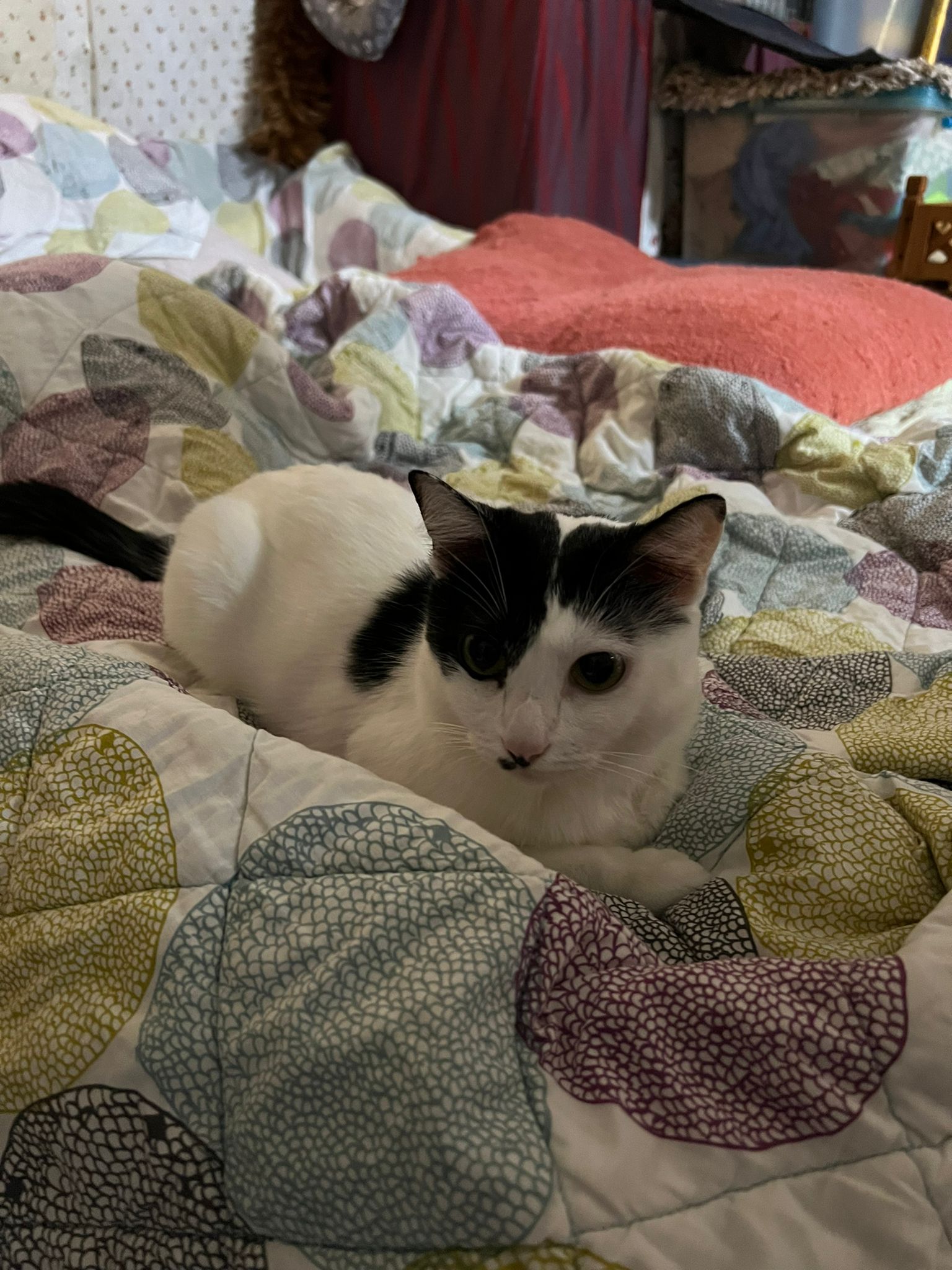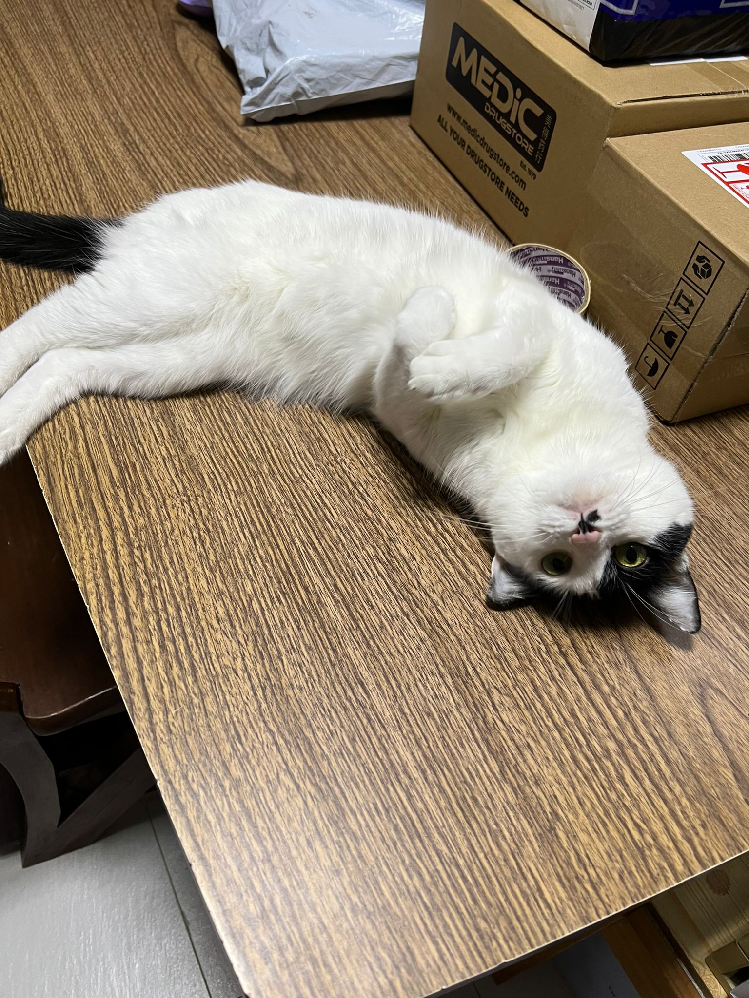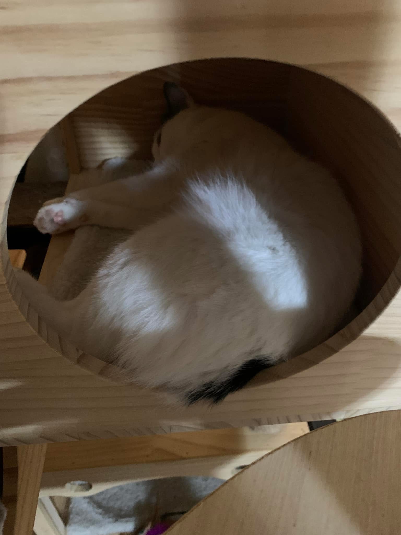 Night: didn’t see her eat. Lie on pillow to play belly rubs w me.