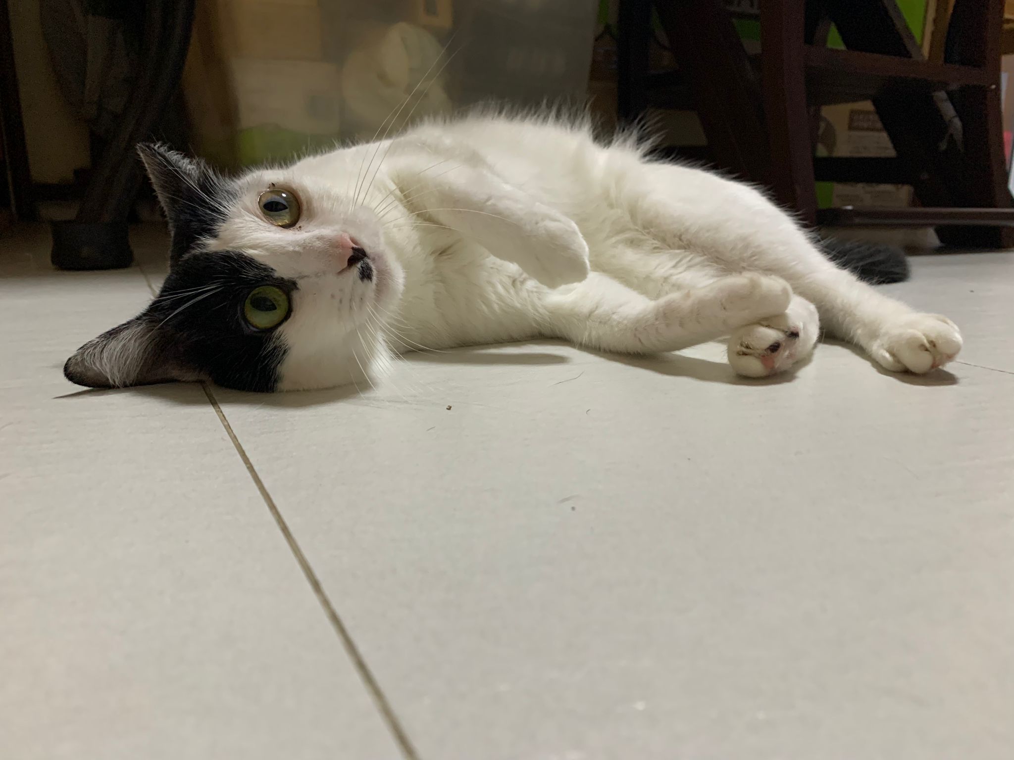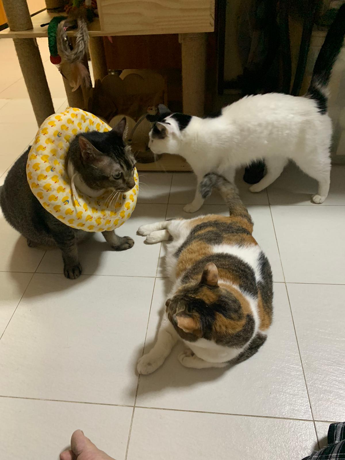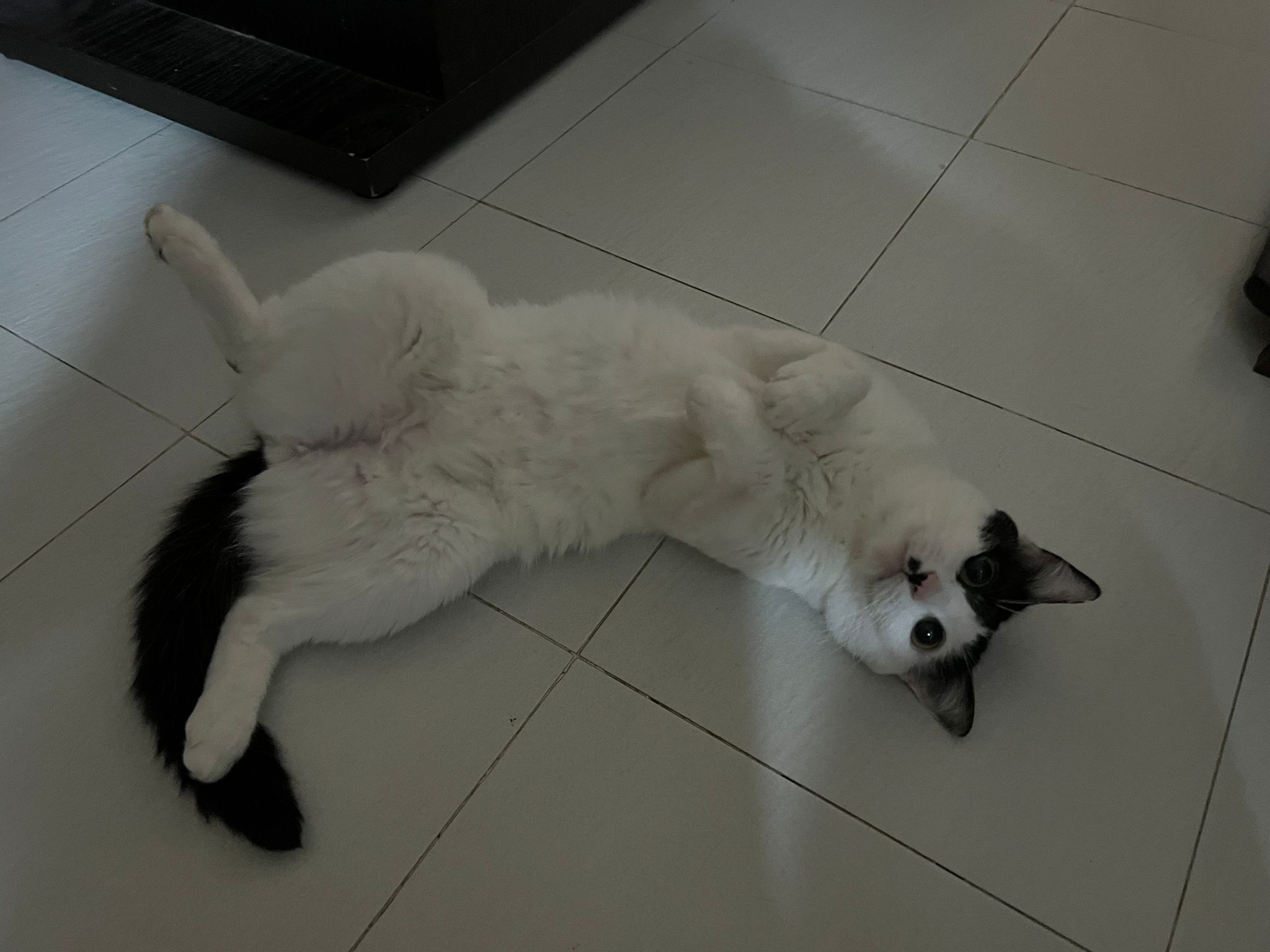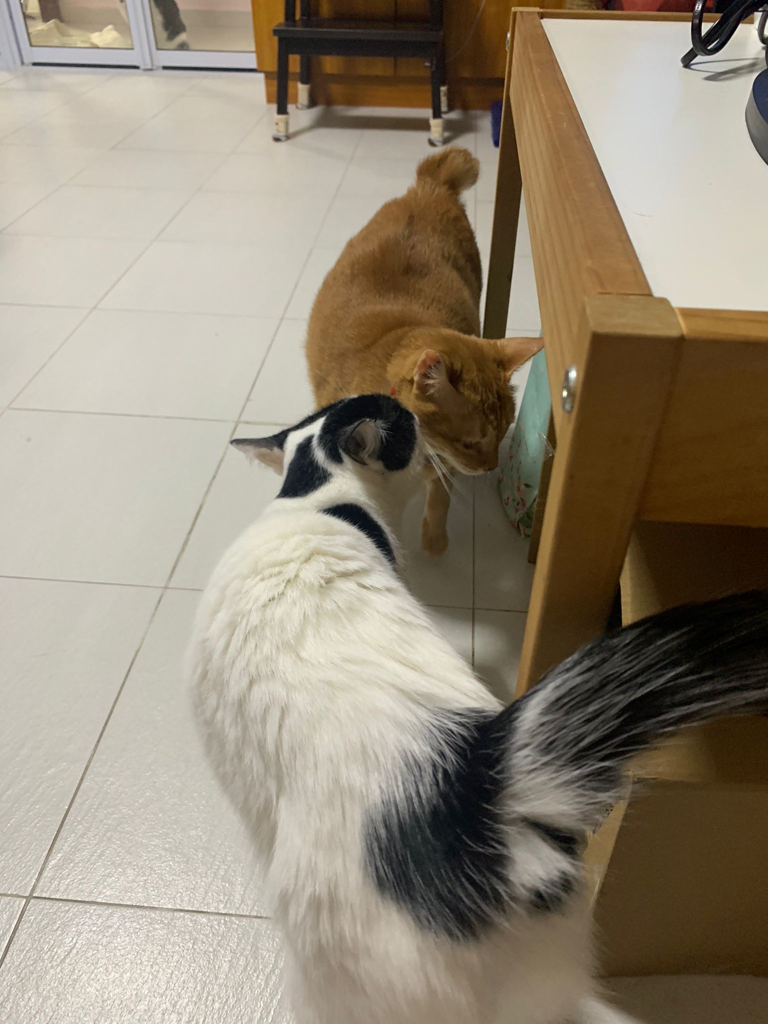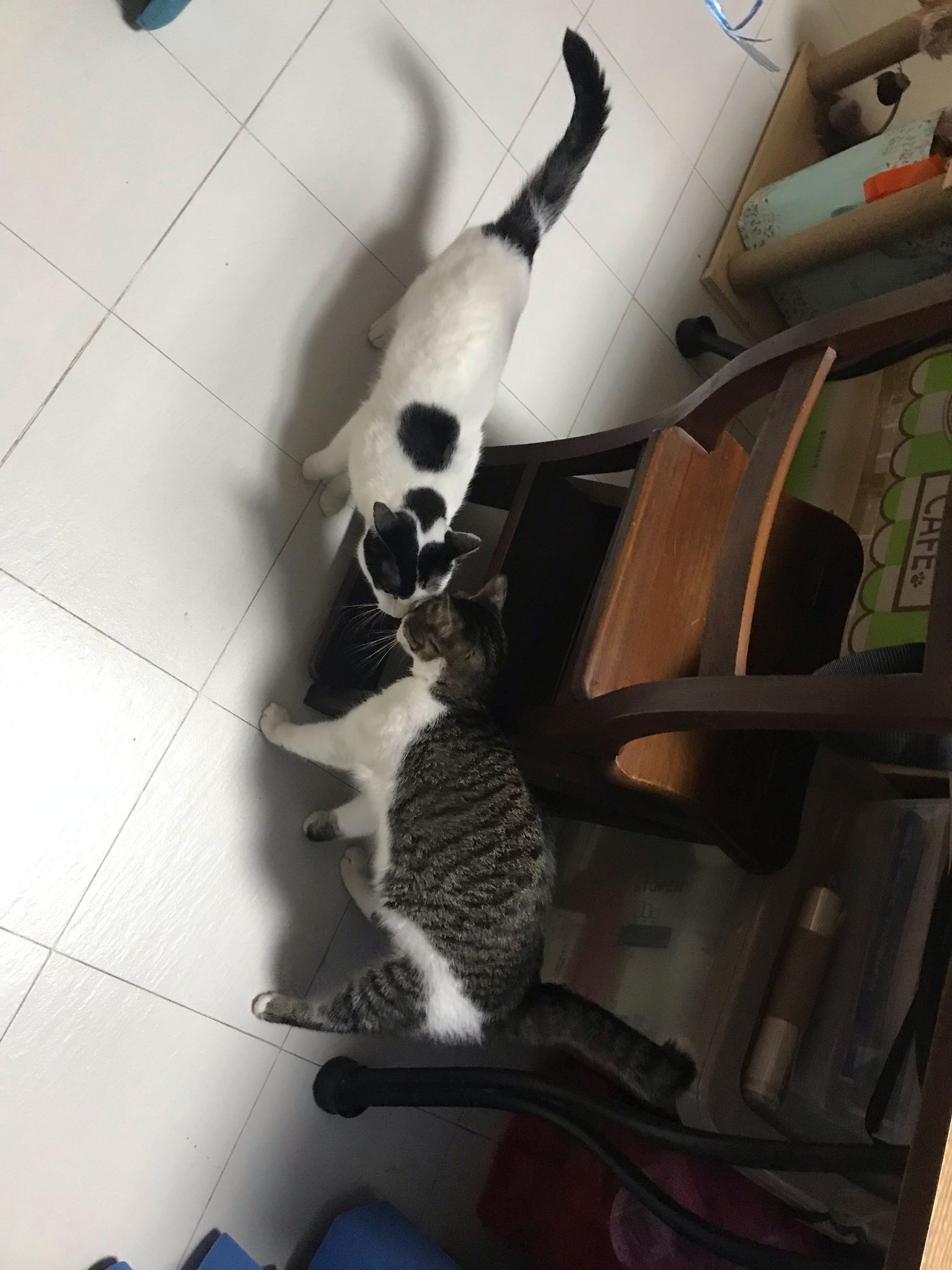 Day: jumping ard, princess meow cos I rub her belly, joy come meow meow meow at me n follow me ard for pats. Got eat.
