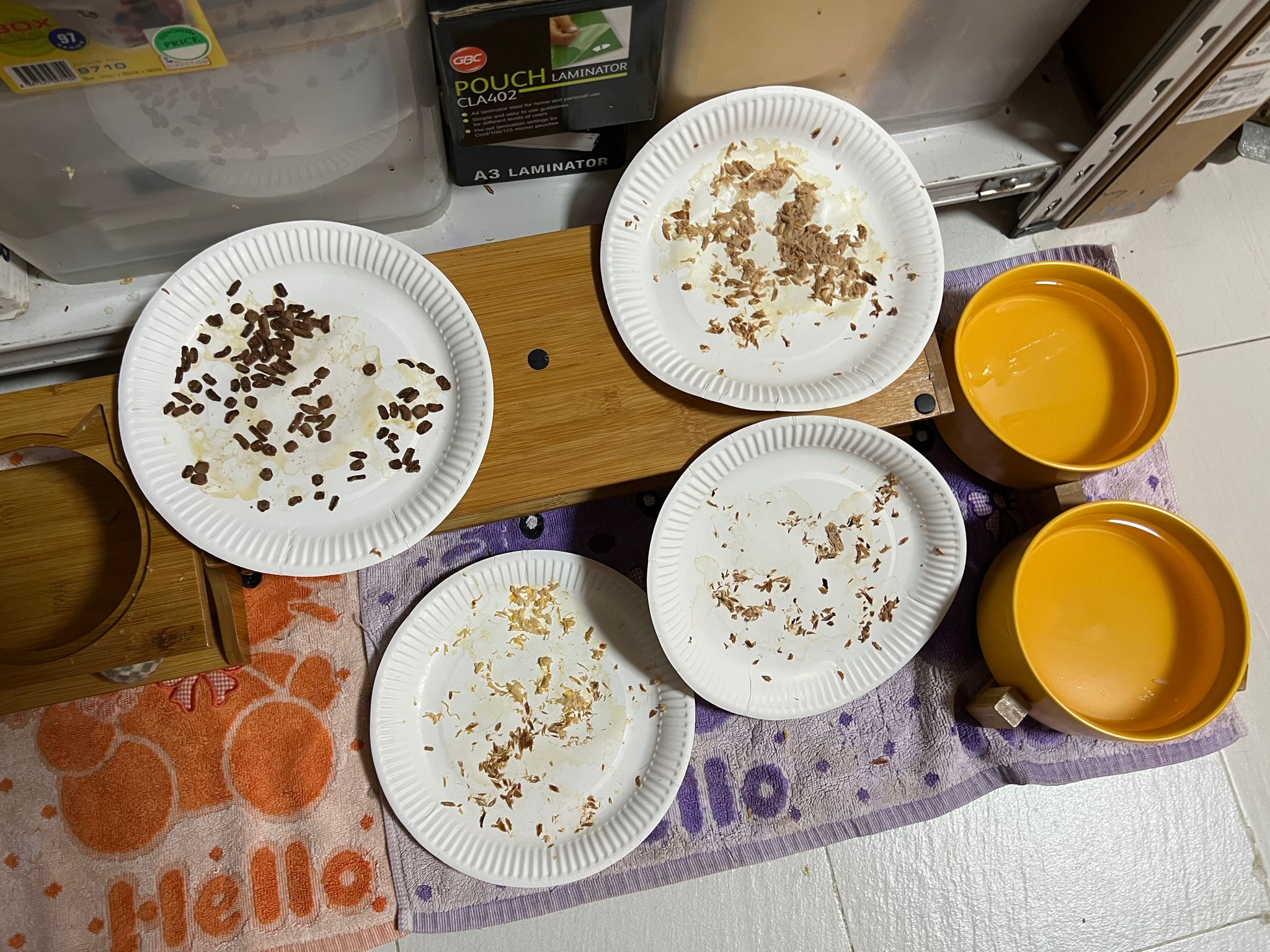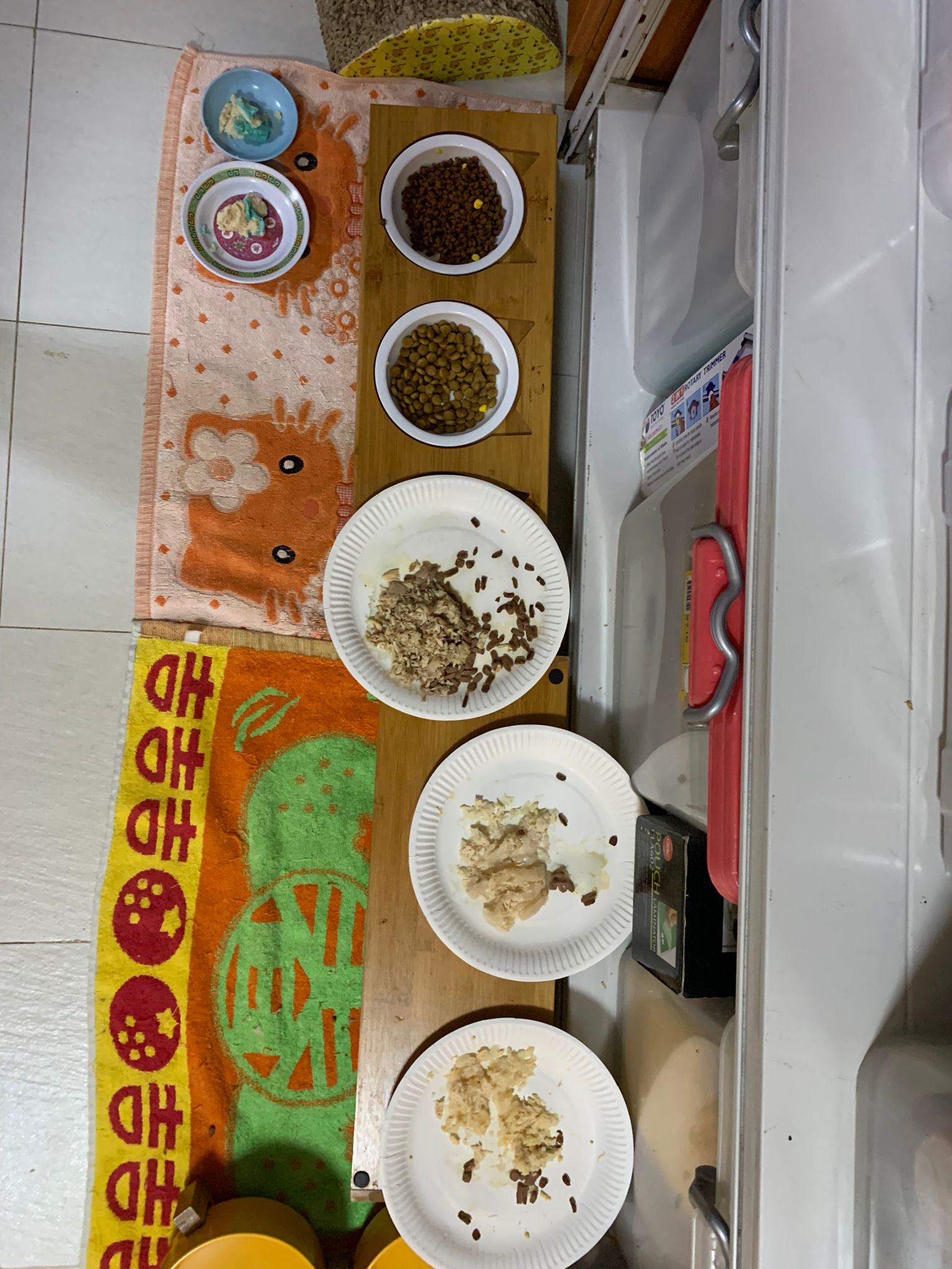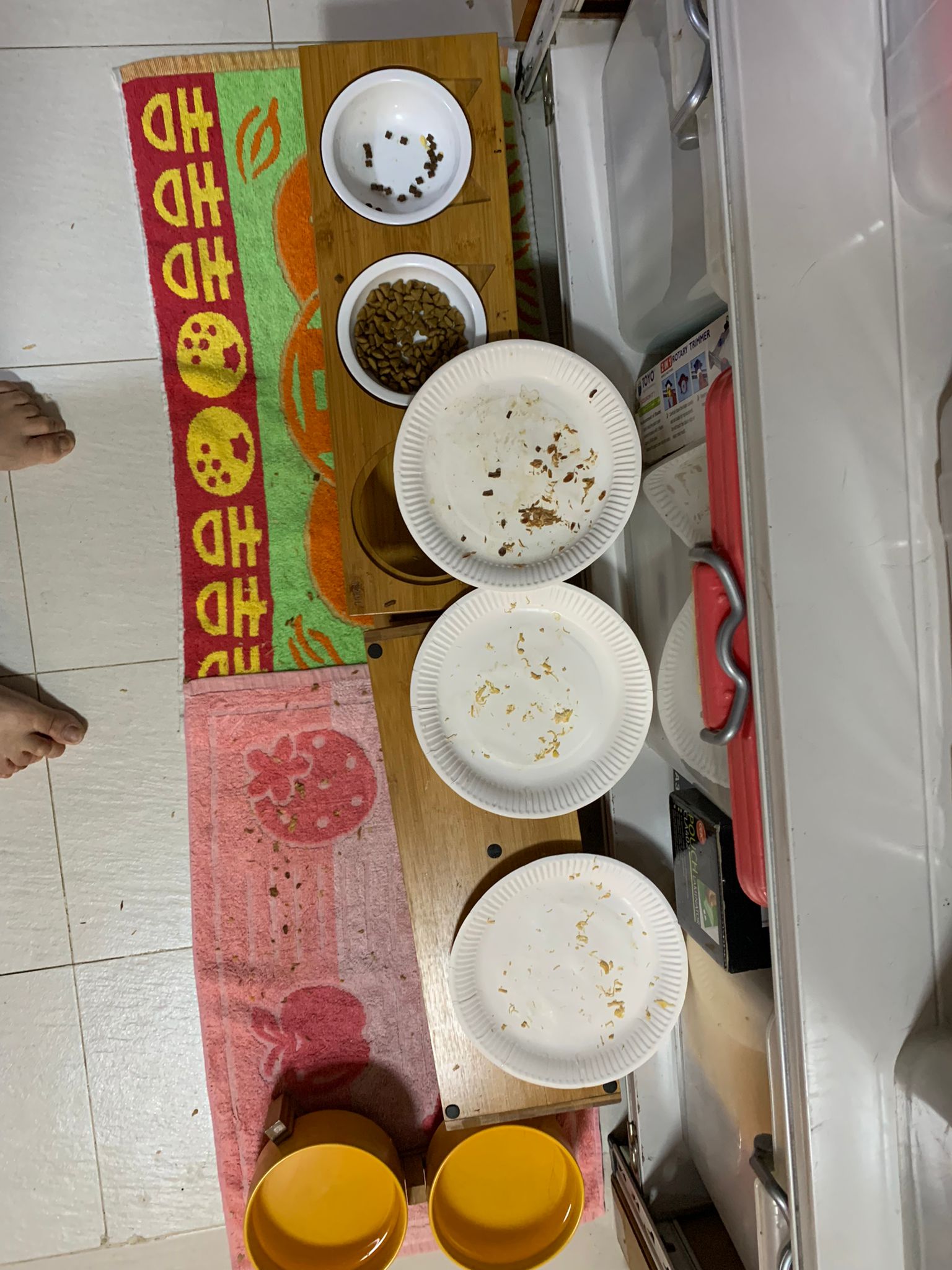 Most of their plates are empty. Polished. All 3 kibble bowls empty.