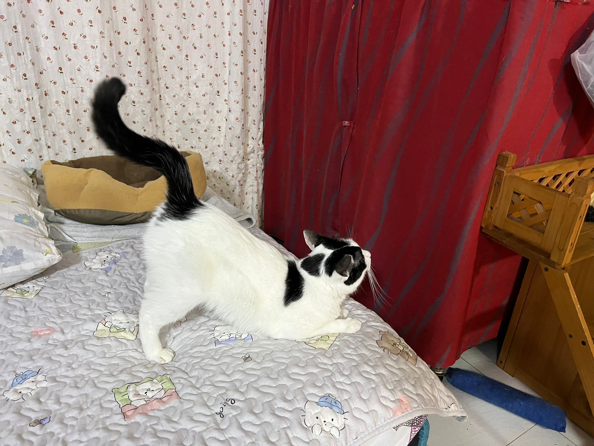 I sit down on floor wanna log a little logbook and I lean against the bed and she jump on bed to bite my hair. Bite so many times loh. I move away from bed, then she try to climb on my back. Ha