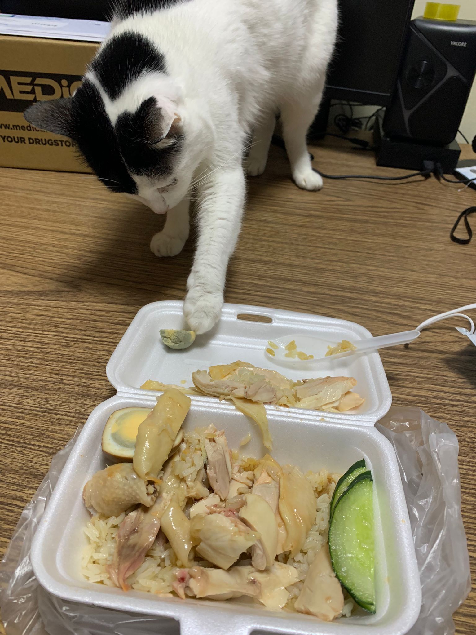 11.45am: I sit down to eat my chicken rice, wa this joy damn excited, explain to her no go, this one cannot n I say can take photo only. Ha she use her paw coop my egg yolk away. Ha … I took back. And in between she bring rufus to come n find me for chicken … they damn damn enthu. So I give them the food for good chicken fillet. She got eat. She eat a lot. And she go and finish up Princess mama one also.