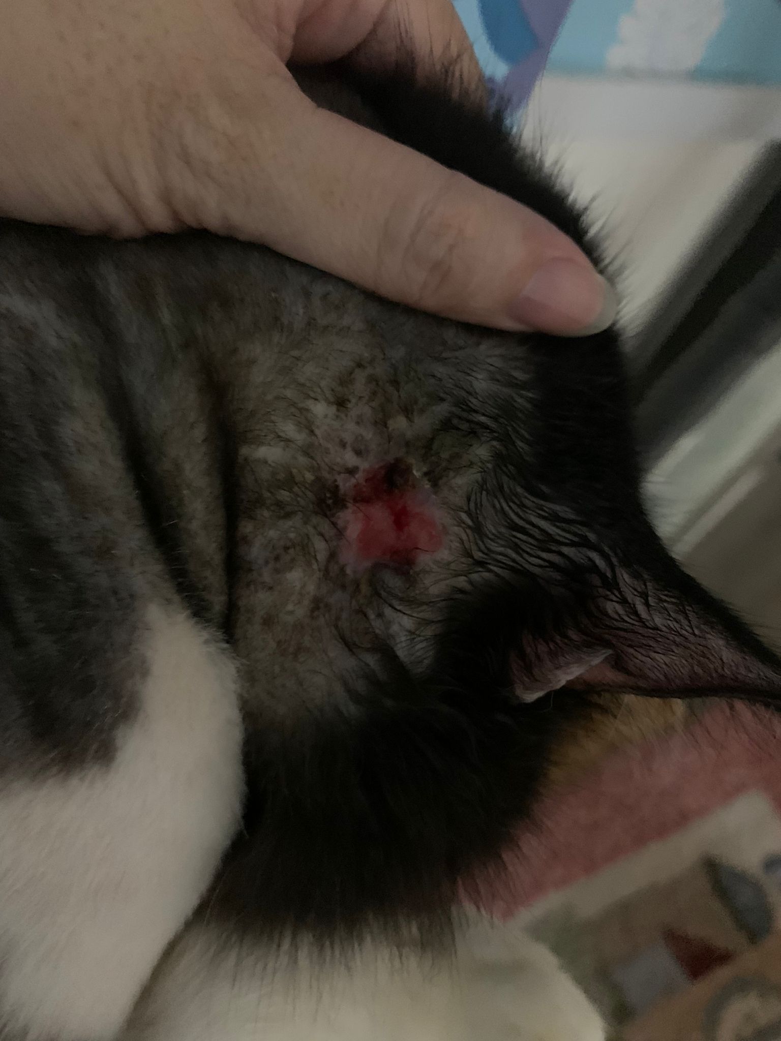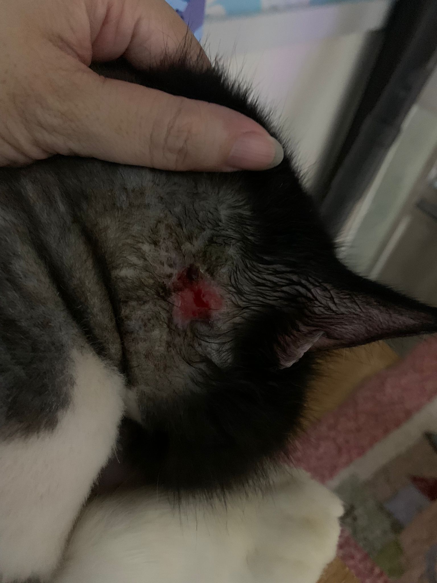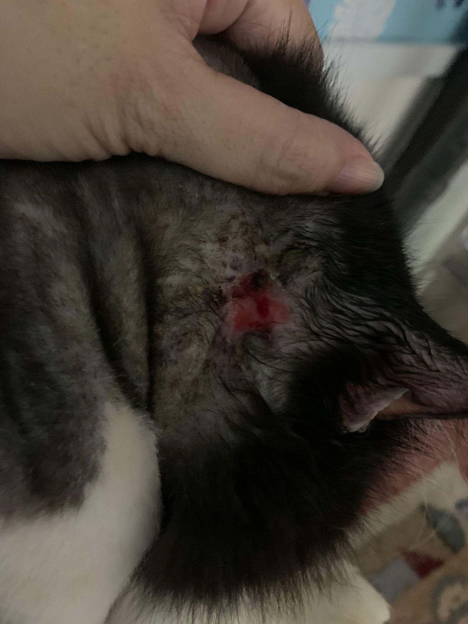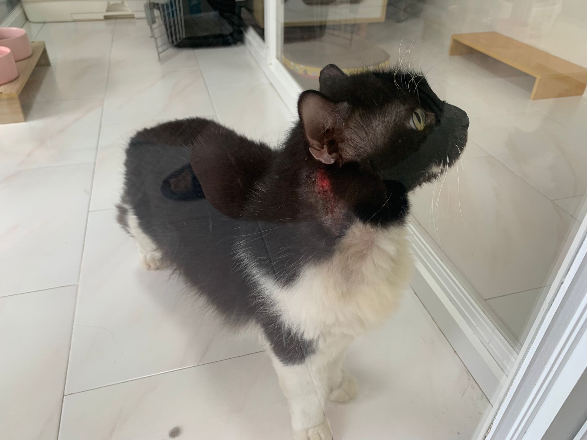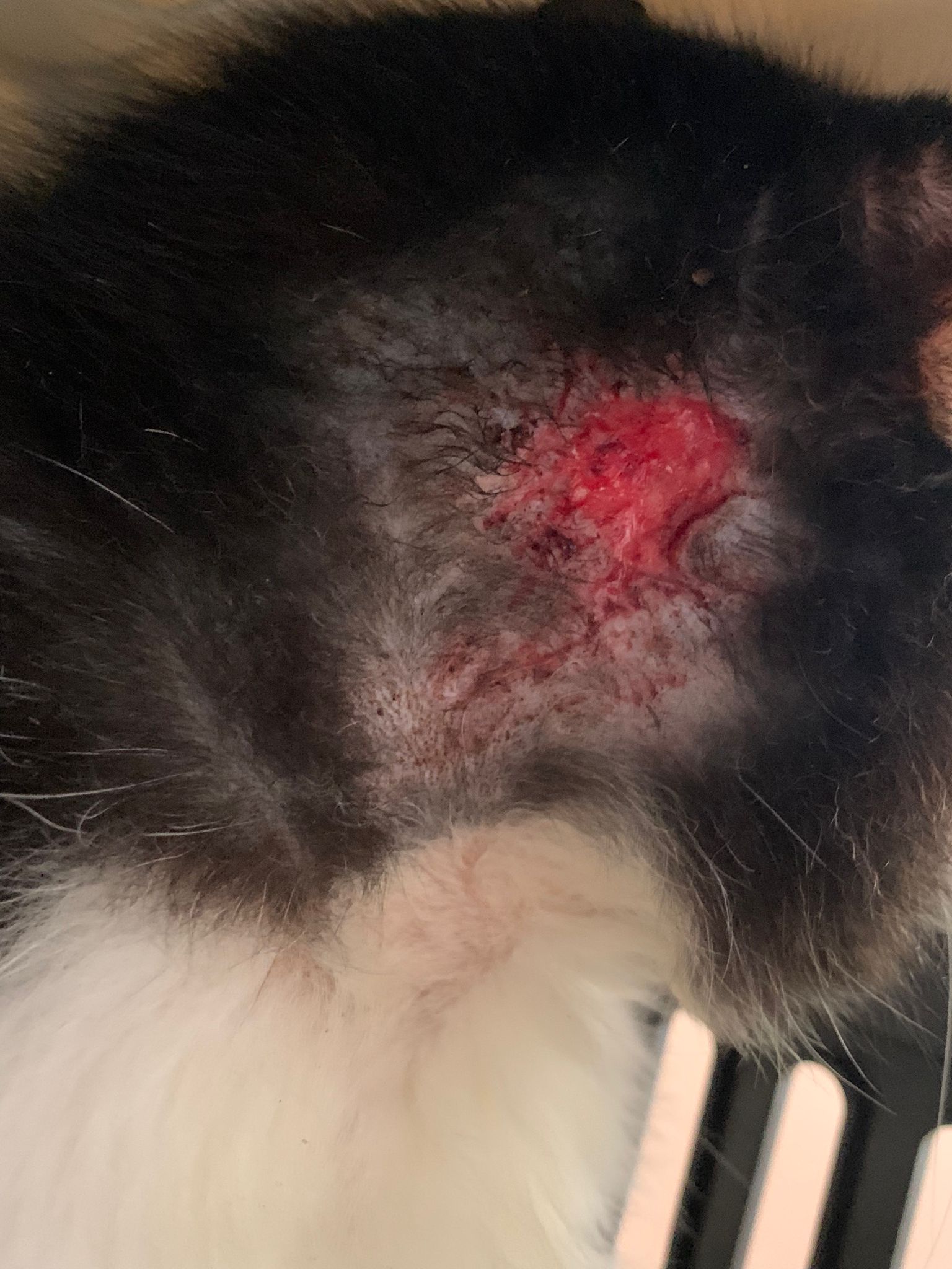 check his wound out, I clean w f10 he still ok. Will struggle but my scruff is fine. Put the ointment from clinic he will jump. Erm. I’ll consider the treatment again. His left side also same loh. Except not red. His body and head also have.